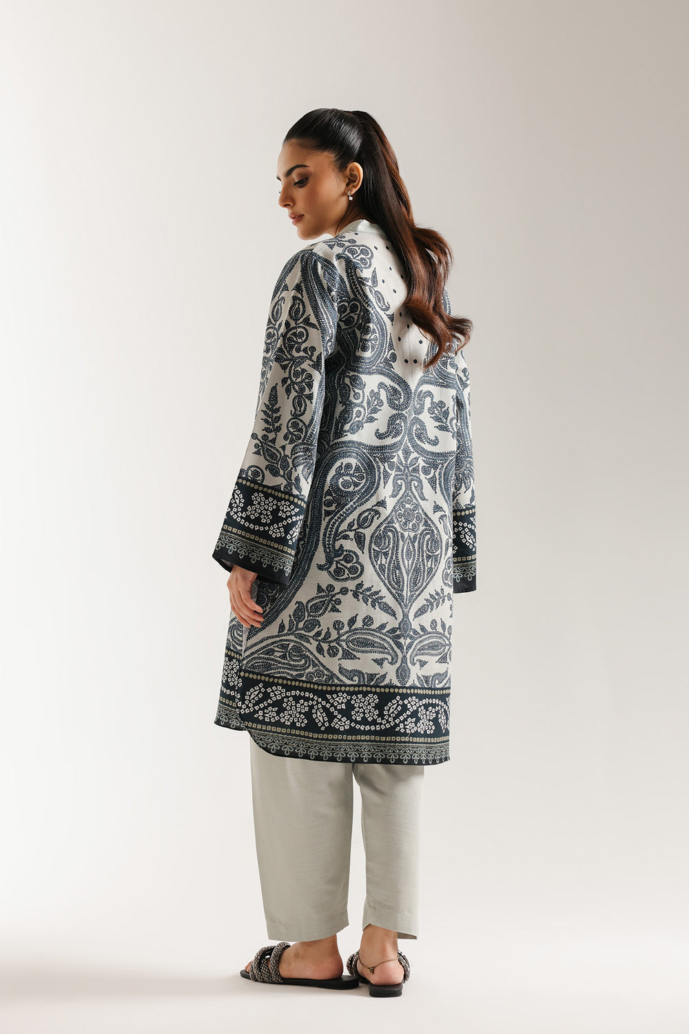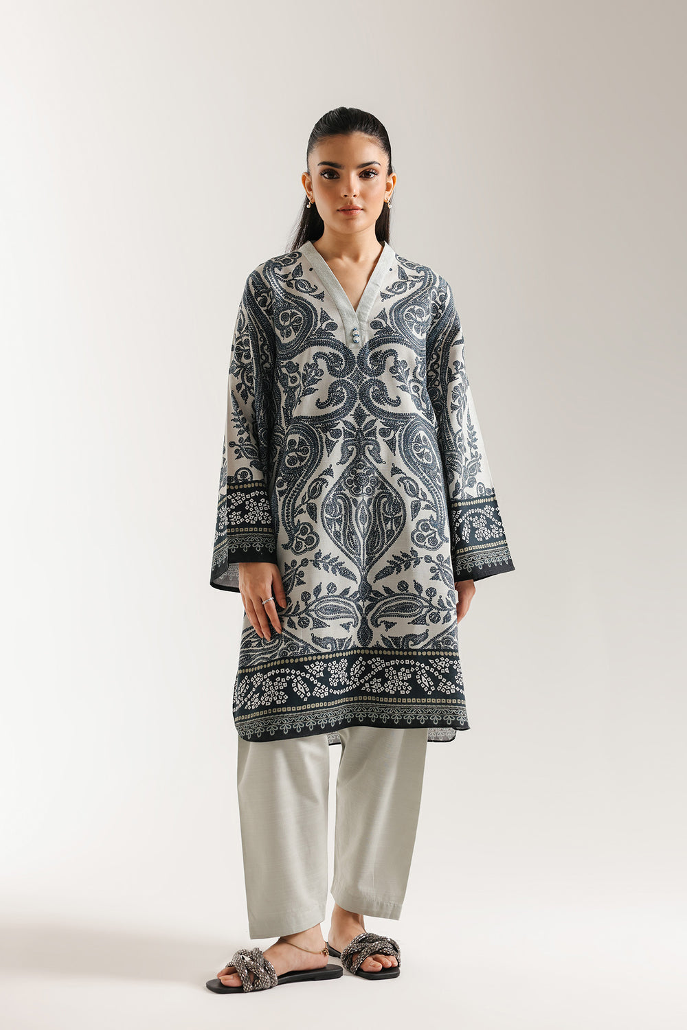Command a look of understated drama with this striking monochrome printed suit. The ensemble features a shirt in a soft white or light gray base, showcasing an intricate all-over damask and paisley print in contrasting deep navy or black. The shirt design includes, a flattering V-neckline with button accents, and wide, comfortable long sleeves, all finished with patterned borders. This bold top is paired with tailored shalwar in a solid, pale gray or white. The rich, detailed print combined with the clean silhouette makes this a sophisticated and effortlessly chic outfit for any modern woman.