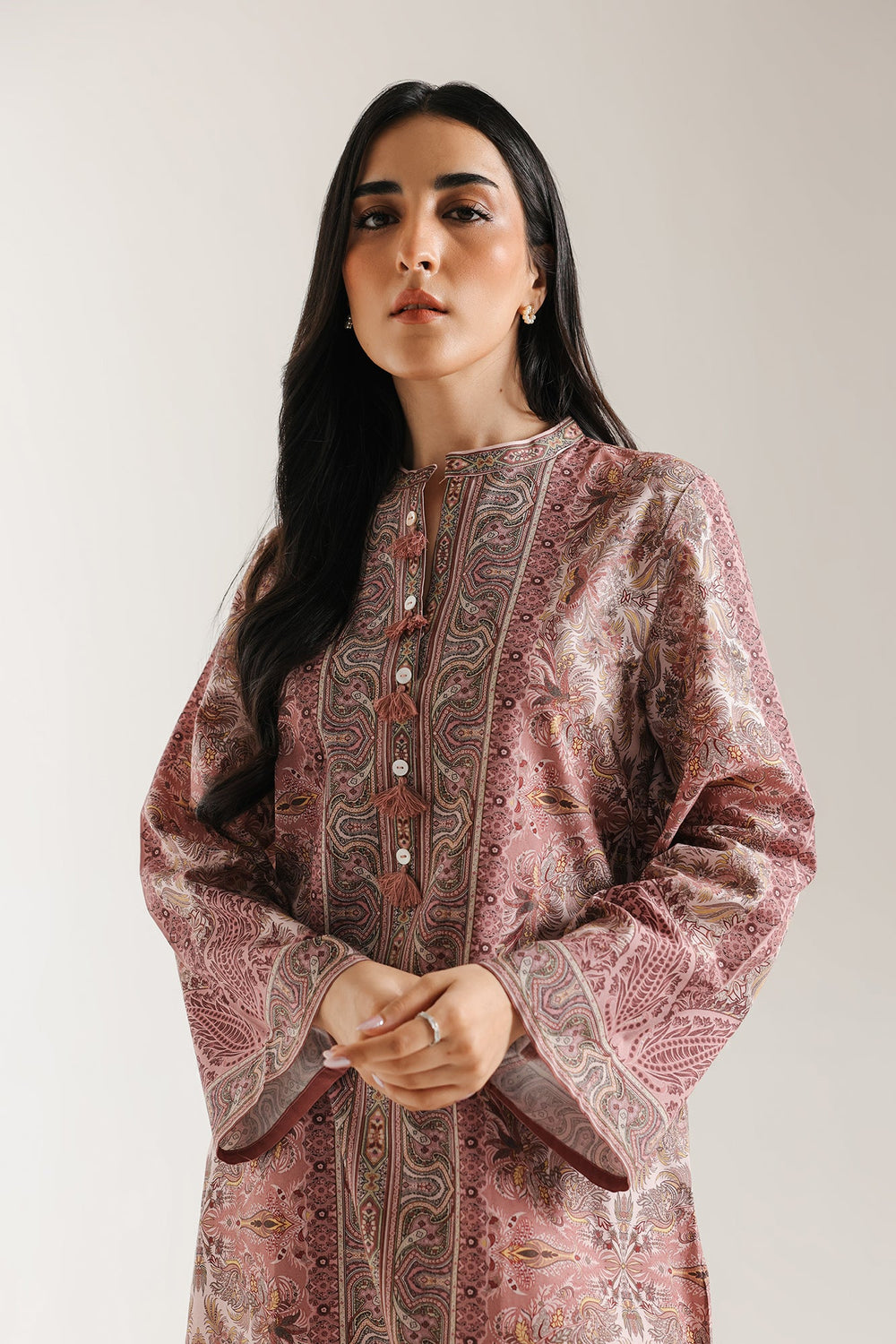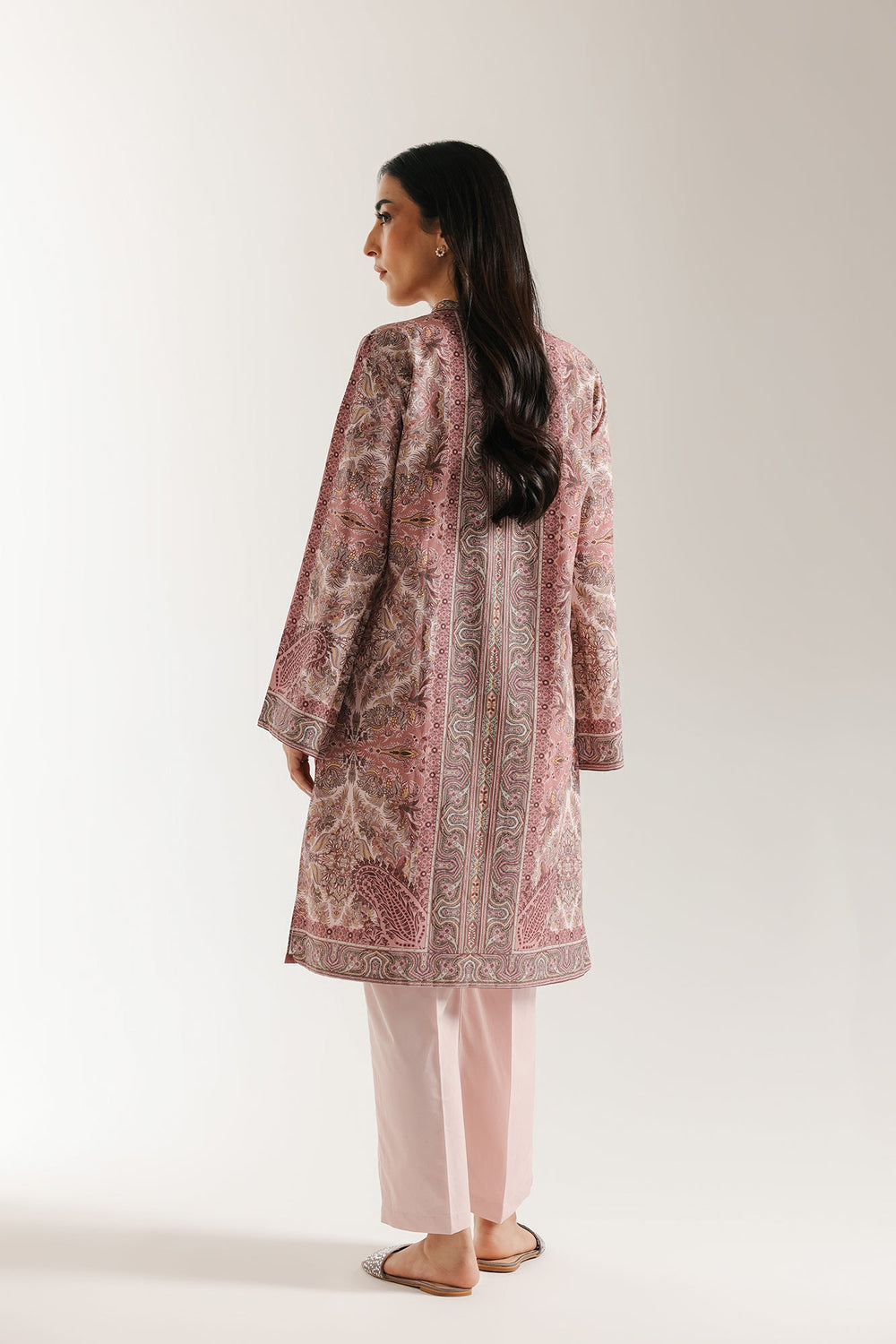 Dive into opulent, classic patterns with this gorgeous pink printed suit. The short, straight-cut kurta is adorned with a dense, detailed all-over paisley print in shades of dusty rose, deep maroon, and light beige. The design features a band collar and subtle buttoned accents , emphasizing the traditional motif. The ensemble is perfectly balanced by coordinating culotte fit trouser in a solid, pale pink hue, creating a polished, comfortable, and richly textured traditional look.