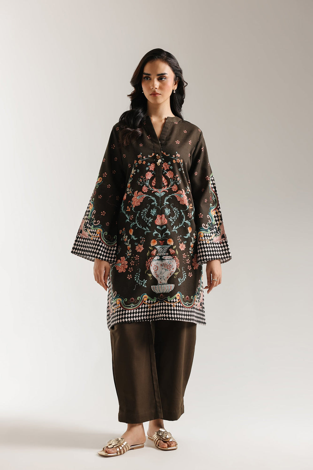Step out in sophisticated artistry with this deep brown printed suit. The ensemble features a shirt in a rich, dark brown fabric. It is adorned with a beautiful, ornate multi-colored print centered around a traditional floral vase motif, flanked by stylized flowers in shades of pink, coral, and teal. The hem and wide sleeves are finished with a striking black and white checkered geometric border. This visually rich shirt is paired with solid dark brown shalwar, allowing the print to truly stand out.