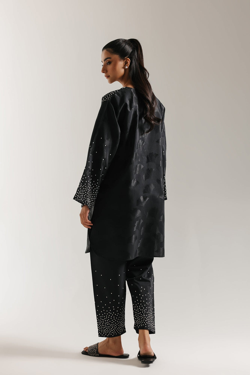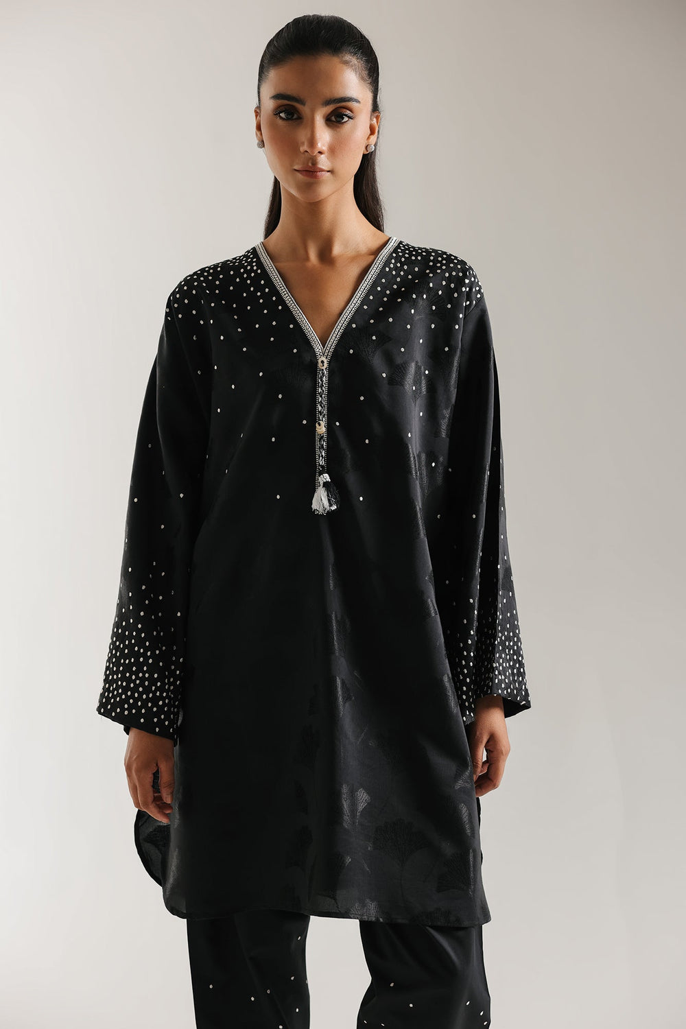 Radiate modern sophistication in this dramatic black suit. This striking ensemble features a short-length kurti and matching shalwar, both crafted in a rich black fabric. The shirt has a subtle tonal, jacquard-style floral pattern woven throughout the textile. It is beautifully contrasted with white print that highlights the V-neckline and cascades down the shoulders and onto the wide, relaxed sleeves. The coordinating shalwar feature the same dazzling print clustered near the hem, creating a cohesive, night-ready look with striking texture and sparkle.