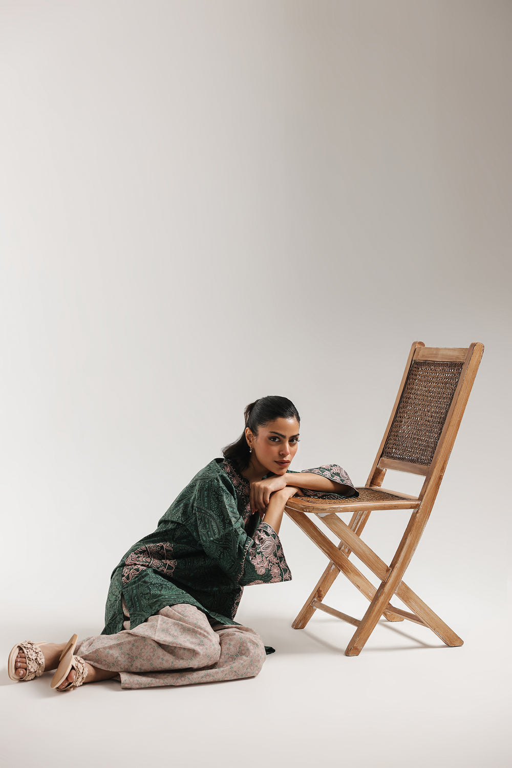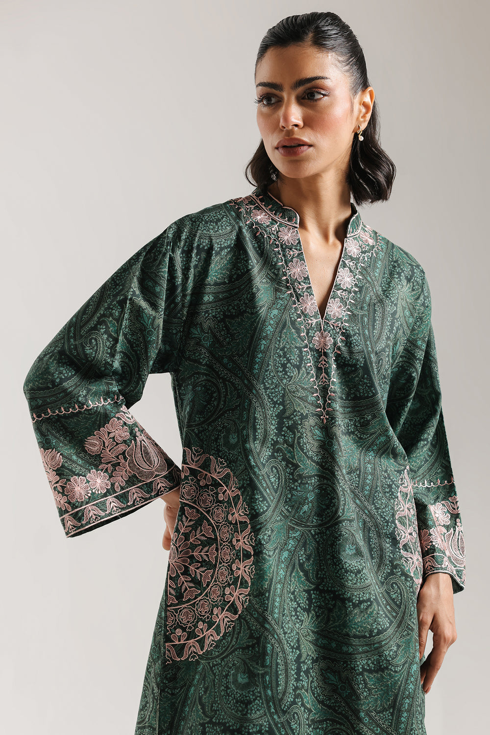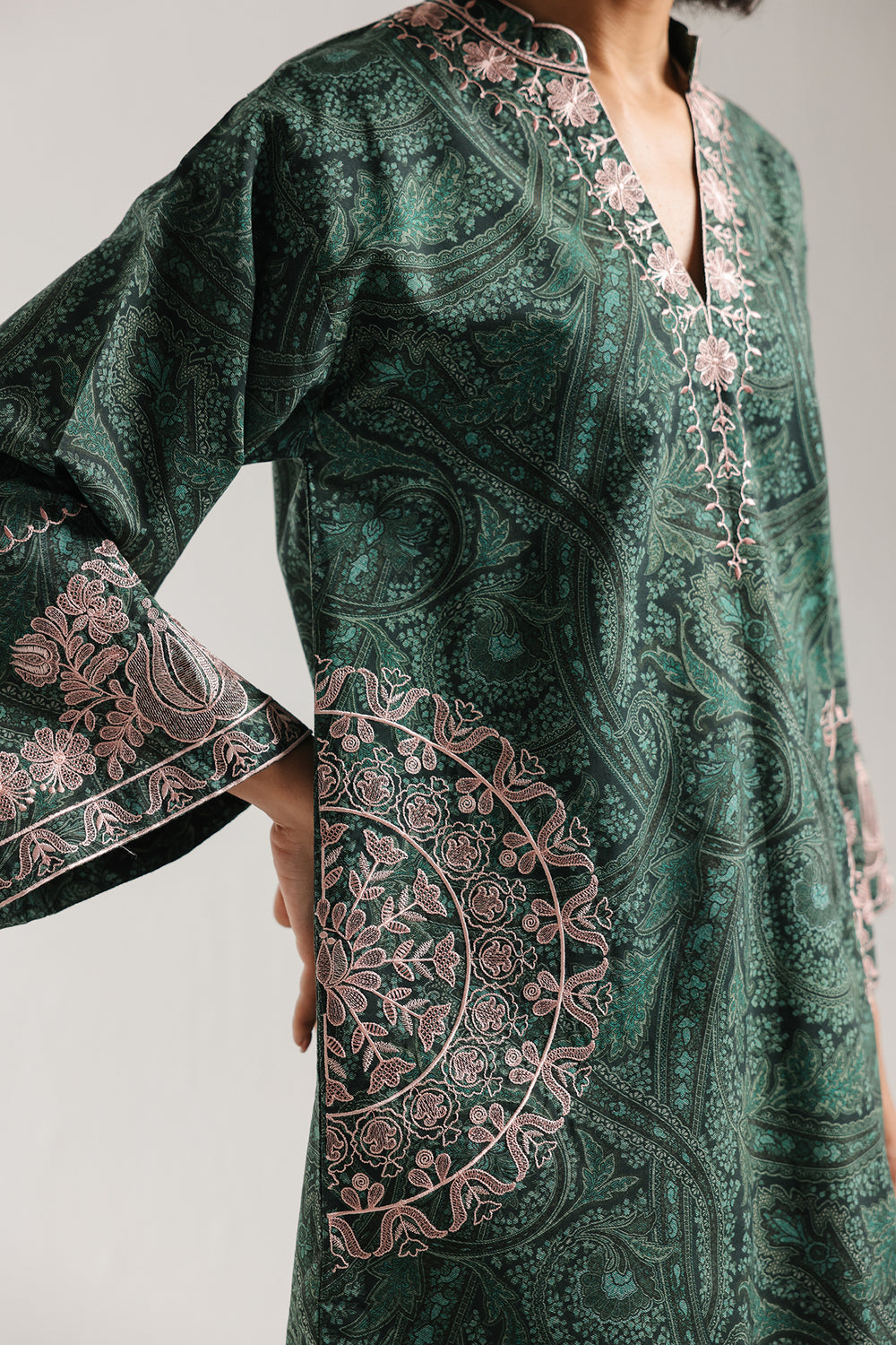 Indulge in the deep, enchanting hues of this two-piece embroidered suit. The shirt is rendered in a rich forest green, featuring a complex, tonal paisley print that adds a layer of mystical depth. The neckline is delicately traced with soft pink floral embroidery that leads to a refined V-split. Dramatic, wide sleeves are accented with oversized pink botanical motifs, mirroring the intricate threadwork at the hem. Paired with contrasting dusty rose shalwar featuring a subtle geometric print, this ensemble is the perfect balance of bold color and delicate detail—ideal for an evening of sophisticated celebration.