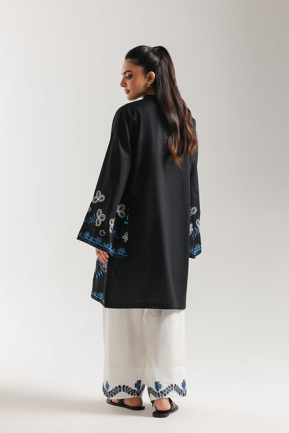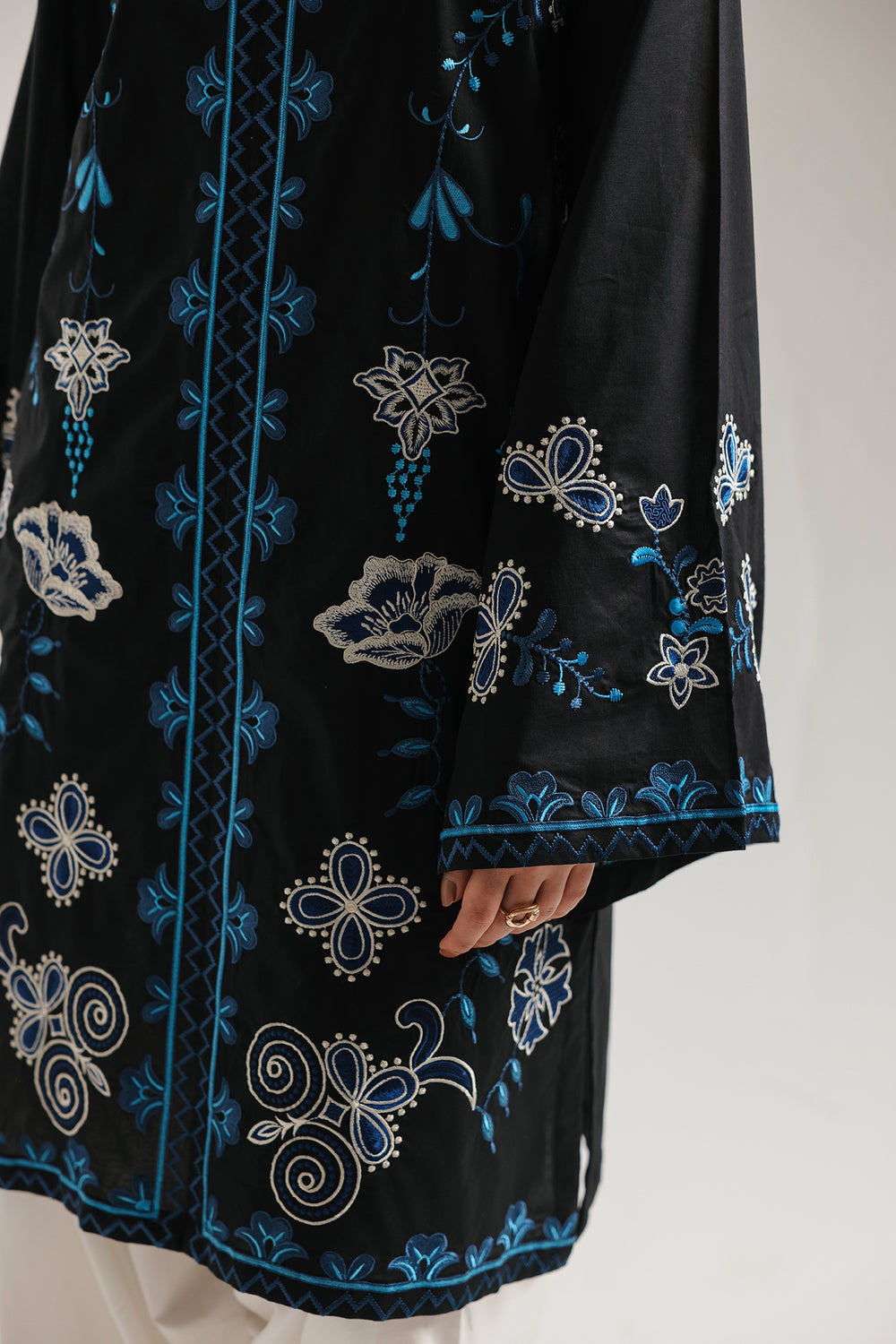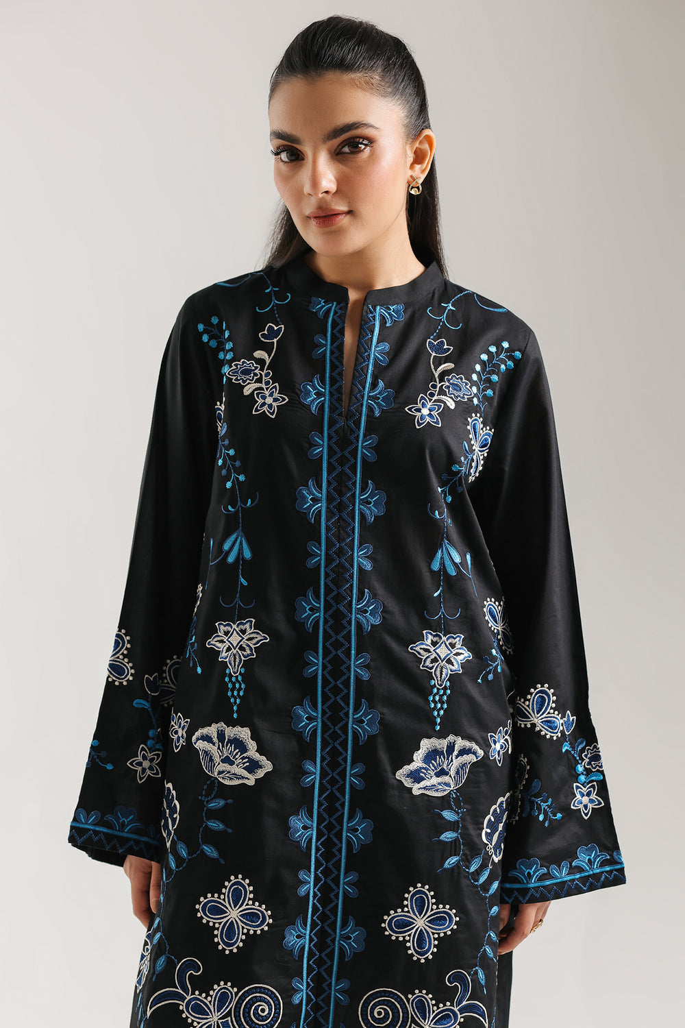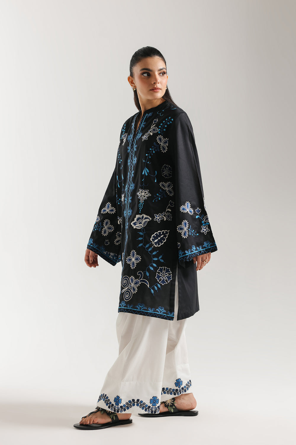 Elevate your formal wardrobe with this striking black two-piece embroidered suit, a perfect marriage of dramatic contrast and intricate artistry. The shirt is crafted from a smooth, obsidian-colored fabric that provides a bold foundation for the vibrant electric blue and silver-white embroidery. The design features a sophisticated high-neck ban collar and a central vertical embroidery band that elongates the silhouette. Whimsical floral and paisley motifs are scattered across the bodice and wide, statement sleeves, creating a rich, textured look. To complete the ensemble, the suit features contrasting ivory farshi shalwar with a beautifully detailed blue floral border at the hem, ensuring a cohesive and high-end finish.