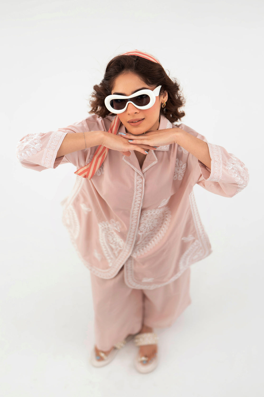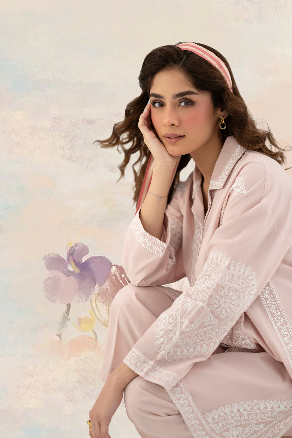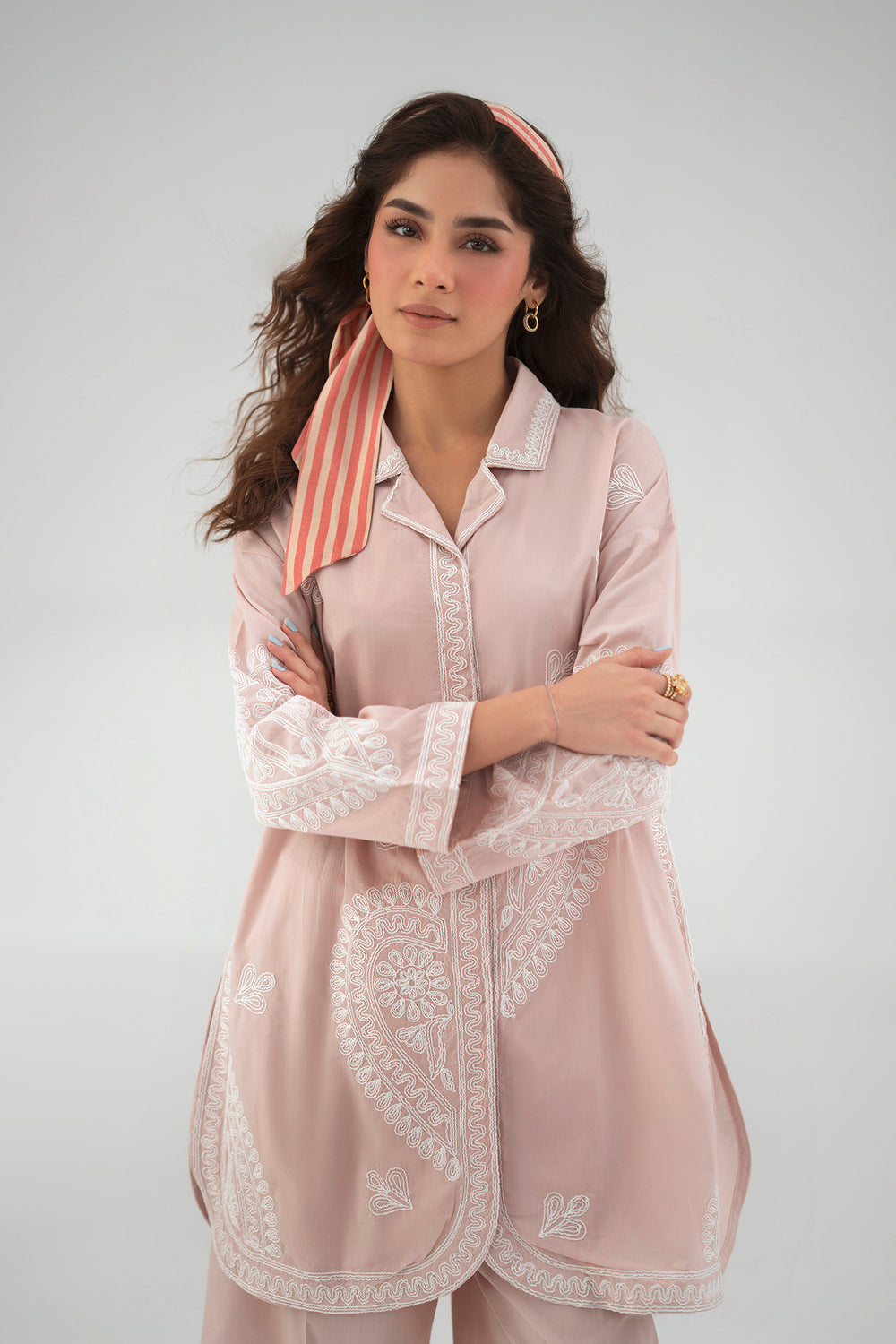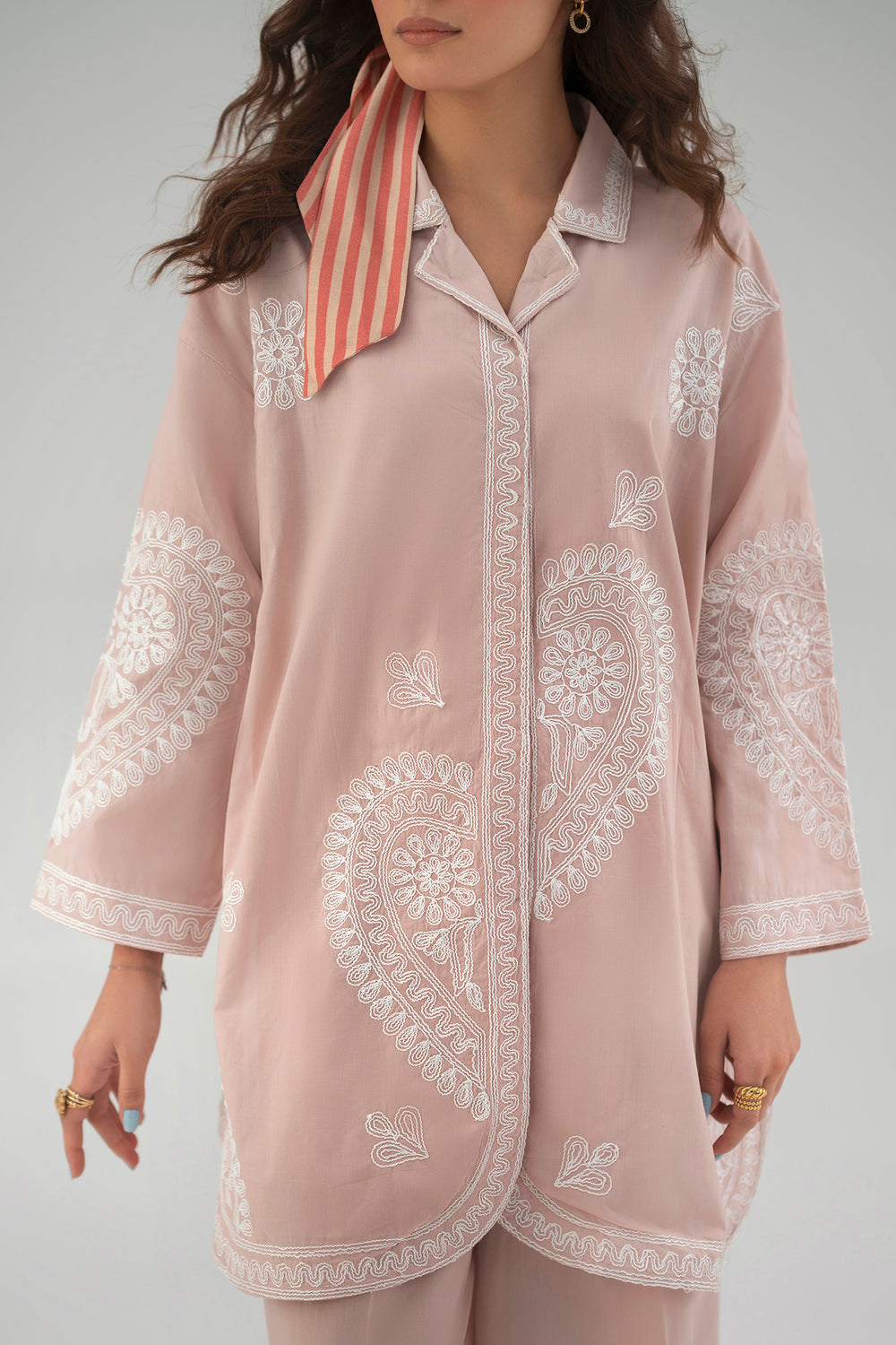 Step into a world of soft sophistication with this blush pink embroidered suit. The button-down tunic showcases oversized paisley motifs in delicate white threadwork, framed by a gracefully curved hem. Paired with matching wide-leg trousers, this ensemble offers a chic, relaxed fit that blends modern style with timeless charm.