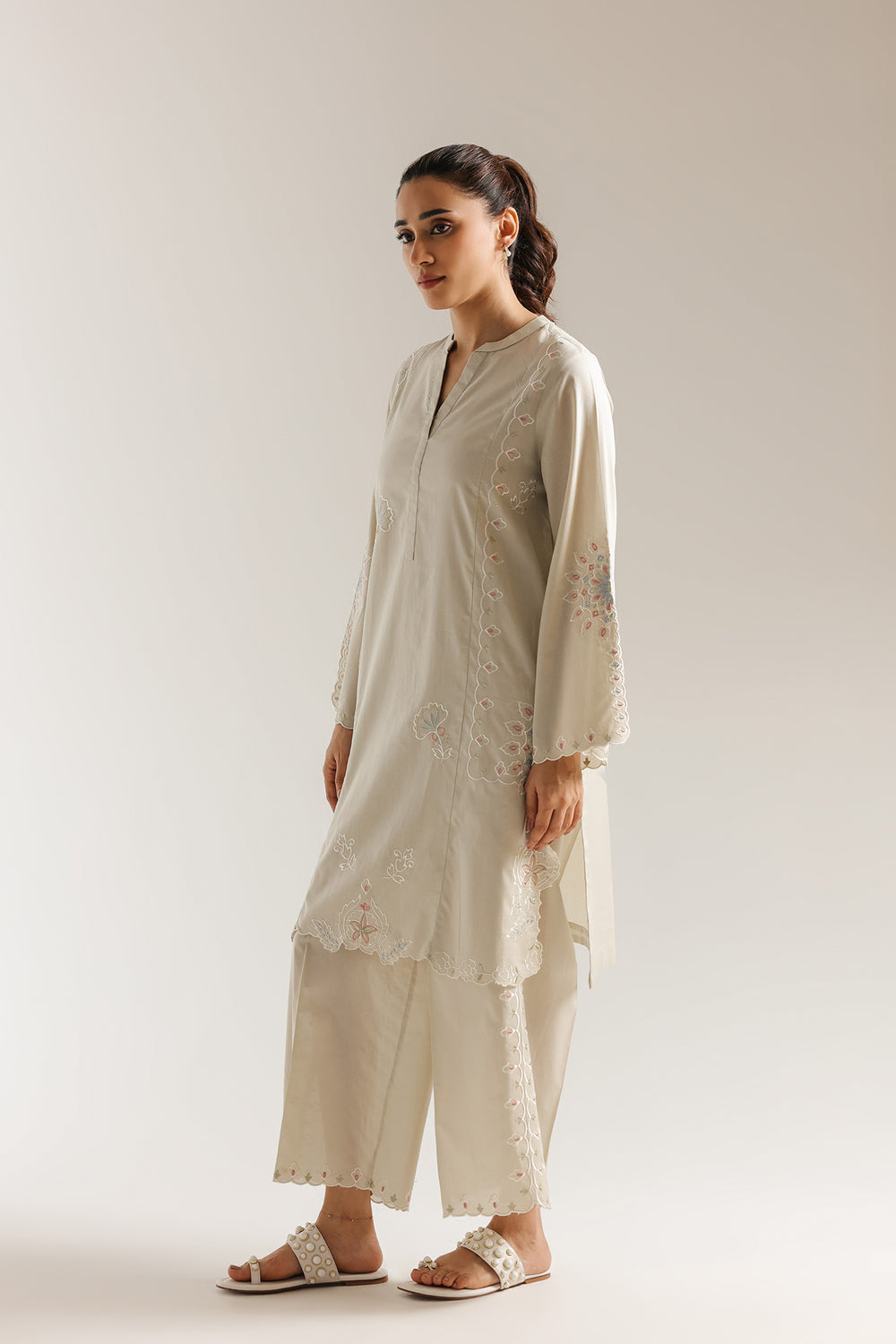 This stunning two-piece embroidered suit exudes understated elegance with its soft, neutral palette and meticulous detailing. The long-line tunic features a clean band collar and a subtle V-neckline, beautifully accented by delicate floral embroidery scattered across the sleeves and bodice. The hemline is finished with exquisite scalloped edges and intricate needlework, adding a touch of artisanal charm to the silhouette. Paired with matching wide-leg trouser that feature coordinating embroidered border, this ensemble offers a cohesive and polished look. The lightweight fabric and relaxed fit ensure all-day comfort without sacrificing style. Whether you are heading to a brunch or a casual evening gathering, this outfit is a timeless addition to any wardrobe, blending classic aesthetics with modern refinement.