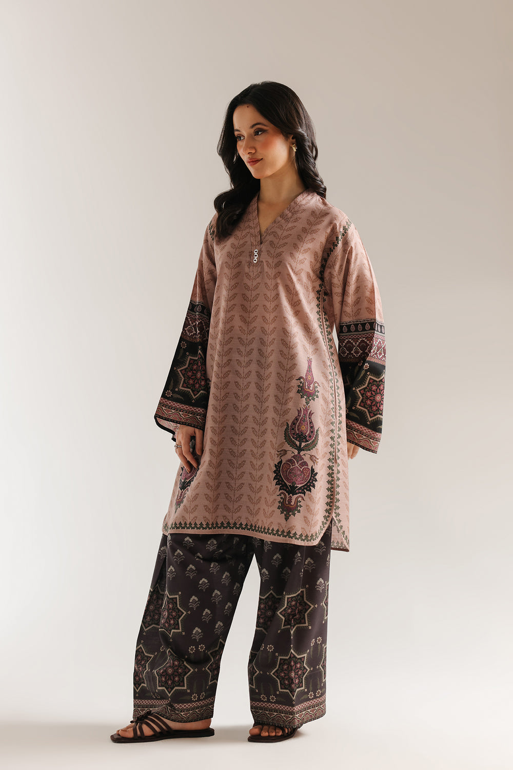 Radiate effortless charm with this stunning two-piece printed suit, a perfect fusion of classic grace and modern flair. The mauve-toned tunic features a sophisticated V-neckline with delicate button detailing and dramatic flared sleeves. A subtle, all-over leaf pattern breathes life into the premium fabric, while bold, oversized floral motifs anchor the hem for a striking visual finish. It is masterfully paired with contrasting dark plum shalwar showcasing an intricate geometric and floral print. This versatile ensemble is the definitive choice for stylish daytime gatherings or elegant summer afternoons.