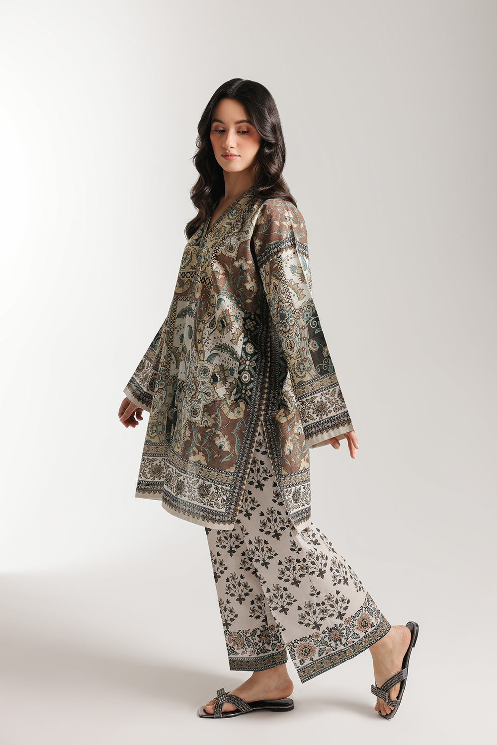 Capture a rich, vintage-inspired aesthetic with this two-piece printed suit in a warm bronze and earth-toned palette. The shirt features an intricate patchwork of traditional motifs, including scrolling florals and ornate paisley borders that create a layered, artisanal effect. Designed with a modern V-neckline and wide, relaxed sleeves, the tunic is finished with a structured graphic border at the hem for a clean silhouette. The ensemble is perfectly coordinated with off-white trousers featuring a repeating dark botanical print and a matching ornate border at the ankles. This set offers a sophisticated blend of heritage patterns and contemporary tailoring, ideal for an elevated daytime look.