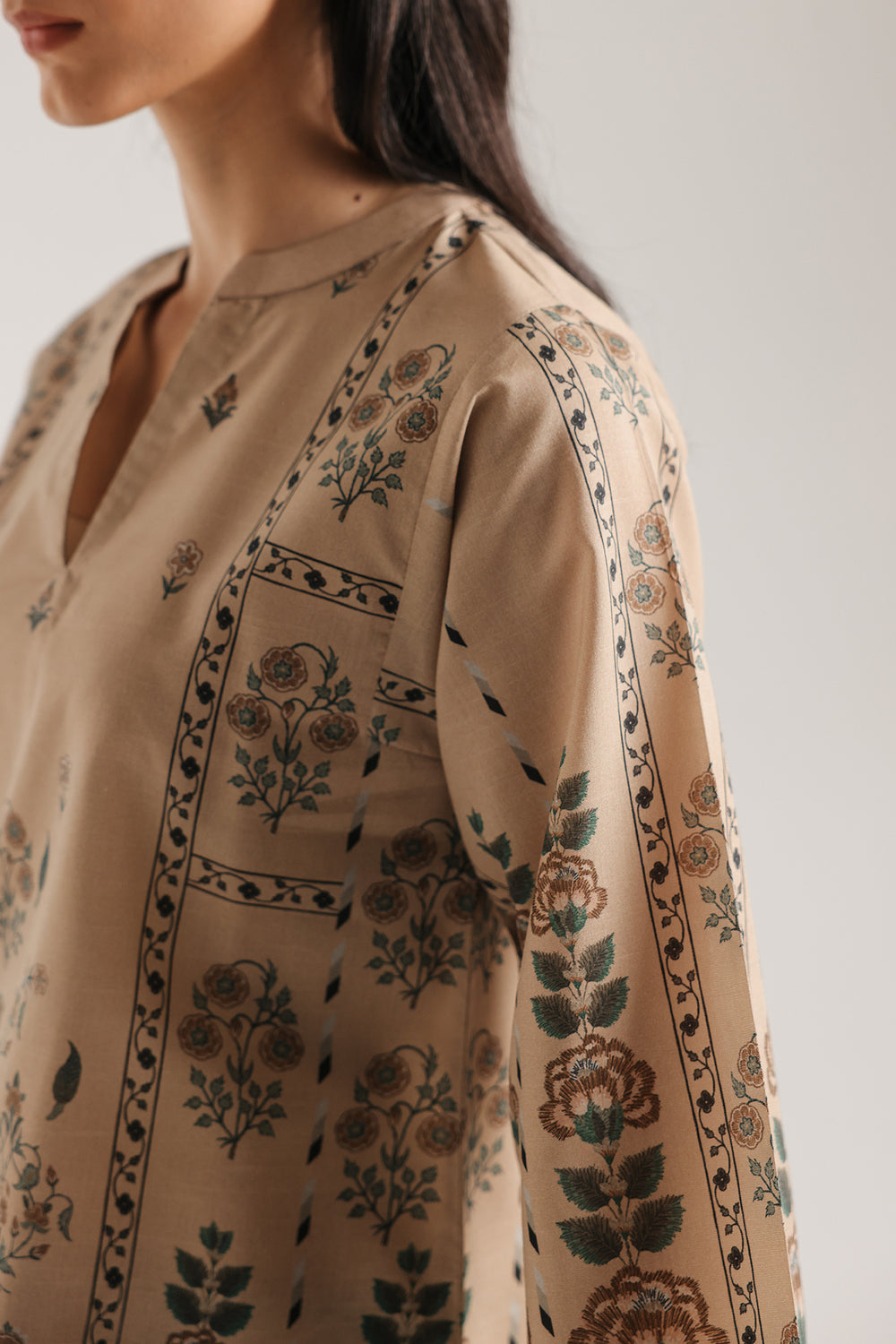 Elegant printed suit featuring a structured mandarin collar with split V-neckline. The tunic showcases intricate vertical panels with floral vines and a central star-shaped mandala motif on a soft tan base, accented with teal and rust-colored blossoms. Ornate borders frame the sleeves and hem with matching floral vine details. The high-contrast trousers display a diagonal stripe pattern in black and cream, adorned with small floral sprigs that echo the tunic's design, creating a cohesive ensemble.
