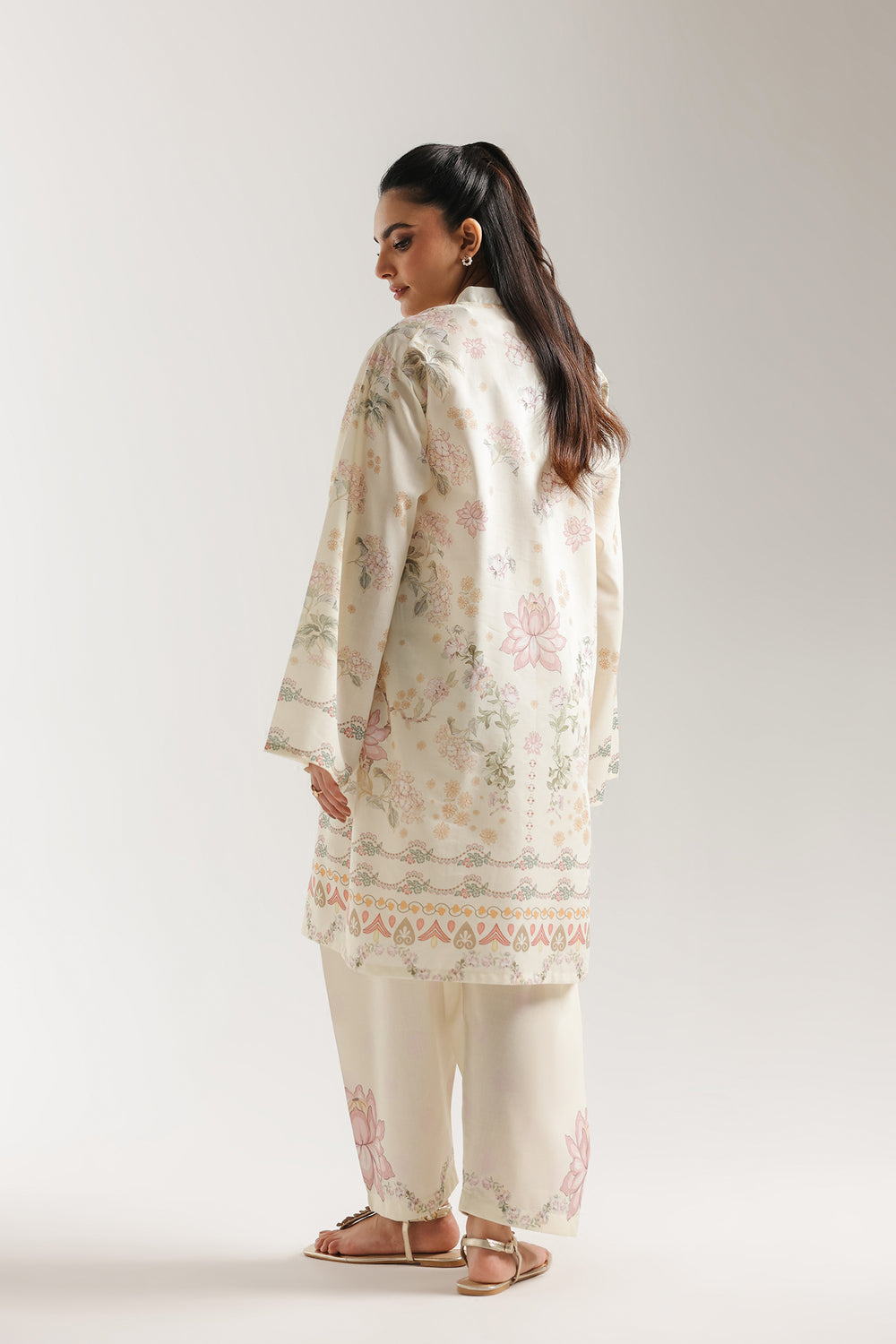 Radiate effortless charm with this stunning printed suit, a perfect harmony of delicate florals and contemporary design. The serene pale yellow tunic is adorned with soft pink lotus motifs and climbing botanical vines that create a refreshing, garden-inspired aesthetic. The silhouette is defined by a clean V-neckline and voluminous wide sleeves, offering a breezy and comfortable fit. Intricate geometric and floral borders trace the hemline, adding a refined structural element to the fluid fabric. Paired with matching off-white shalwar featuring a statement lotus print at the ankle, this ensemble is an ideal choice for elevated daytime gatherings or festive afternoon teas.