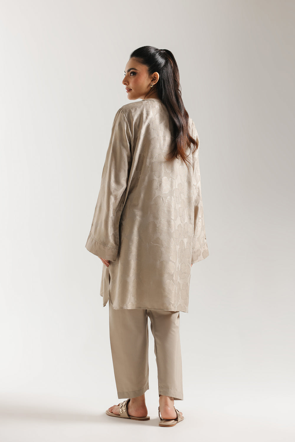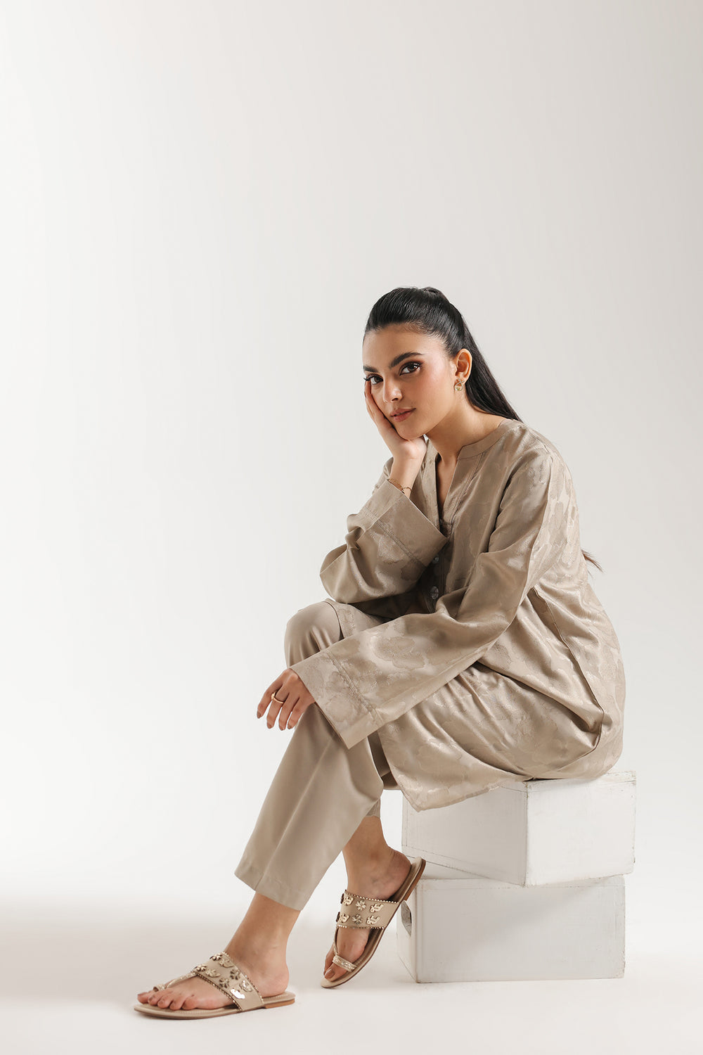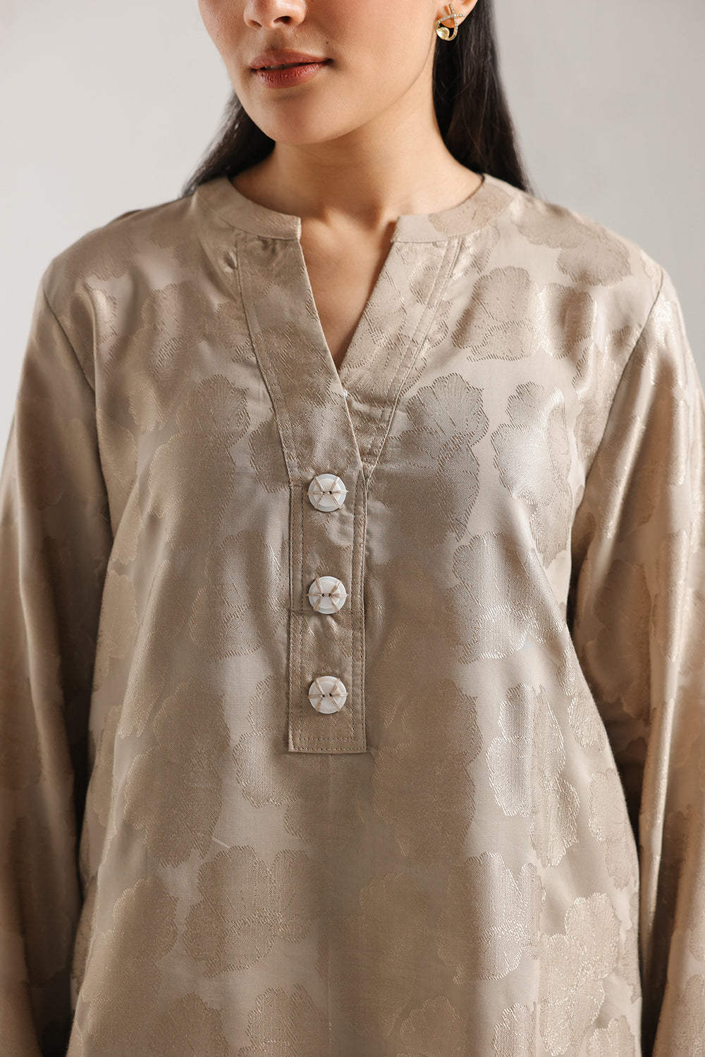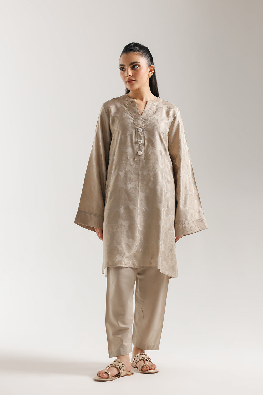 Step into a world of pure, monochromatic grace with this solid suit, a celebration of minimalist luxury and refined texture. This ensemble is crafted from premium fabric featuring a subtle, tonal jacquard-like self-pattern that catches the light with every movement. The tunic is designed with a sleek, relaxed silhouette and a classic V-neckline adorned with delicate button detailing. Paired with coordinating shalwar, this look offers a seamless, elongated profile. Perfect for the woman who finds power in simplicity, it is an ideal choice for serene summer mornings or elegant evening gatherings.