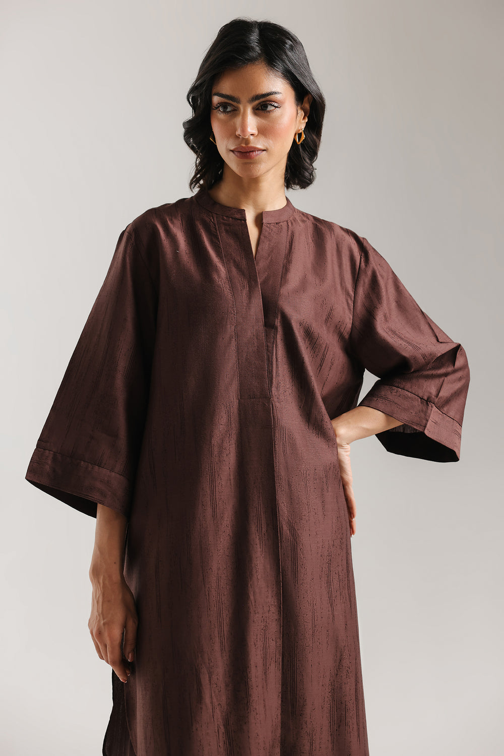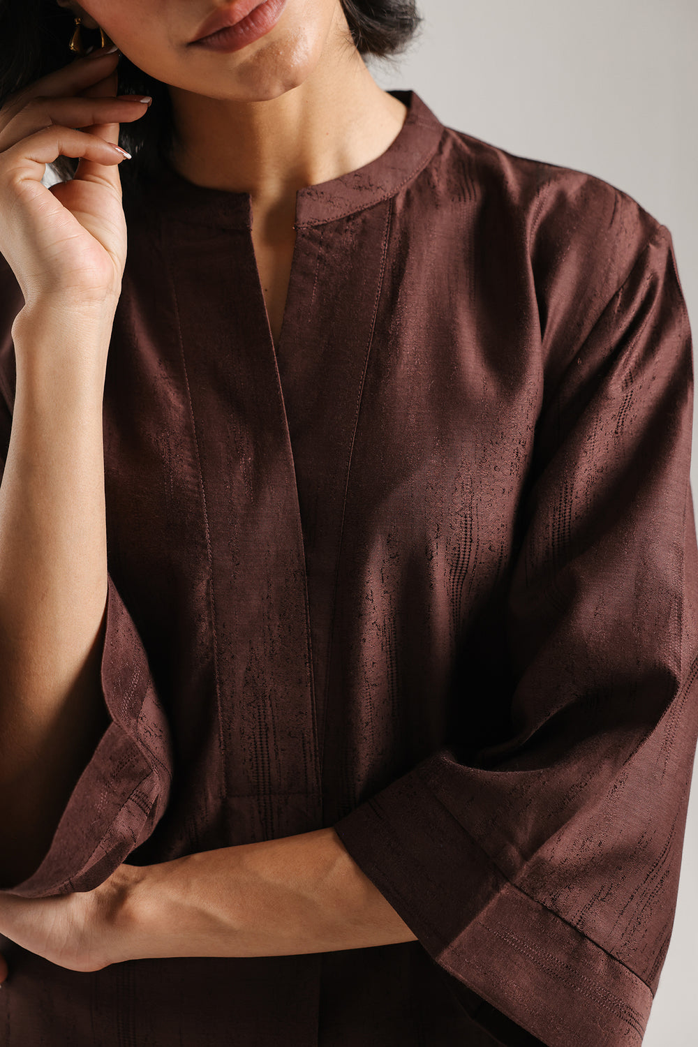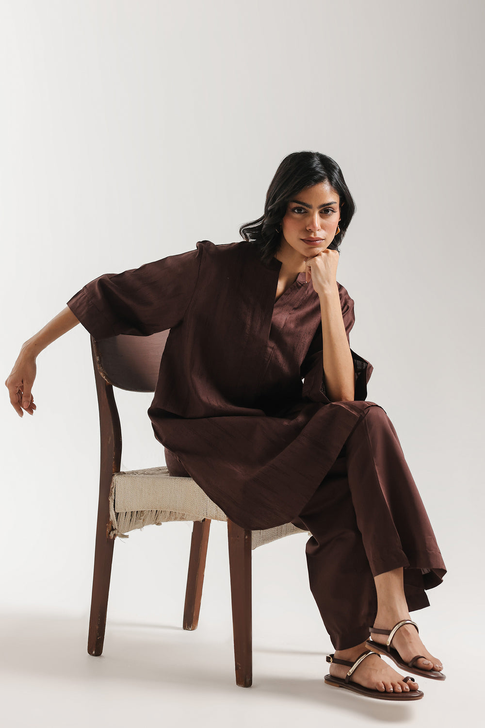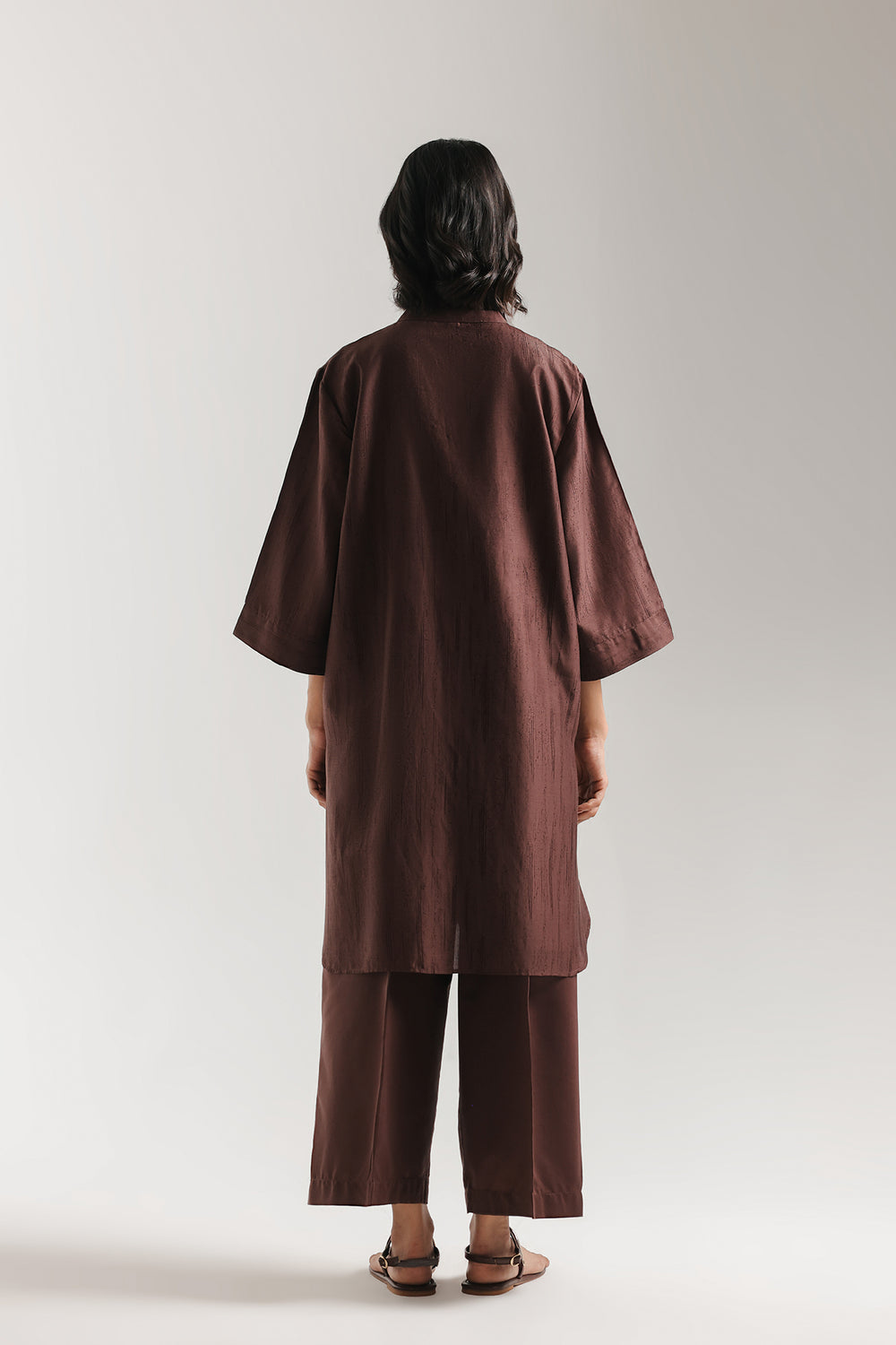 Embrace a look of rich, earthy sophistication with this chocolate brown two-piece solid suit. Designed for the modern woman who appreciates clean lines and effortless style, this ensemble is rendered in a deep, lustrous mahogany shade that exudes warmth and professionalism. The long-line shirt features a refined ban collar and a subtle V-neckline, transitioning into a relaxed, straight silhouette with contemporary mid-length sleeves. This minimalist aesthetic is seamlessly paired with matching wide-leg trouser, providing a polished drape and a comfortable, elevated fit. Perfect for transitioning from a day in the office to a refined evening dinner, this solid set is a versatile staple for any curated wardrobe.
