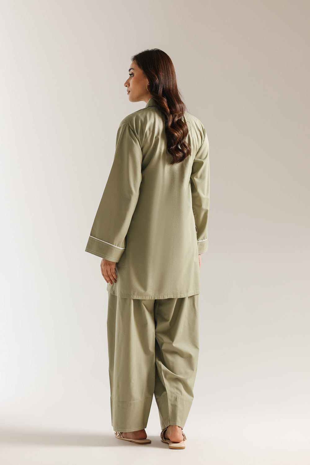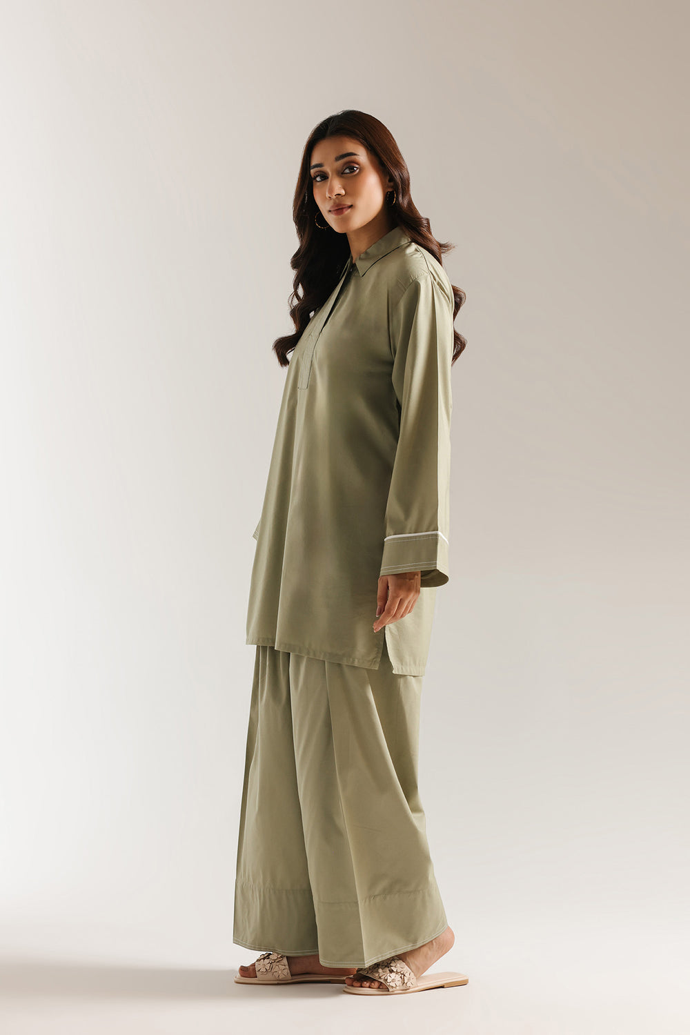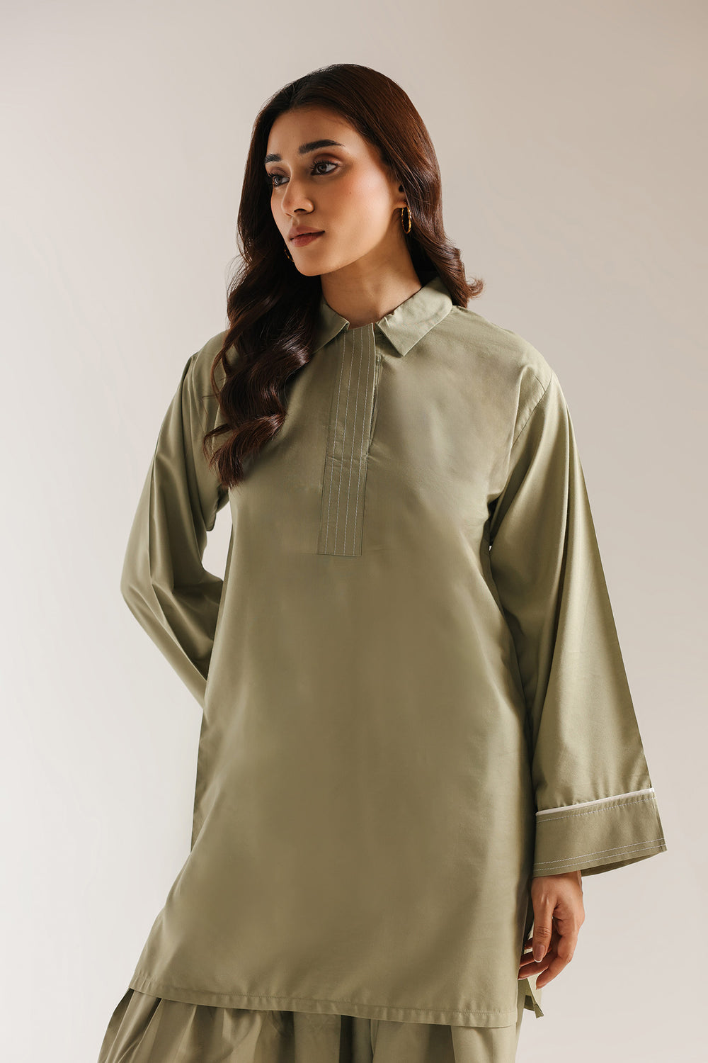 Embrace a sophisticated, minimal aesthetic with this two-piece solid suit in a rich olive green. The shirt is designed with a sharp, structured shirt collar and a concealed placket, featuring delicate tonal stitching for a refined finish. Its relaxed silhouette is complemented by wide, straight sleeves accented with a subtle white piping detail at the cuffs. To complete the look, the outfit is paired with voluminous, heritage-inspired shalwar trousers that add a traditional touch to the modern, architectural top. Crafted from high-quality, breathable fabric, this ensemble is perfect for the woman who seeks effortless style and a commanding presence.