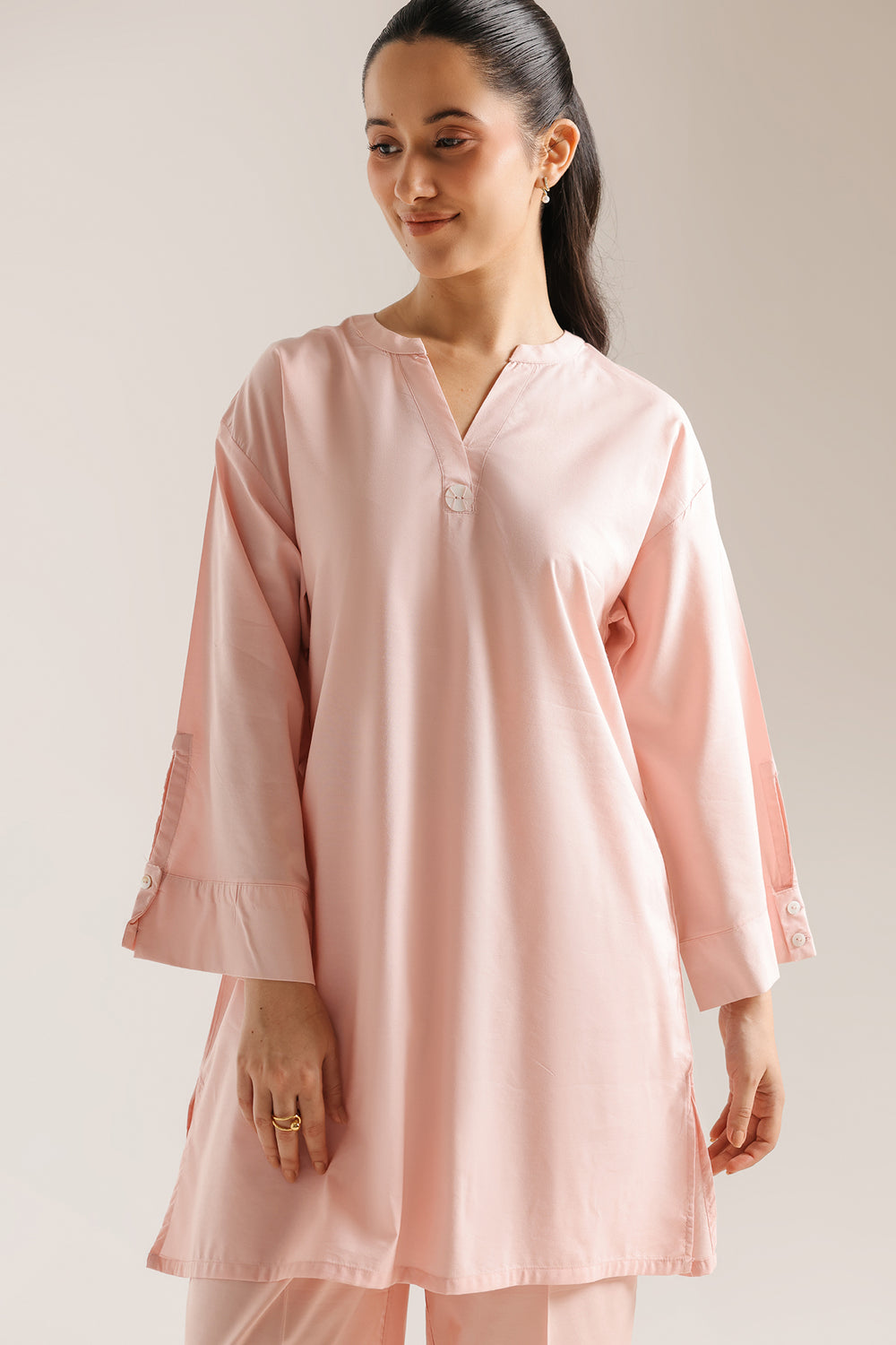 Embrace the beauty of minimalism in this two-piece solid ensemble in a delicate pale pink. The tunic is designed with a clean, contemporary silhouette, featuring a sophisticated band collar that leads into a subtle V-notched neckline with a single decorative button accent. The straight-cut shirt is elevated by cuffed sleeves with button detailing, lending a tailored, shirt-style feel to the overall look. Paired with matching straight-fit trousers with a sharp front crease, this monochromatic set is the epitome of effortless, everyday luxury. It is a versatile wardrobe staple designed for the woman who values refined simplicity and timeless grace.