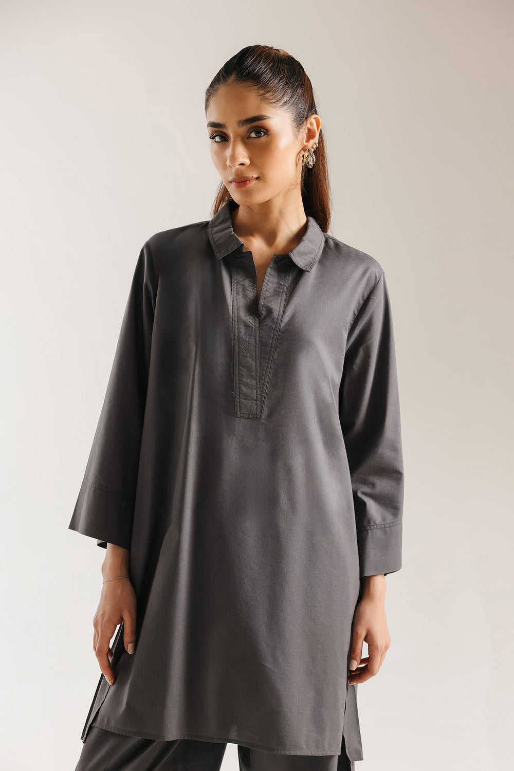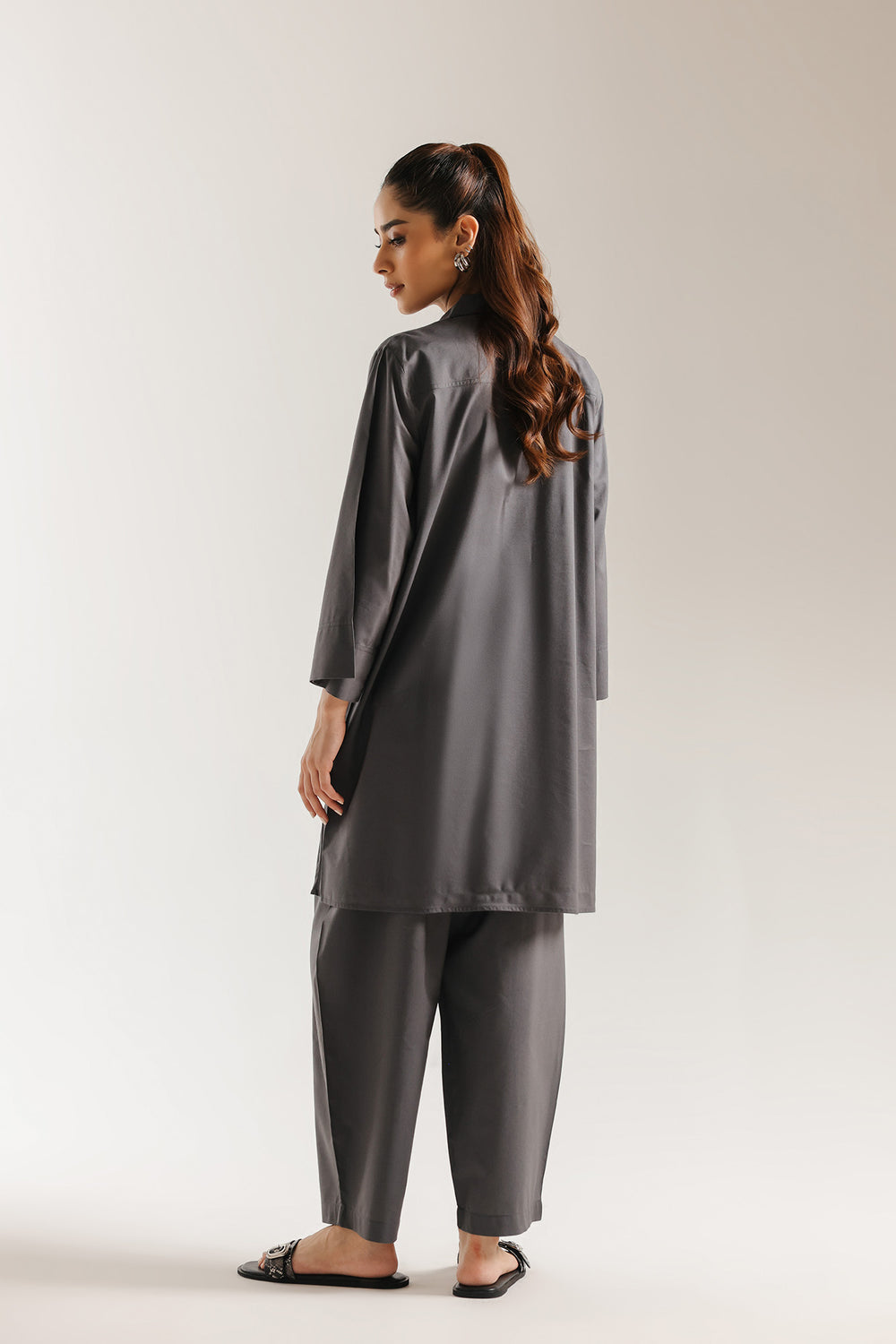 Embrace the power of understated luxury with this charcoal grey two-piece solid suit, a testament to clean lines and contemporary tailoring. The ensemble is rendered in a deep graphite hue, offering a sophisticated alternative to classic black while maintaining a versatile, professional edge. The shirt features a structured classic collar and a clean slit, falling into a relaxed, straight silhouette with mid-length sleeves. This minimalist aesthetic is carried through to the matching loose fit shalwar, which provide a comfortable yet polished drape. Crafted for the modern woman who values effortless style, this monochromatic suit transitions seamlessly from high-stakes boardroom meetings to refined evening dinners.