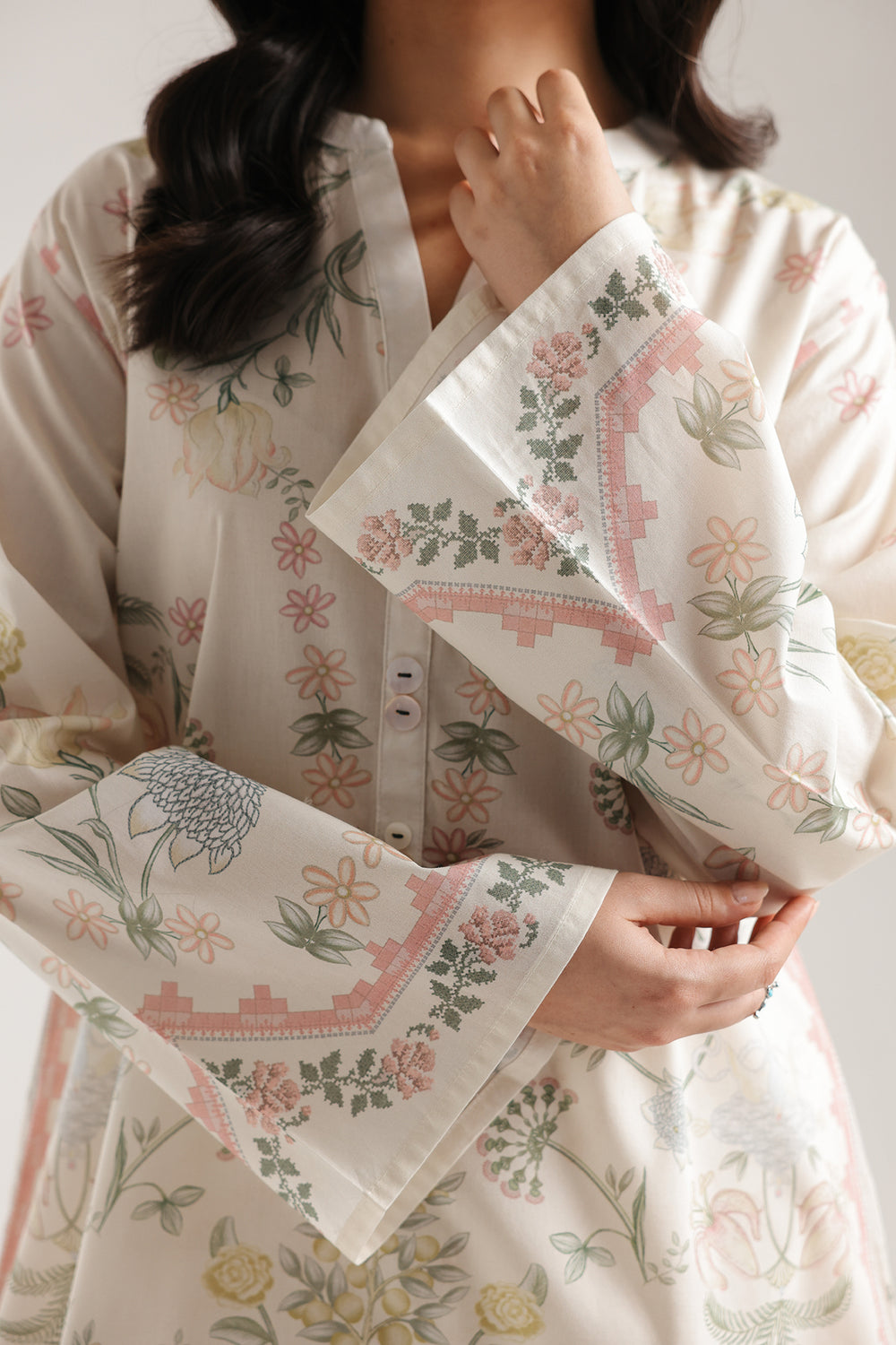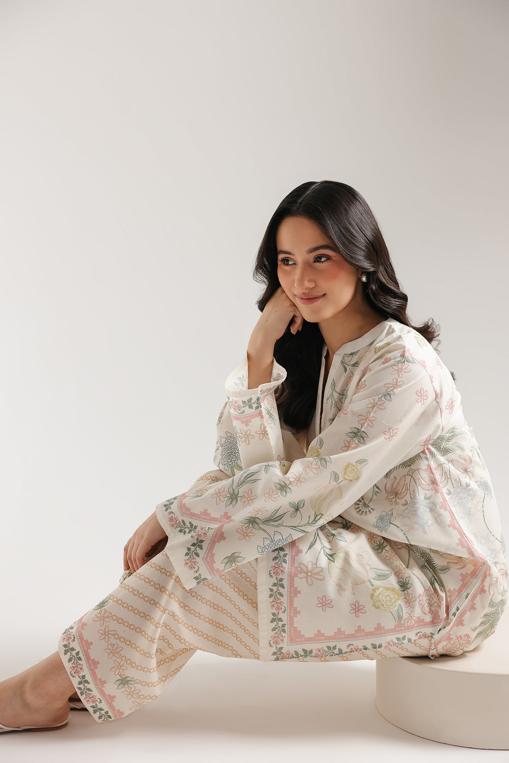 Embrace a modern artistic aesthetic with this two-piece printed suit in a clean off-white base. The shirt features a striking, large-scale abstract motif in rich chocolate brown, creating a bold visual contrast. Designed with a sleek band collar and an open V-neckline, the tunic's contemporary feel is enhanced by wide, structured sleeves finished with an ornate circular geometric border. The look is perfectly balanced with coordinating off-white trousers, which repeat the circular border motif at the hem for a cohesive, high-fashion finish. This ensemble is ideal for those who prefer minimalist silhouettes with high-impact graphic details.