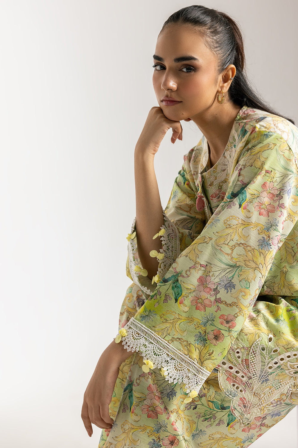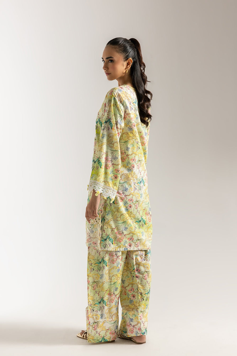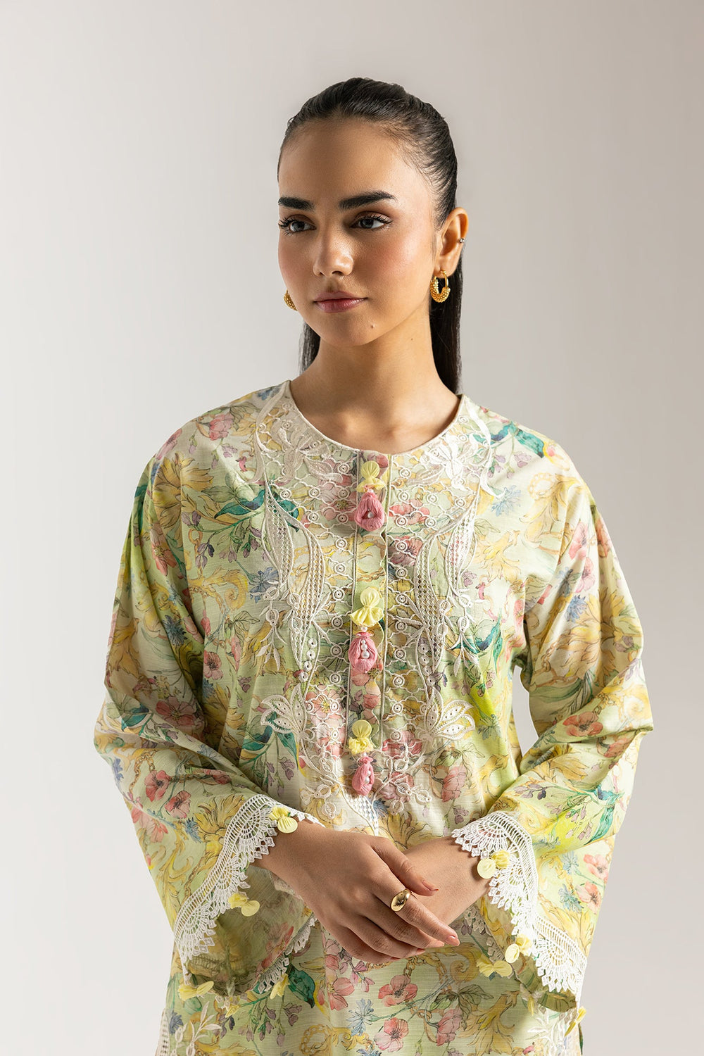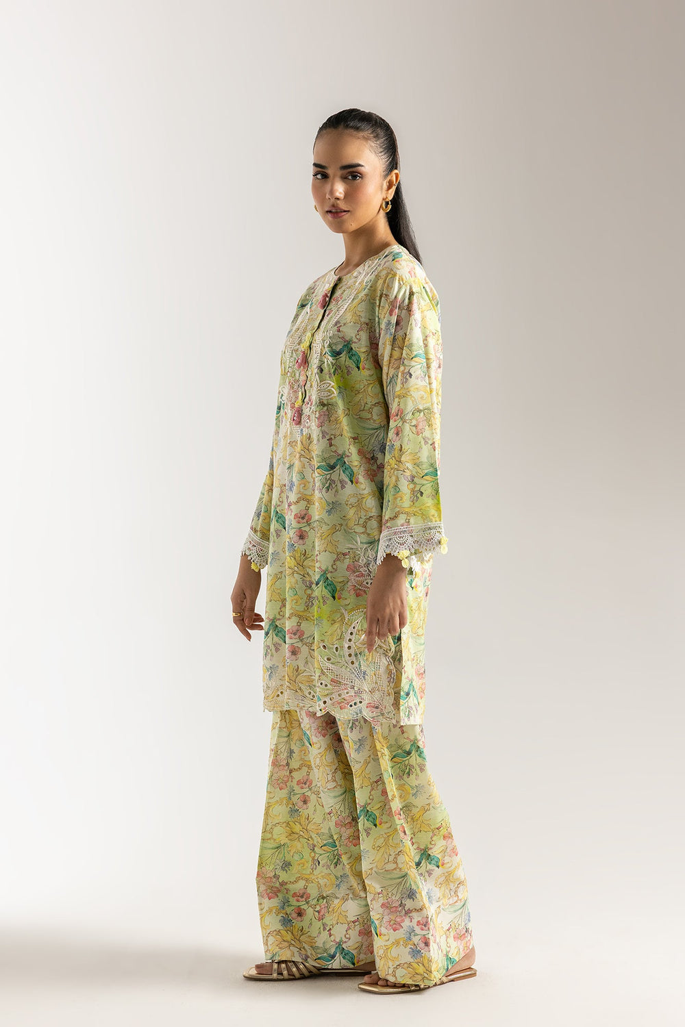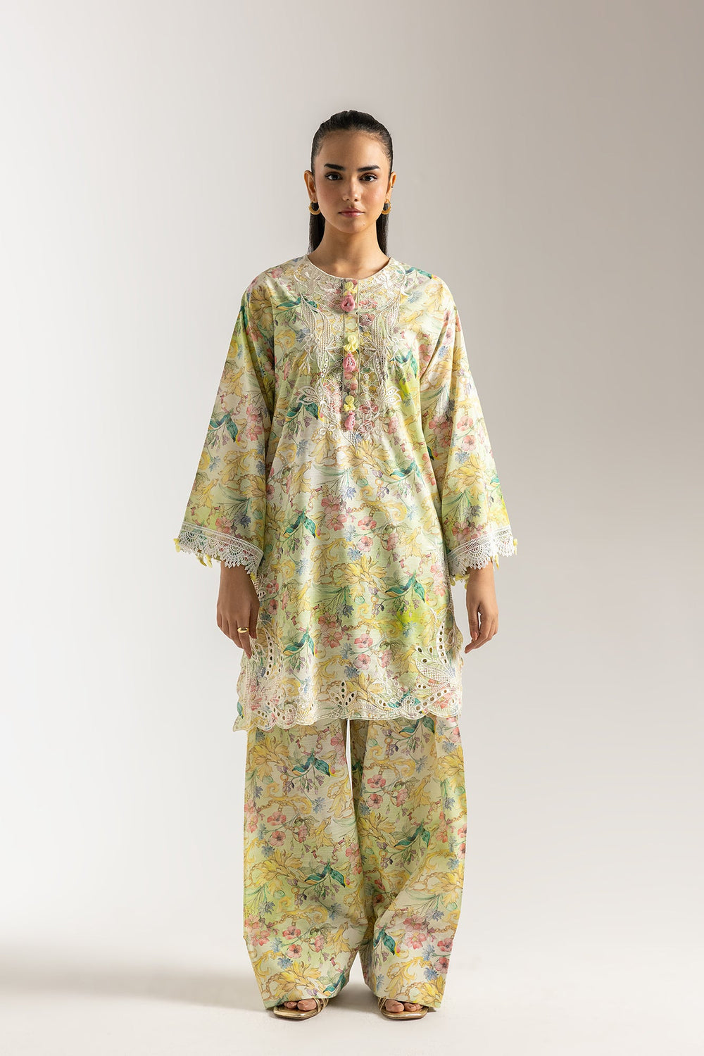 Step into a fresh, whimsical world with this charming two-piece outfit. A delicate, watercolor-inspired floral print in soft hues of yellow, green, and pink blooms across the fabric, creating a look of pure serenity. The tunic is beautifully detailed with intricate lace trim and embroidery on the hem and cuffs, while decorative tassels at the neckline add a playful touch. Paired with coordinating wide-leg farshi shalwar, this ensemble is the epitome of effortless, graceful style.