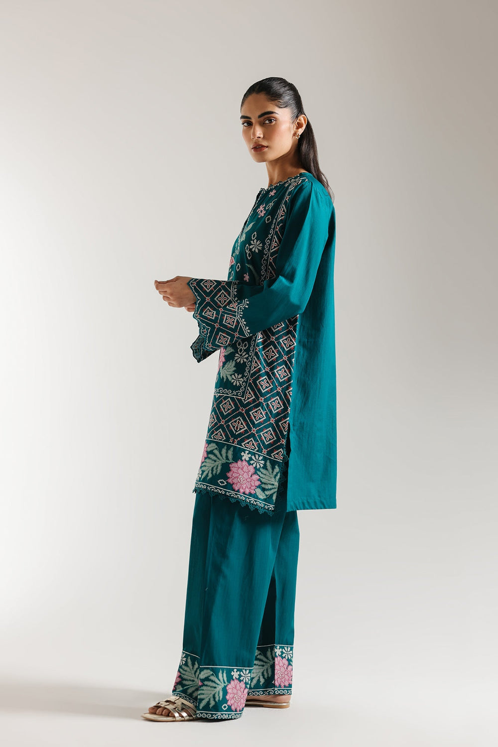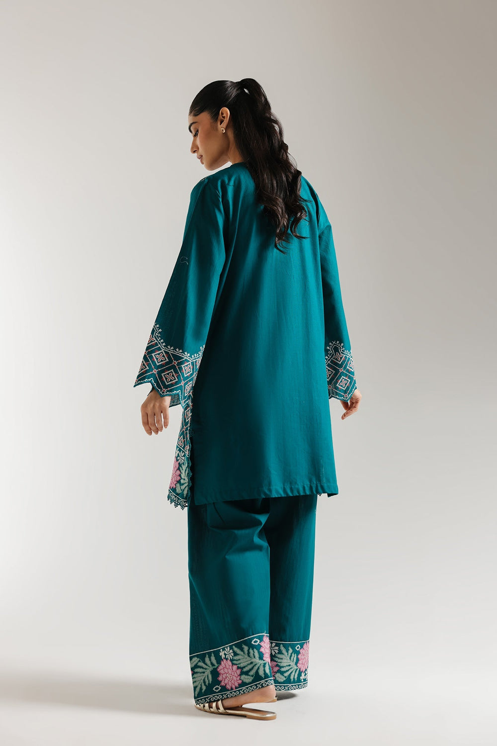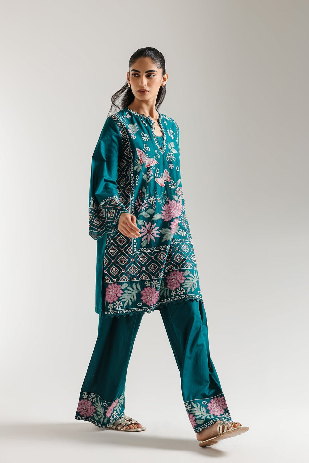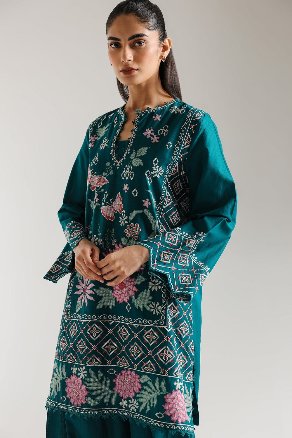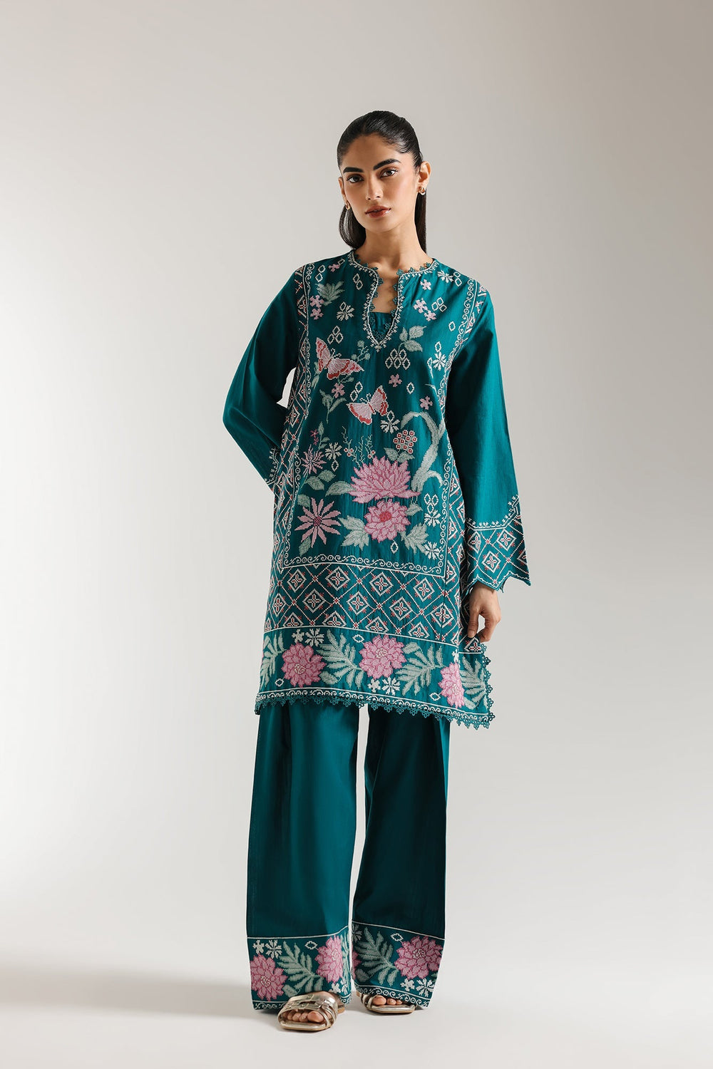Step into a realm of opulent beauty with this breathtaking emerald green ensemble. This luxurious two-piece features a meticulously embroidered kurta. Delicate pink floral motifs, intricate butterflies, and geometric patterns unfurl across the rich fabric, creating a captivating visual narrative. The wide sleeves are adorned with complementary embroidery and scalloped details, while the matching shalwar mirror the exquisite floral border. Perfect for making an unforgettable statement at any special occasion, this outfit combines traditional artistry with contemporary grace.