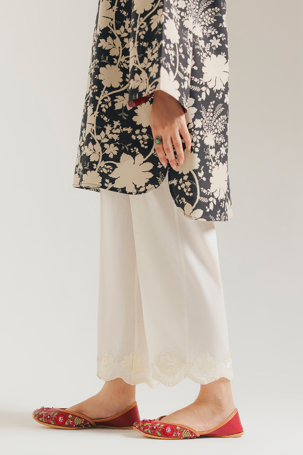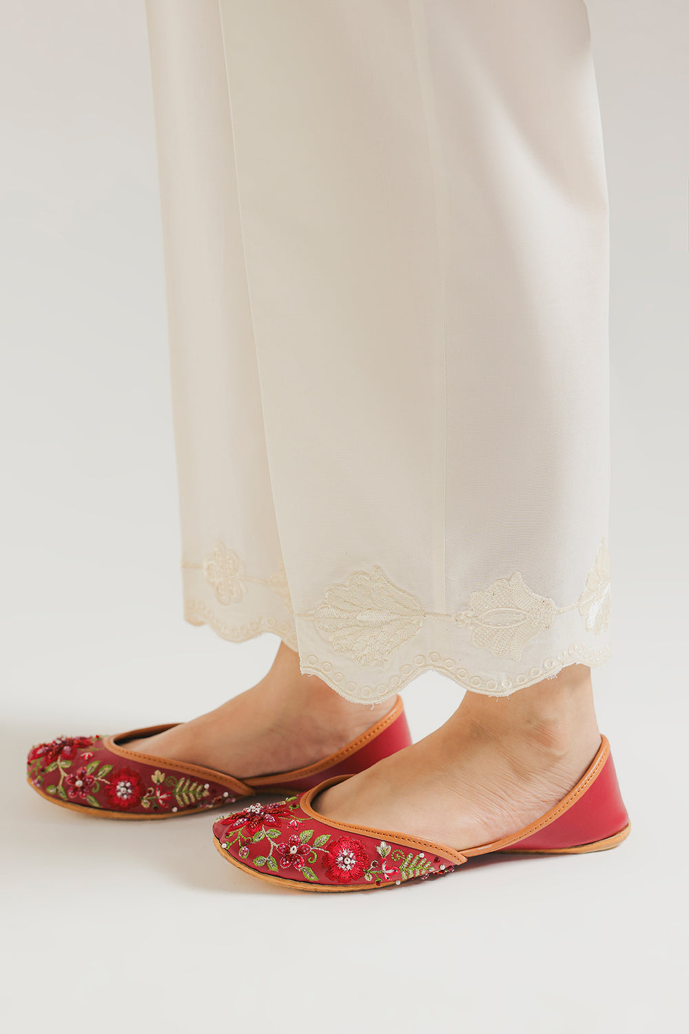 Unveil refined elegance with these crisp white embroidered trousers. These tailored straight-cut trousers are crafted from a soft, off-white fabric. The focal point is the delicate cutwork embroidery at the hem, featuring an intricate floral and scalloped lace pattern in a complementary tone. These versatile trousers offer a polished finish and pair beautifully with printed or embroidered shirts.