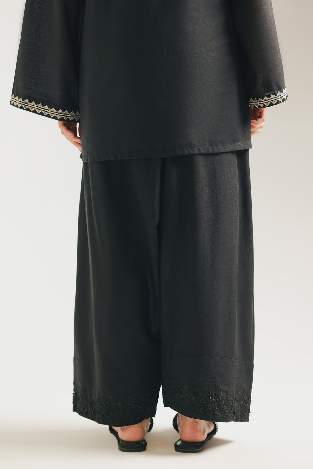 This elegant farshi shalwar is a masterpiece of traditional style. Crafted in a rich black hue, it features a classic wide-leg silhouette that drapes beautifully. The true highlight is the intricate embroidery at the hem, with delicate floral and botanical motifs that add a touch of timeless sophistication to any ensemble.