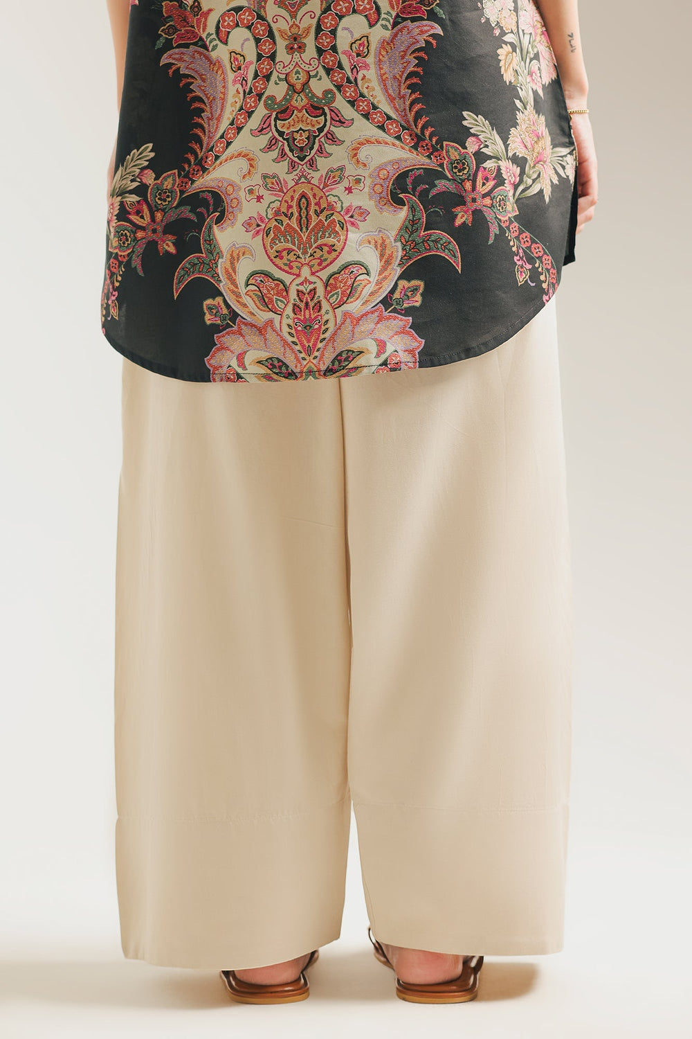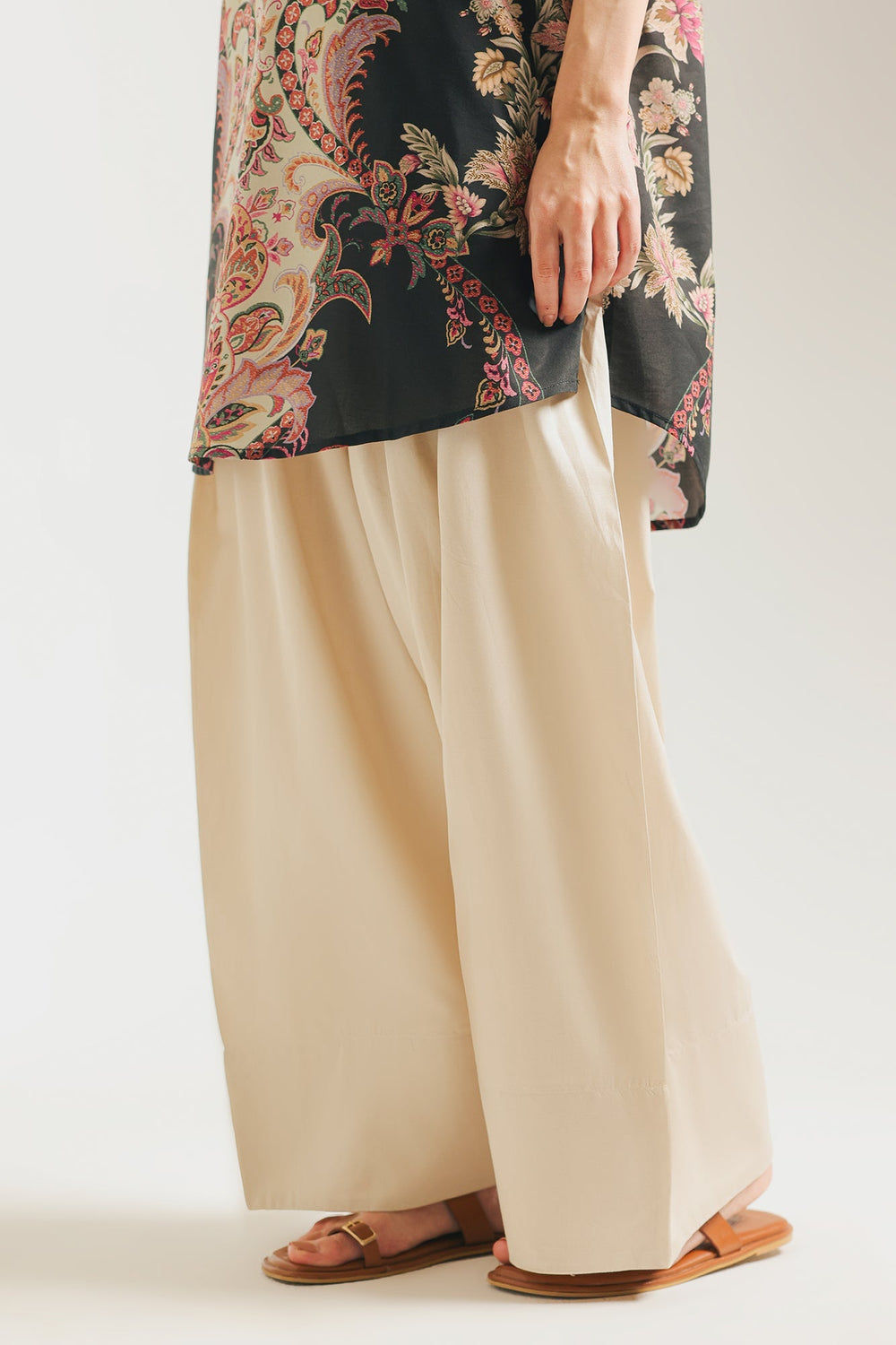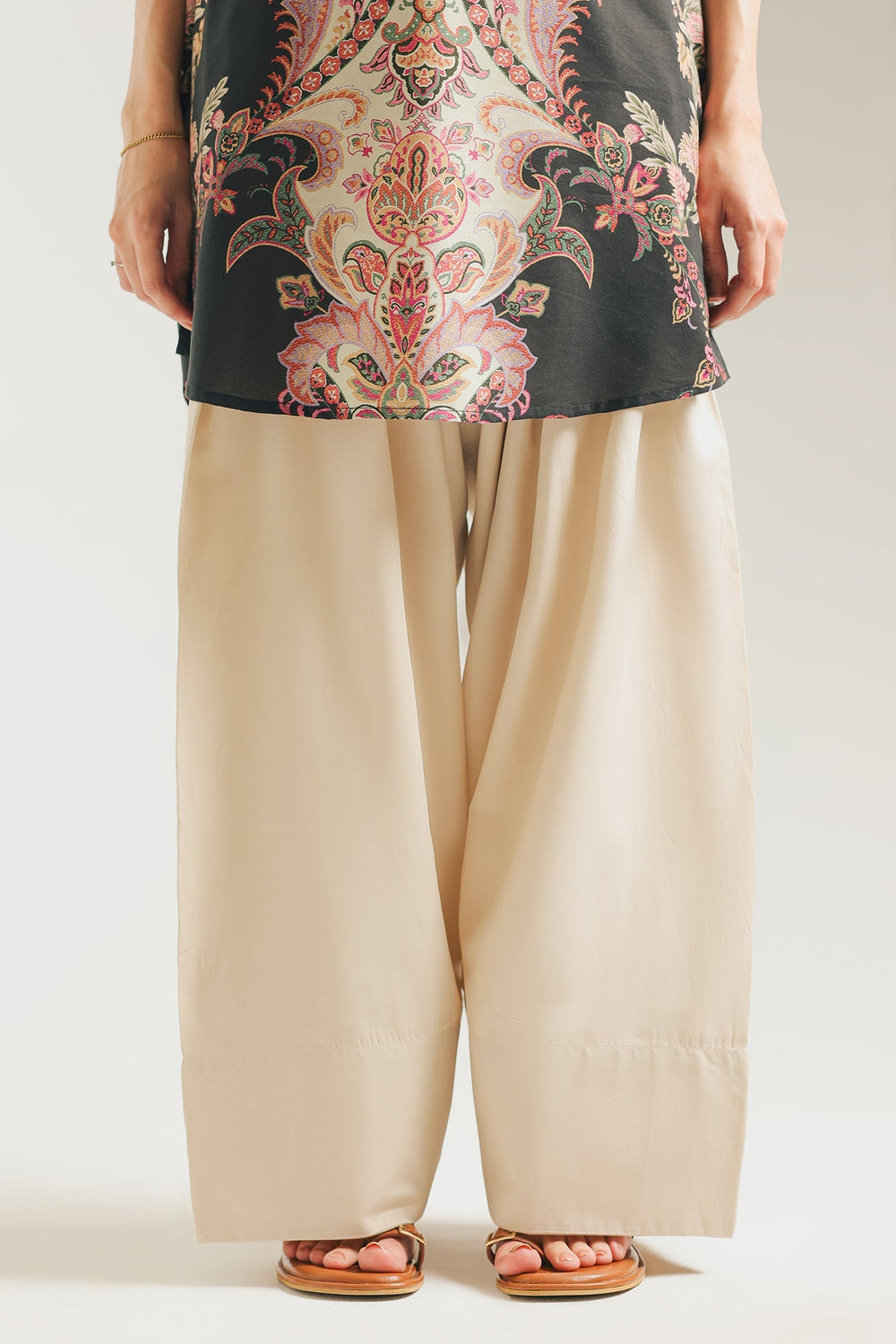 This classic shalwar is a timeless piece that promises effortless grace. Crafted from a soft cambric fabric, its wide, flowing silhouette drapes beautifully, creating a comfortable and elegant look. The subtle pleating adds to its fluid movement, making it a perfect foundation for any traditional ensemble.