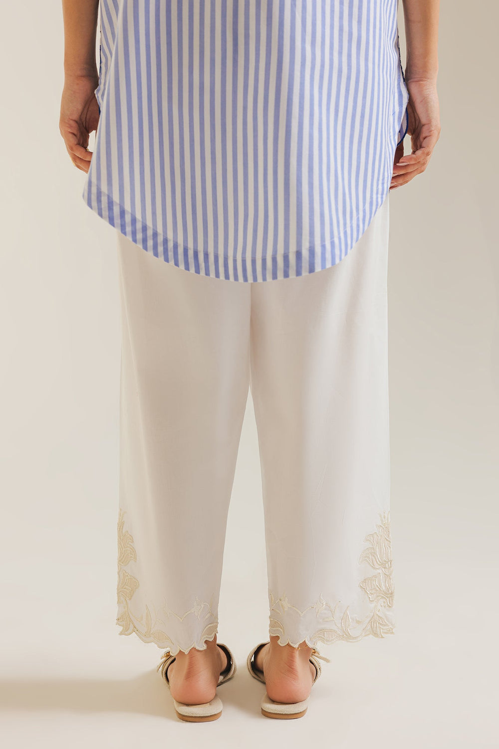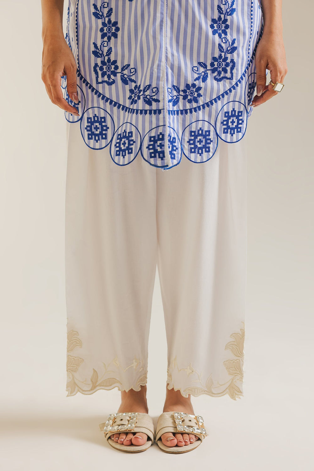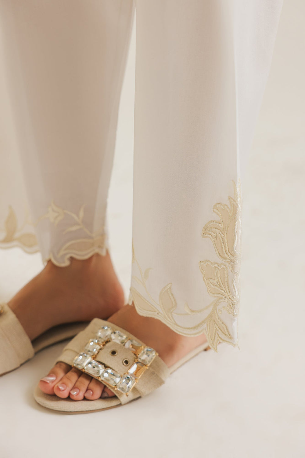 Elevate your style with this sophisticated pristine white shalwar. Featuring delicate embroidered detailing along the hemline, adding a touch of refined elegance to any ensemble. The comfortable wide-leg silhouette and smooth fabric make it perfect for both special occasions and everyday chic. Pair it with a flowy top or a tailored blouse for a polished look.