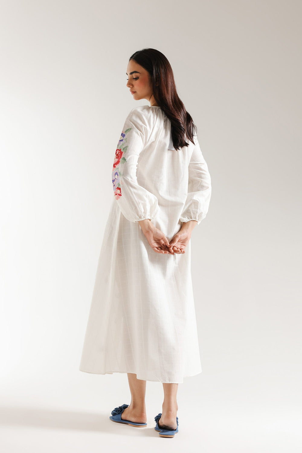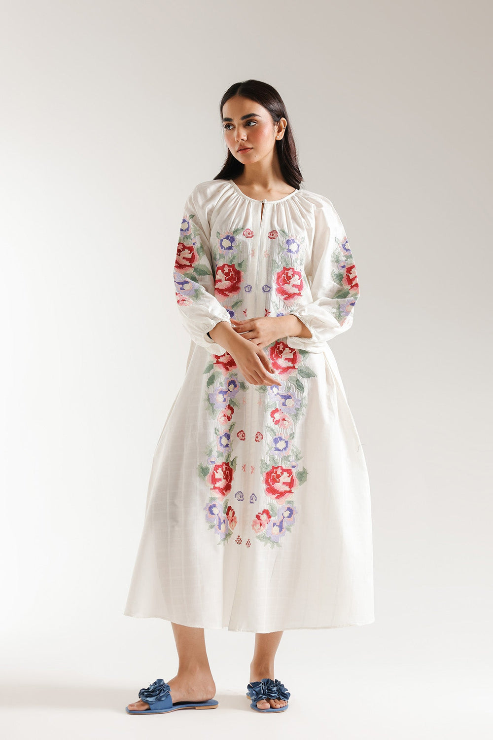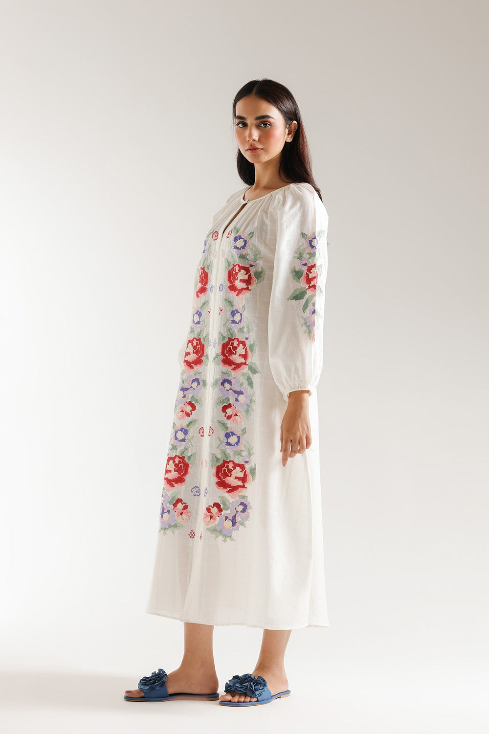 A trendy shirt crafted in a contemporary silhouette. Illustrating a classy white canvas beautifully adorned with fascinating floral designs embroidered in mesmerizing shades. Enhanced with cross stitch designs, this statement shirt is a graceful option to style at day gatherings and make a statement this summer season.