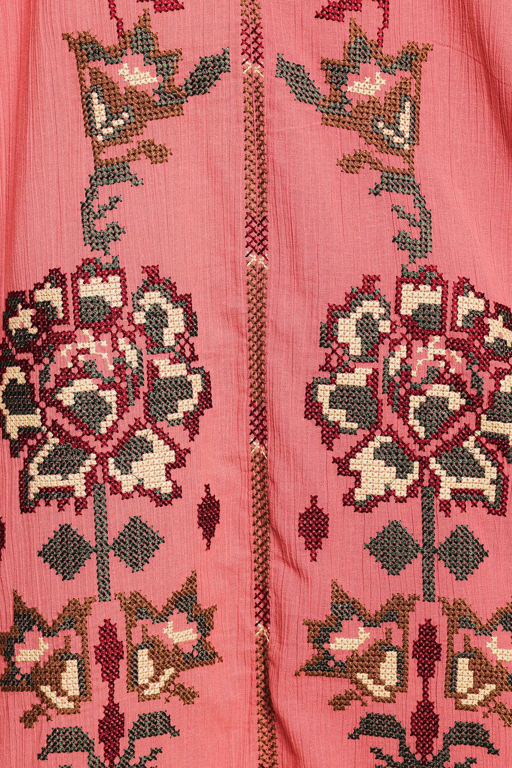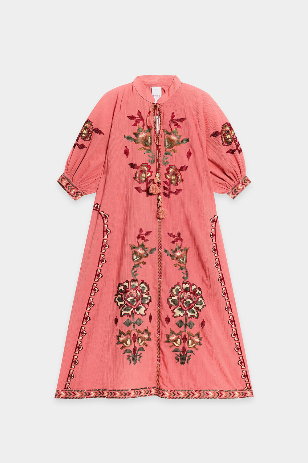 Make a statement in this stunning embroidered dress. This dress is a beautiful peach color and features intricate floral embroidery throughout. The long, flowing silhouette and the tie-up detail at the neckline add to its unique and elegant charm. With its comfortable fit and beautiful design, this dress is perfect for any occasion.