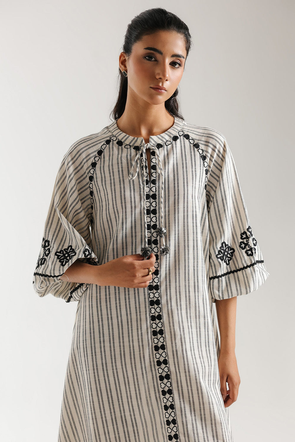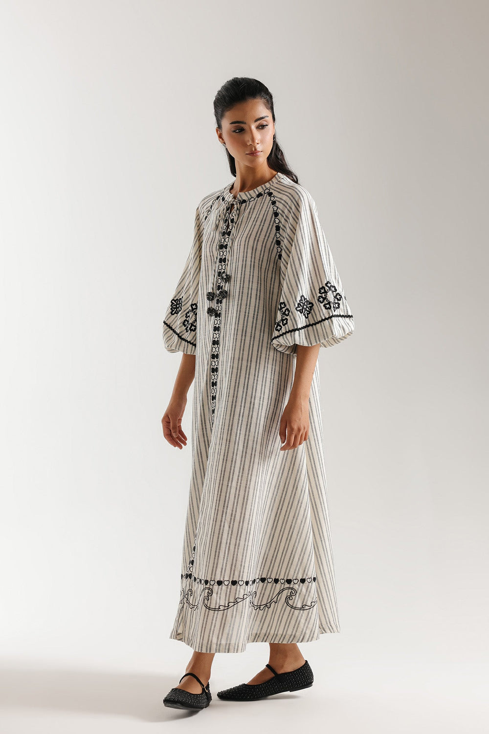 Elevate your wardrobe with this sophisticated embroidered dress, crafted from premium striped fabric in soft cream and charcoal tones. The relaxed silhouette features an elegant A-line cut that flatters all body types, while voluminous three-quarter sleeves with gathered cuffs add contemporary flair. Intricate geometric embroidery adorns the center front, sleeves, and hemline, showcasing traditional craftsmanship. The mandarin collar with subtle keyhole placket provides refined detail and ease of wear. Perfect for both casual gatherings and semi-formal occasions, this piece seamlessly transitions from day to evening wear.
