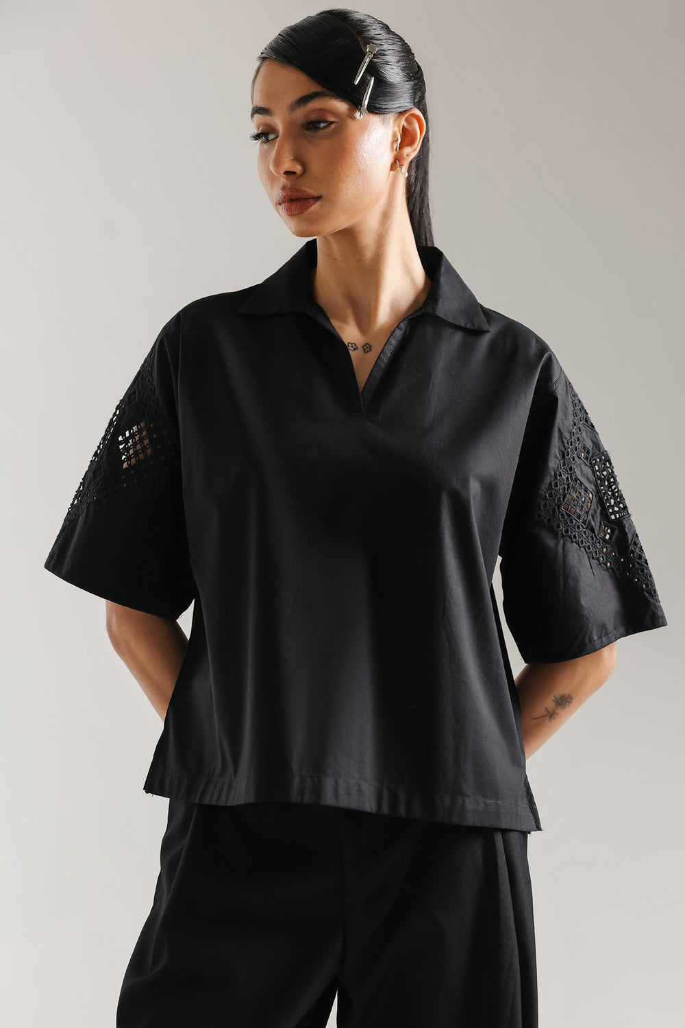 Elevate your wardrobe with this black embroidered top, a striking fusion of modern flair and traditional detail. The crisp obsidian fabric is transformed by intricate geometric eyelet embroidery on the wide, flutter sleeves. With its flattering V-neckline and relaxed silhouette, this piece offers an effortless statement for any sophisticated evening.