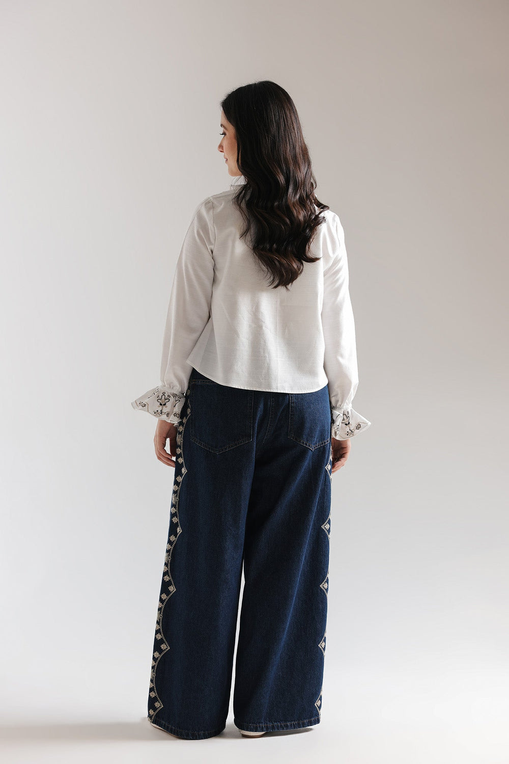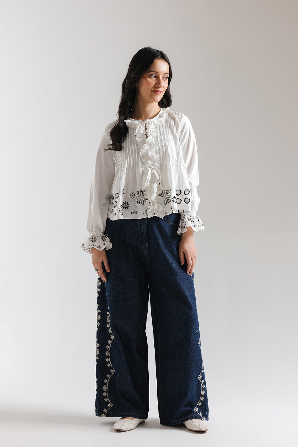 Elevate your wardrobe with this exquisite embroidered shirt, a masterpiece of refined craftsmanship. Crafted in pristine white linen, this romantic blouse features meticulously placed pintucks that create vertical dimension across the front, paired with an elegant ruffle placket and delicate tie-neck closure. The standout detail lies in the striking geometric embroidery in deep navy that adorns both the hemline and flared cuff edges, adding sophisticated contrast and artisanal appeal. Long sleeves with ruffled cuffs complete the bohemian aesthetic, making this piece an ideal choice for those who appreciate timeless elegance with contemporary flair. Perfect for layering or wearing as a statement piece.