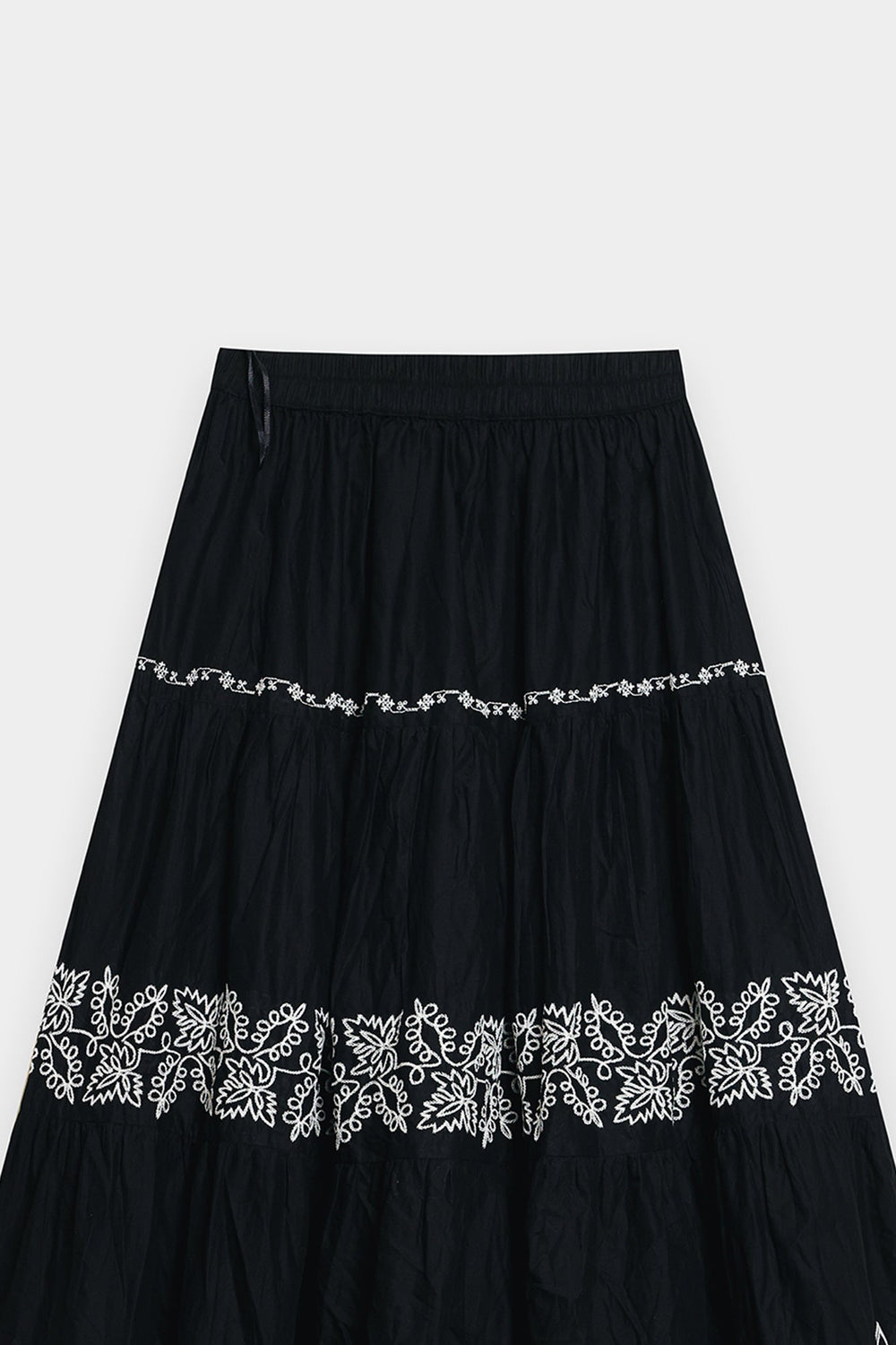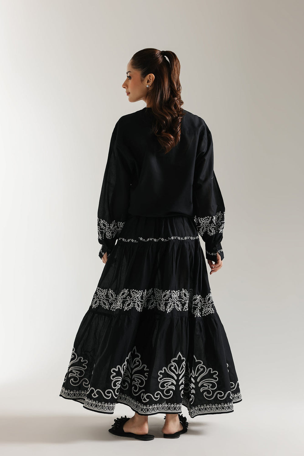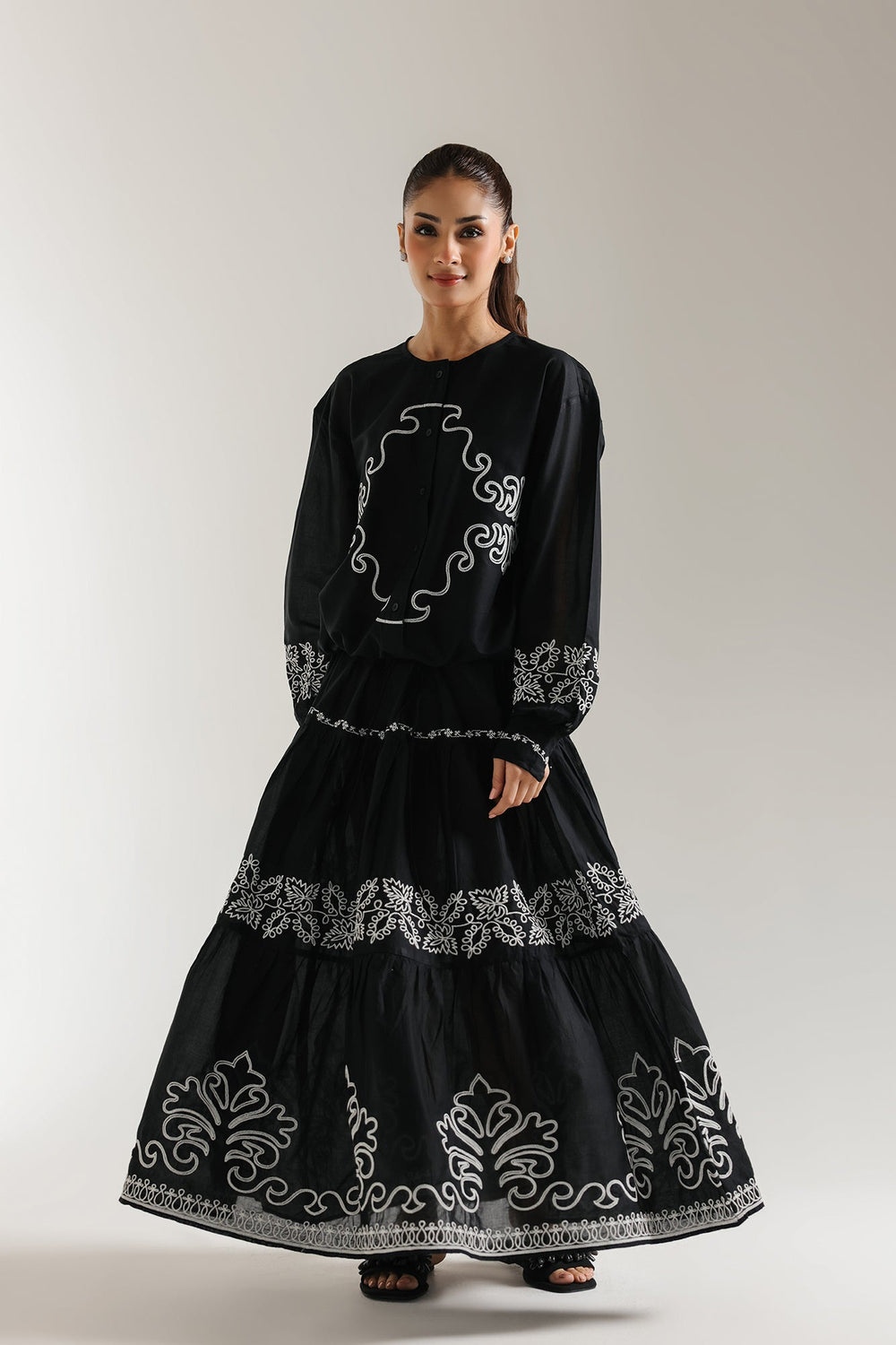 Embrace dramatic elegance with our Midnight Scroll two-piece set. This striking ensemble in deep black features intricate white embroidery that flows across both the top and the tiered skirt, creating a captivating visual narrative. The top offers a relaxed yet sophisticated silhouette with long sleeves, while the high-waisted skirt flares into graceful tiers, each adorned with the swirling embroidery.
