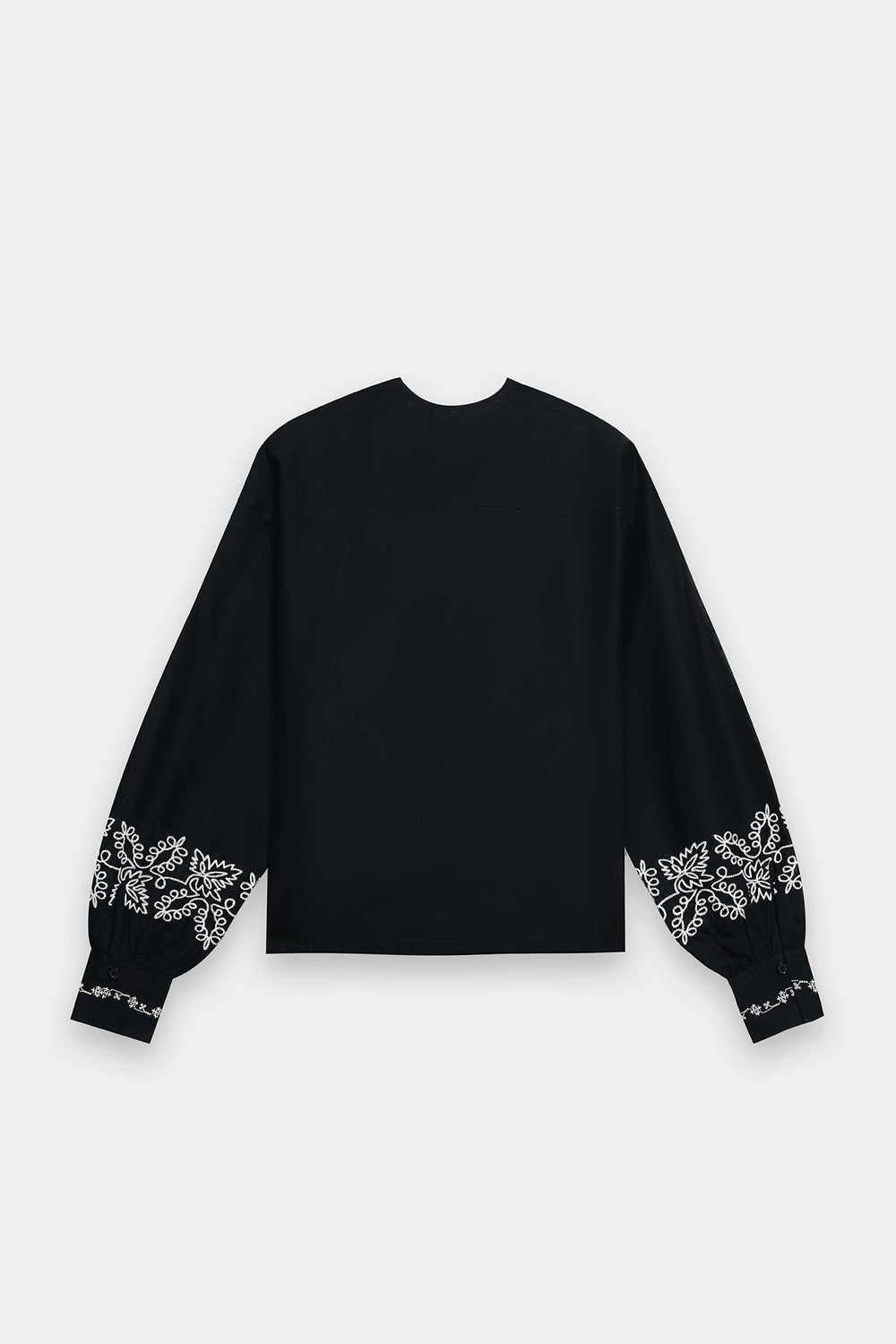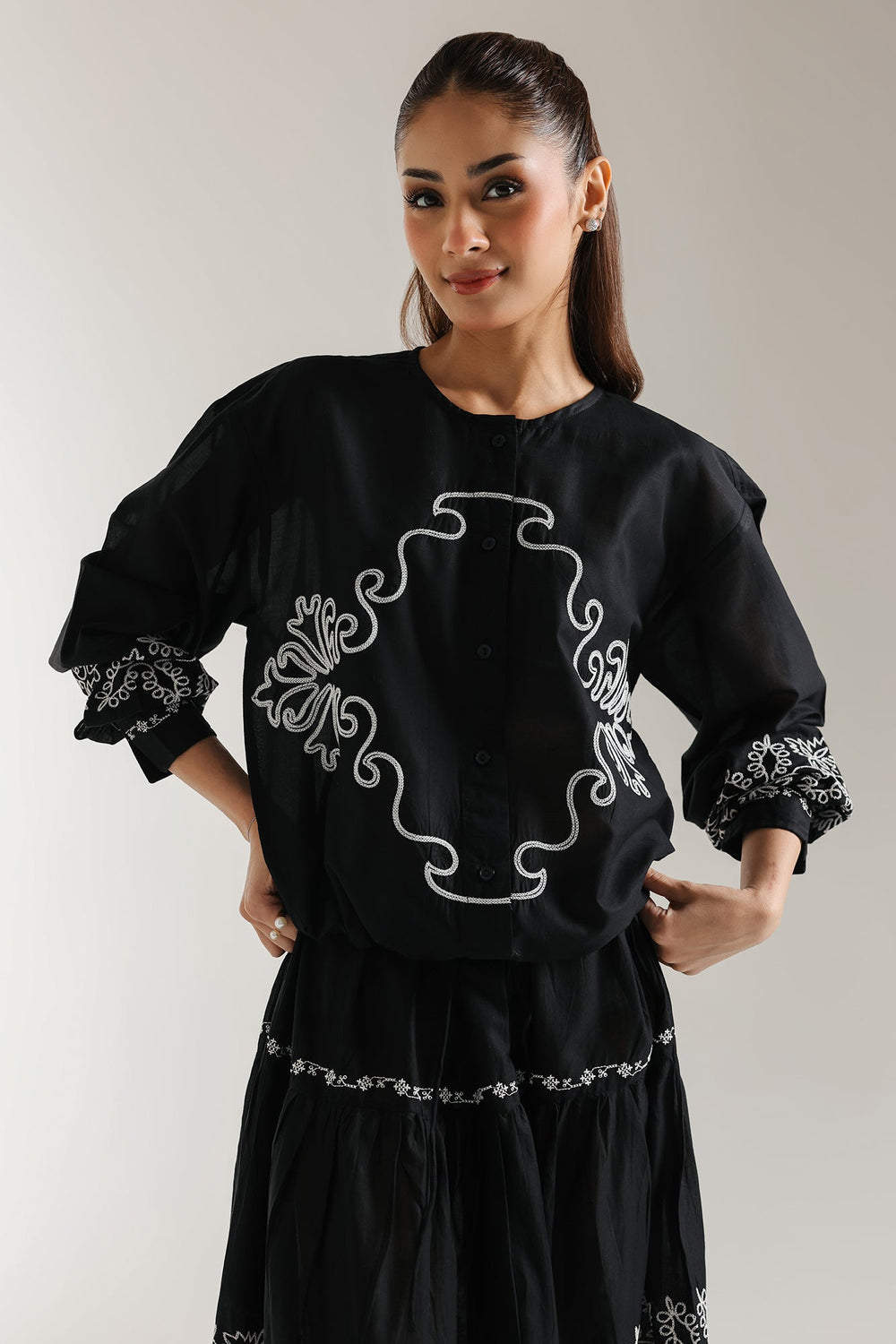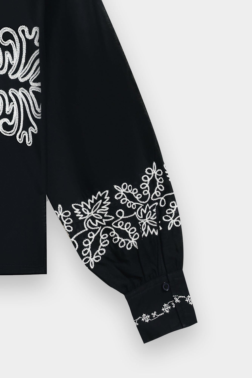 Embrace dramatic elegance with our Midnight Scroll two-piece set. This striking ensemble in deep black features intricate white embroidery that flows across both the top and the tiered skirt, creating a captivating visual narrative. The top offers a relaxed yet sophisticated silhouette with long sleeves, while the high-waisted skirt flares into graceful tiers, each adorned with the swirling embroidery.