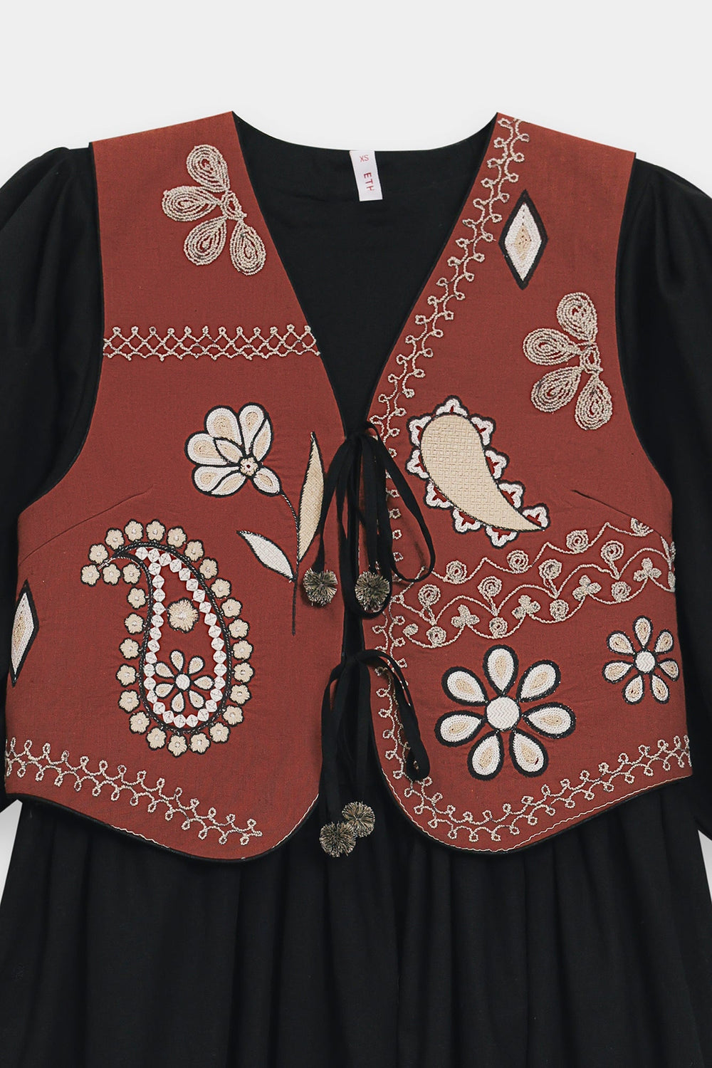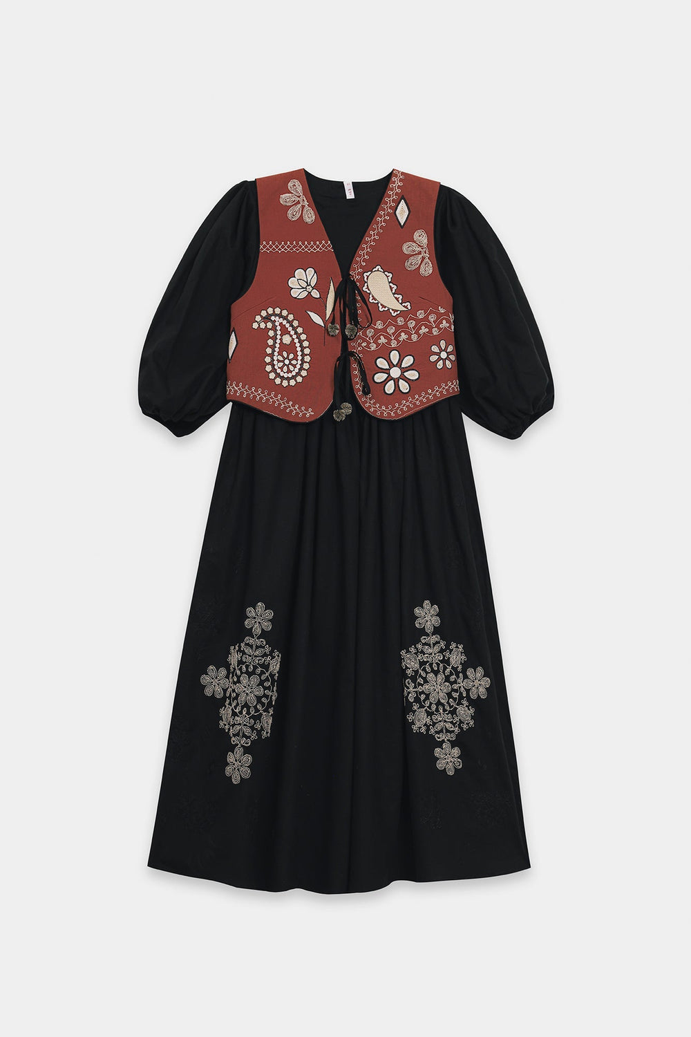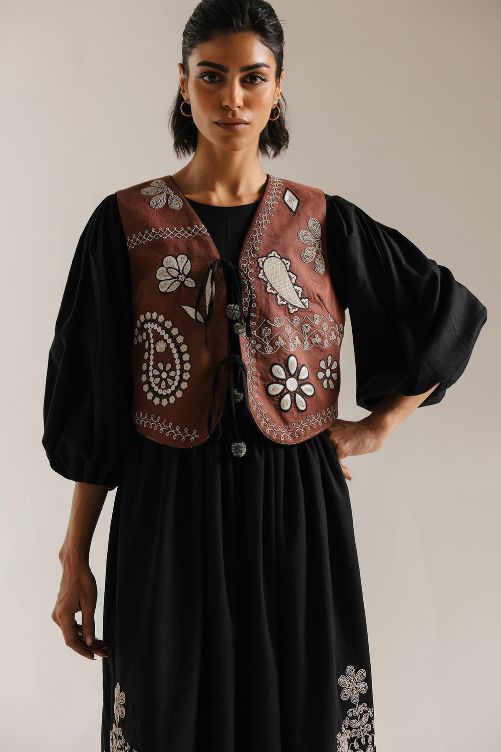 Make a striking and multi-layered statement with this sophisticated three-piece ensemble, featuring a jet-black dress paired with an artisanal waistcoat. The floor-length black dress features a gathered waist and dramatic balloon sleeves, offering a voluminous, graceful silhouette. Its skirt is adorned with delicate, light-toned floral embroidery that blooms upward from the lower sides, adding a touch of botanical elegance. Layered over the dress is a short, chestnut-brown waistcoat that serves as the focal point of the outfit. The waistcoat features a rich array of ivory needlework, including large paisley motifs, stylised flowers, and decorative borders. It is designed with a classic V-neckline and a front tie-up closure, perfectly complementing the bohemian-chic aesthetic of the entire look.