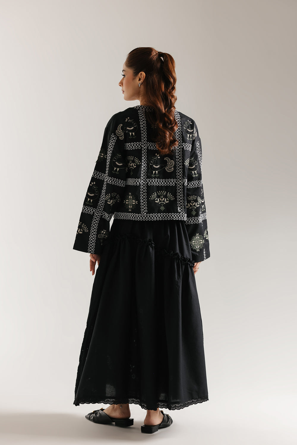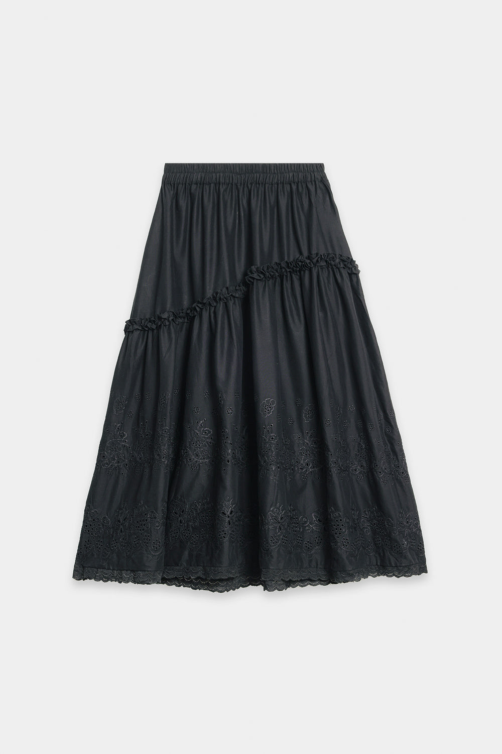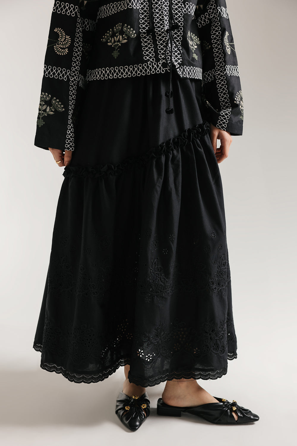 This sophisticated black skirt epitomizes refined elegance through its thoughtfully curated design elements. The classic A-line silhouette provides a flattering foundation, while intricate cut-out and lace detailing at the front and bottom opening. The flowing length ensures graceful movement, and a striking embroidered pattern along the front introduces an unexpected artistic dimension. Perfect for those who appreciate the marriage of timeless style with contemporary design flourishes, this piece transitions seamlessly for evening occasions.