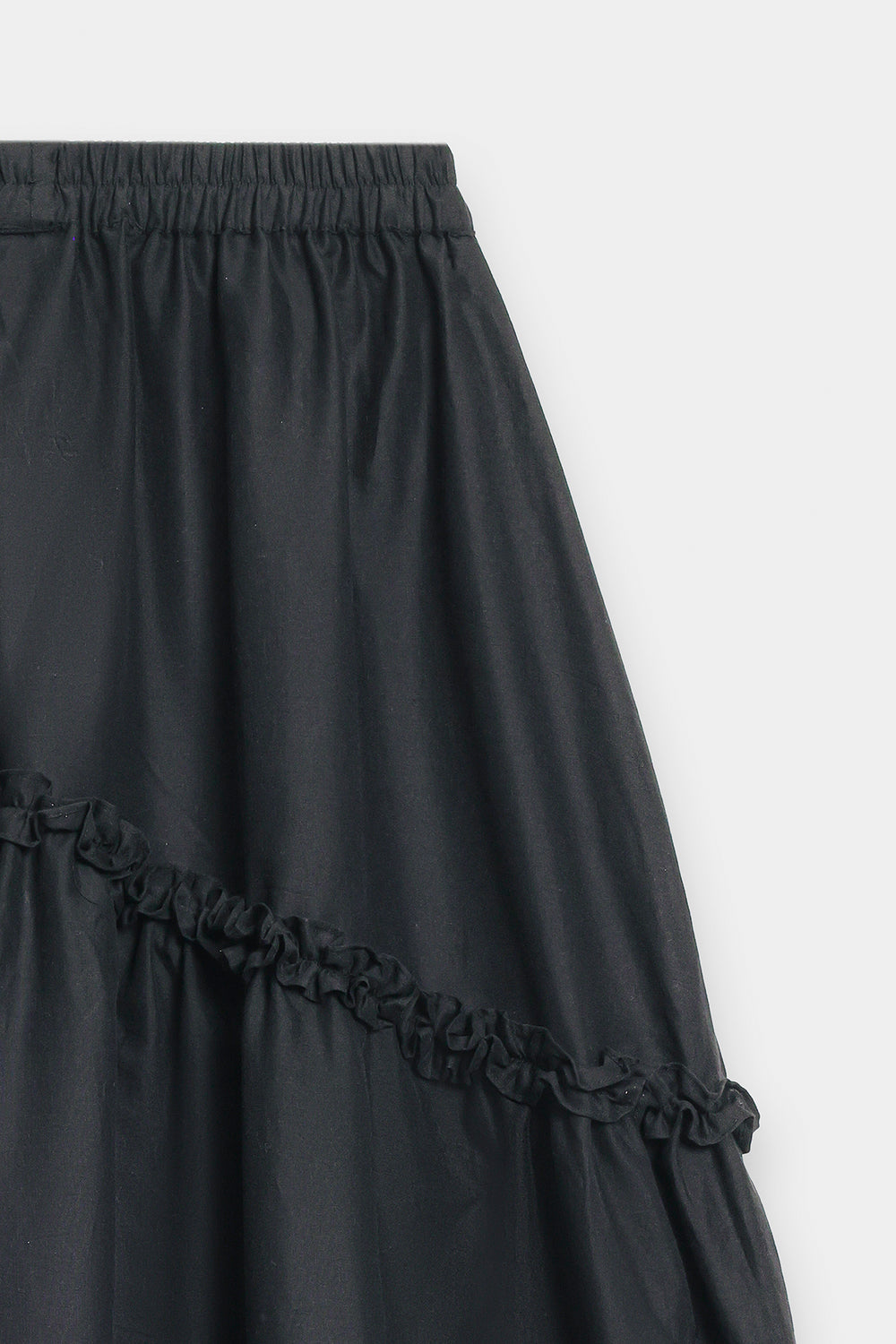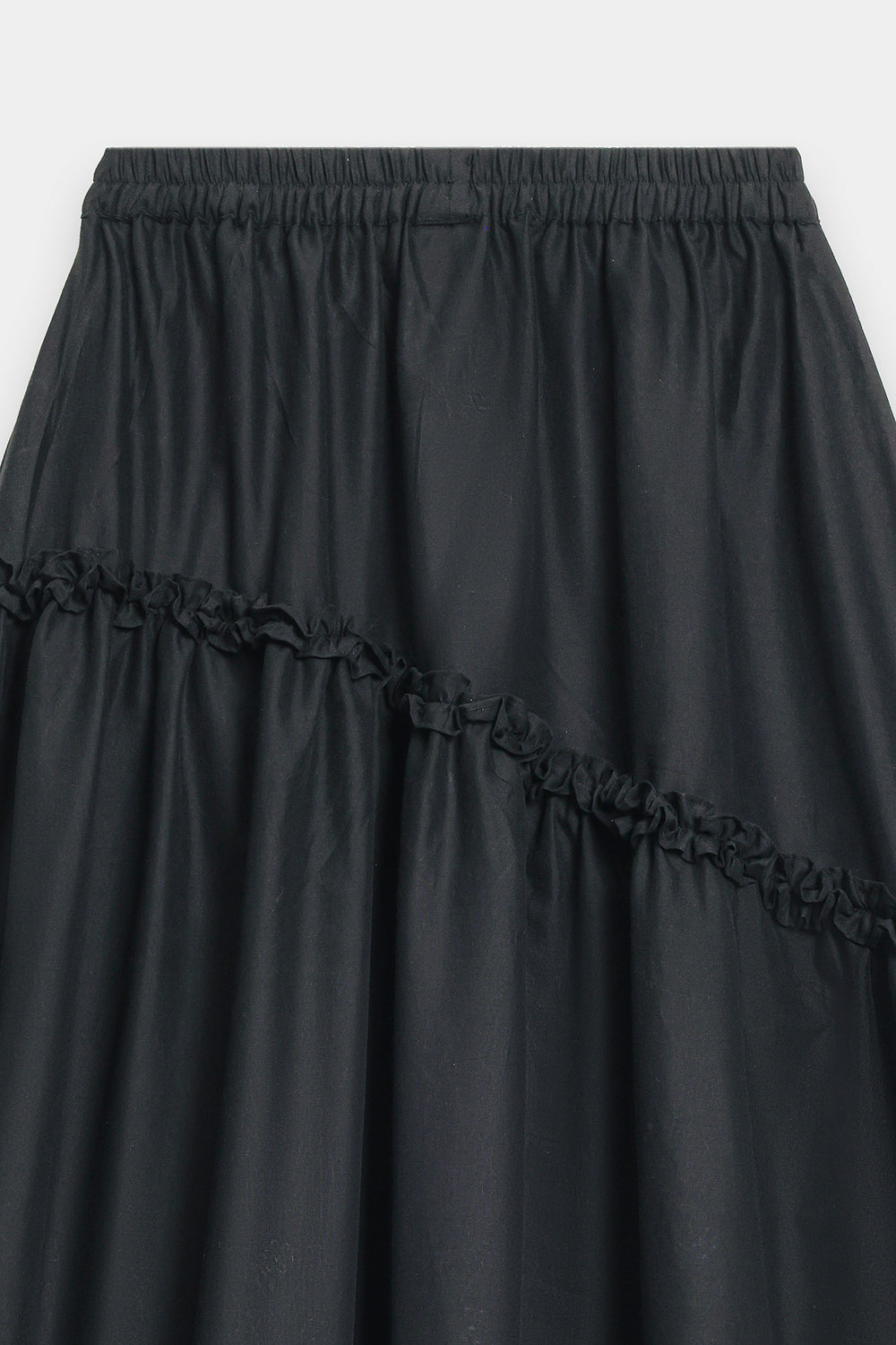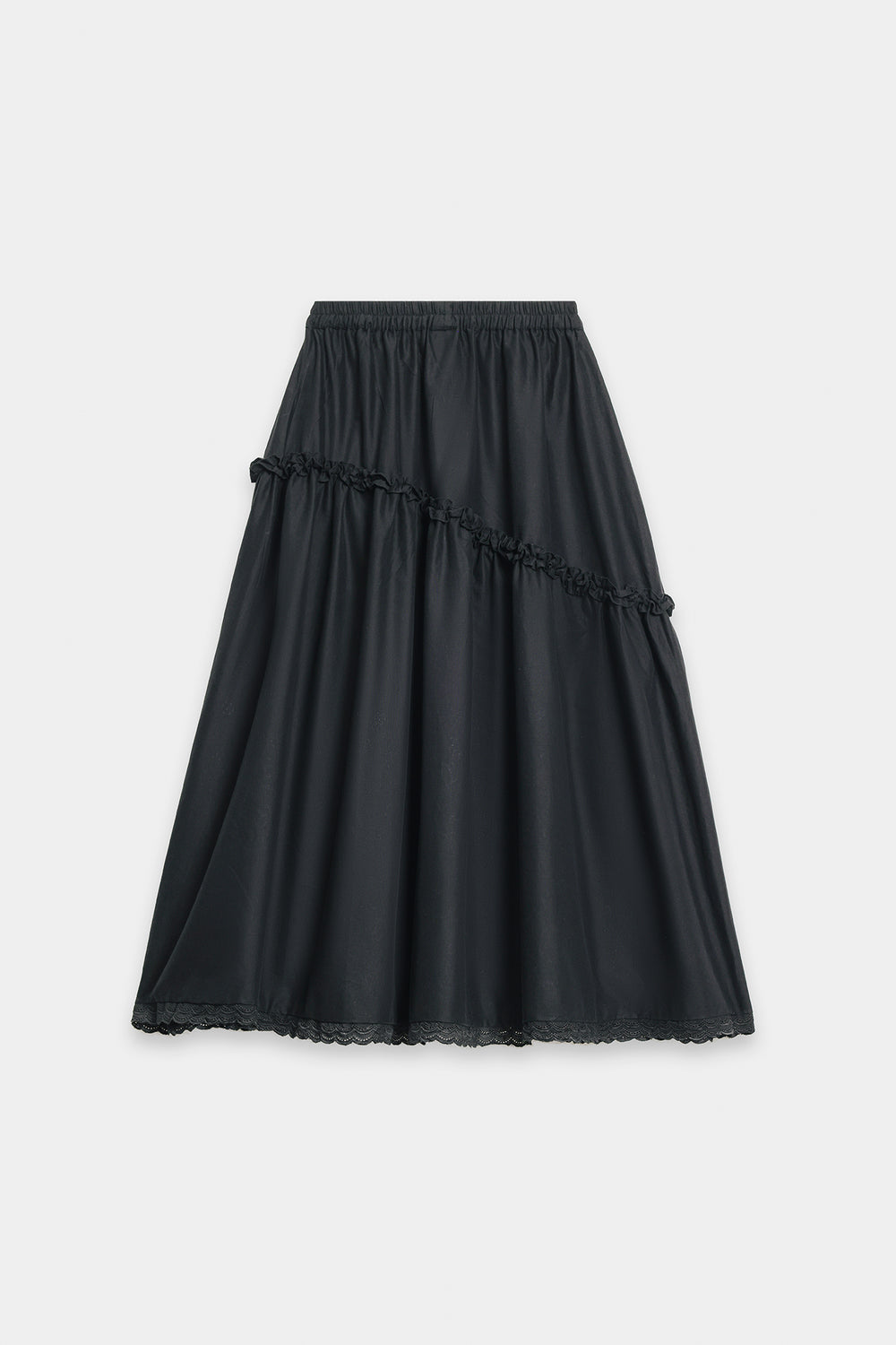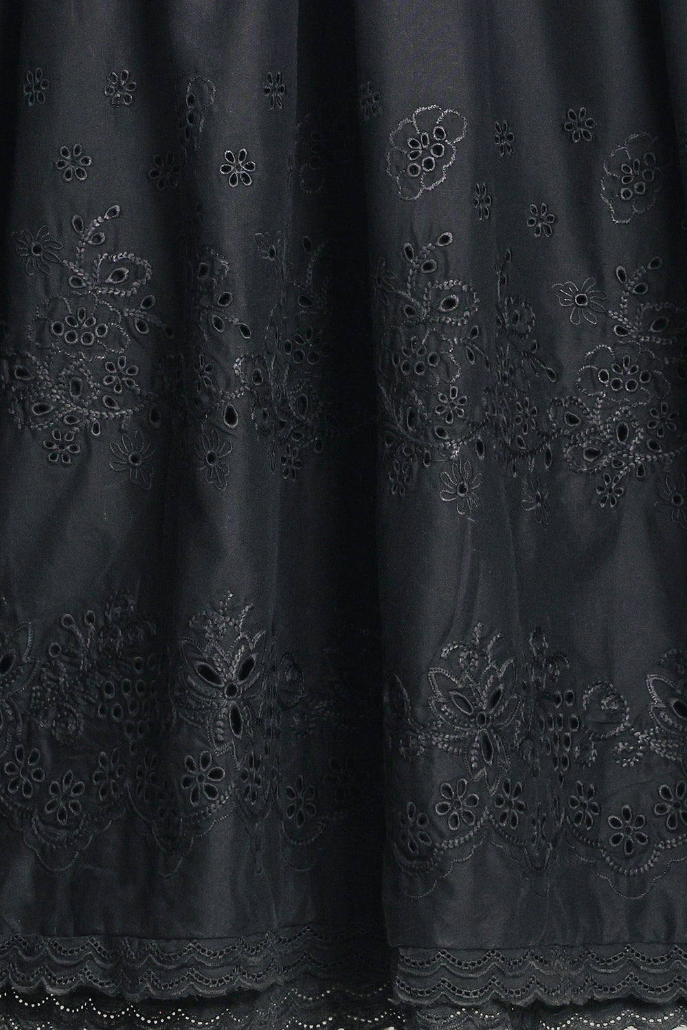 This sophisticated black skirt epitomizes refined elegance through its thoughtfully curated design elements. The classic A-line silhouette provides a flattering foundation, while intricate cut-out and lace detailing at the front and bottom opening. The flowing length ensures graceful movement, and a striking embroidered pattern along the front introduces an unexpected artistic dimension. Perfect for those who appreciate the marriage of timeless style with contemporary design flourishes, this piece transitions seamlessly for evening occasions.