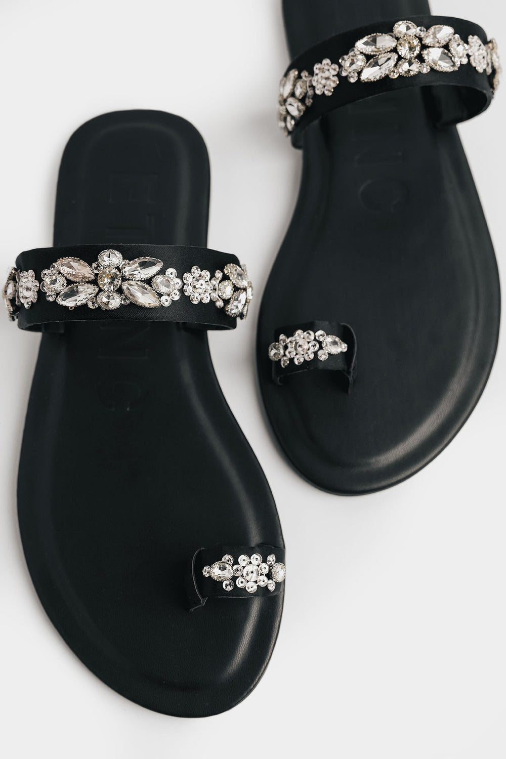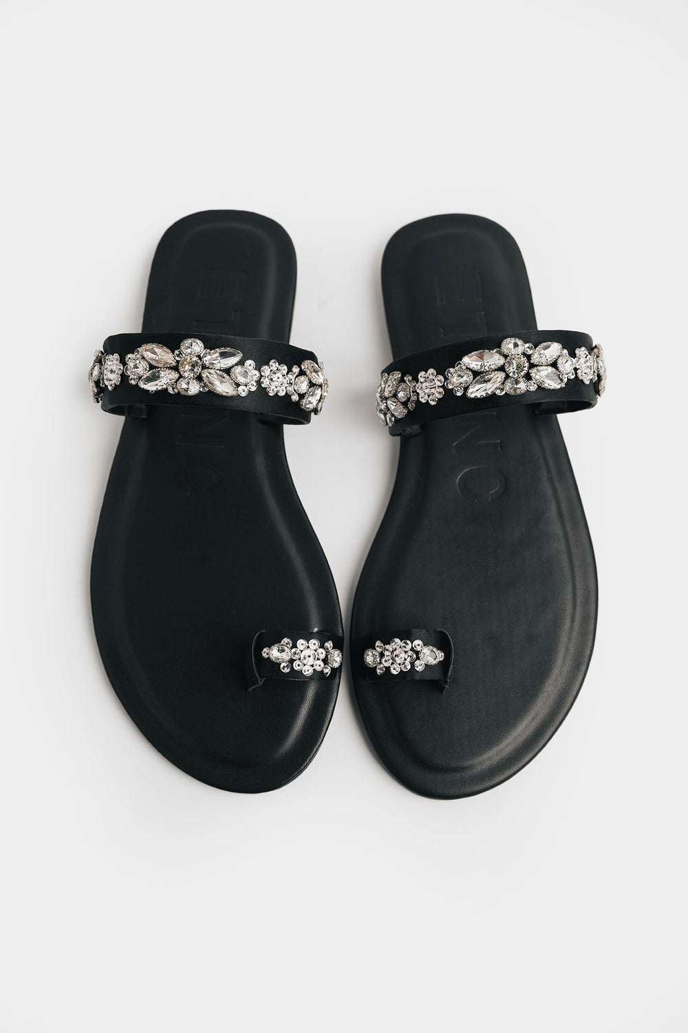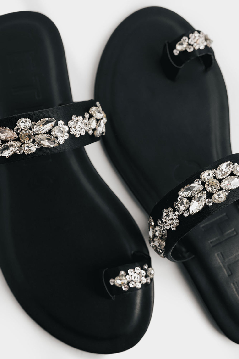 Adorned with shimmering crystal rhinestones and marquise-cut stones arranged in delicate floral and leaf patterns, they transform a classic silhouette into something truly special. The sleek black base lets the silver crystal steal the spotlight. A thoughtfully designed dual-strap system featuring a wide midfoot band paired with a dedicated big-toe loop that keeps you secure and stable with every step. Perfect for adding a touch of sparkle to your everyday look.