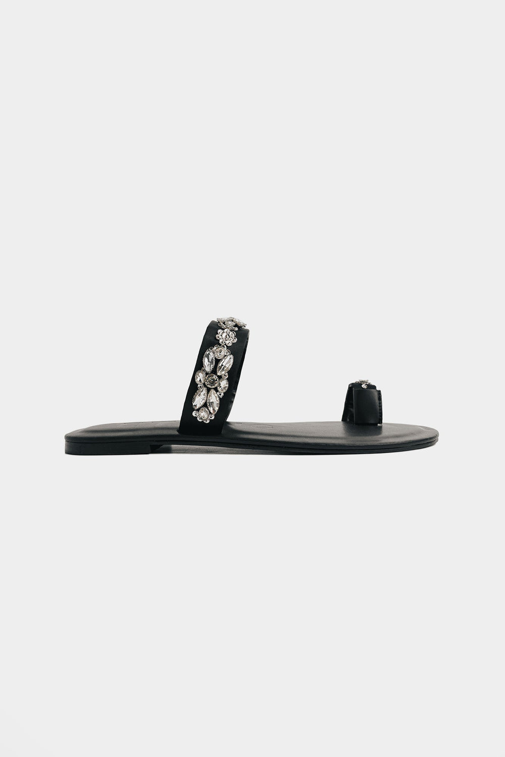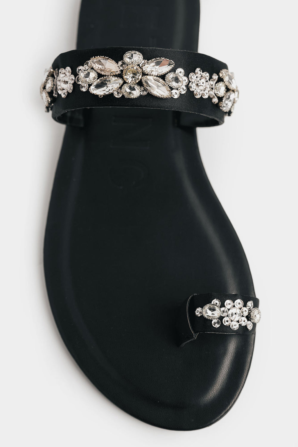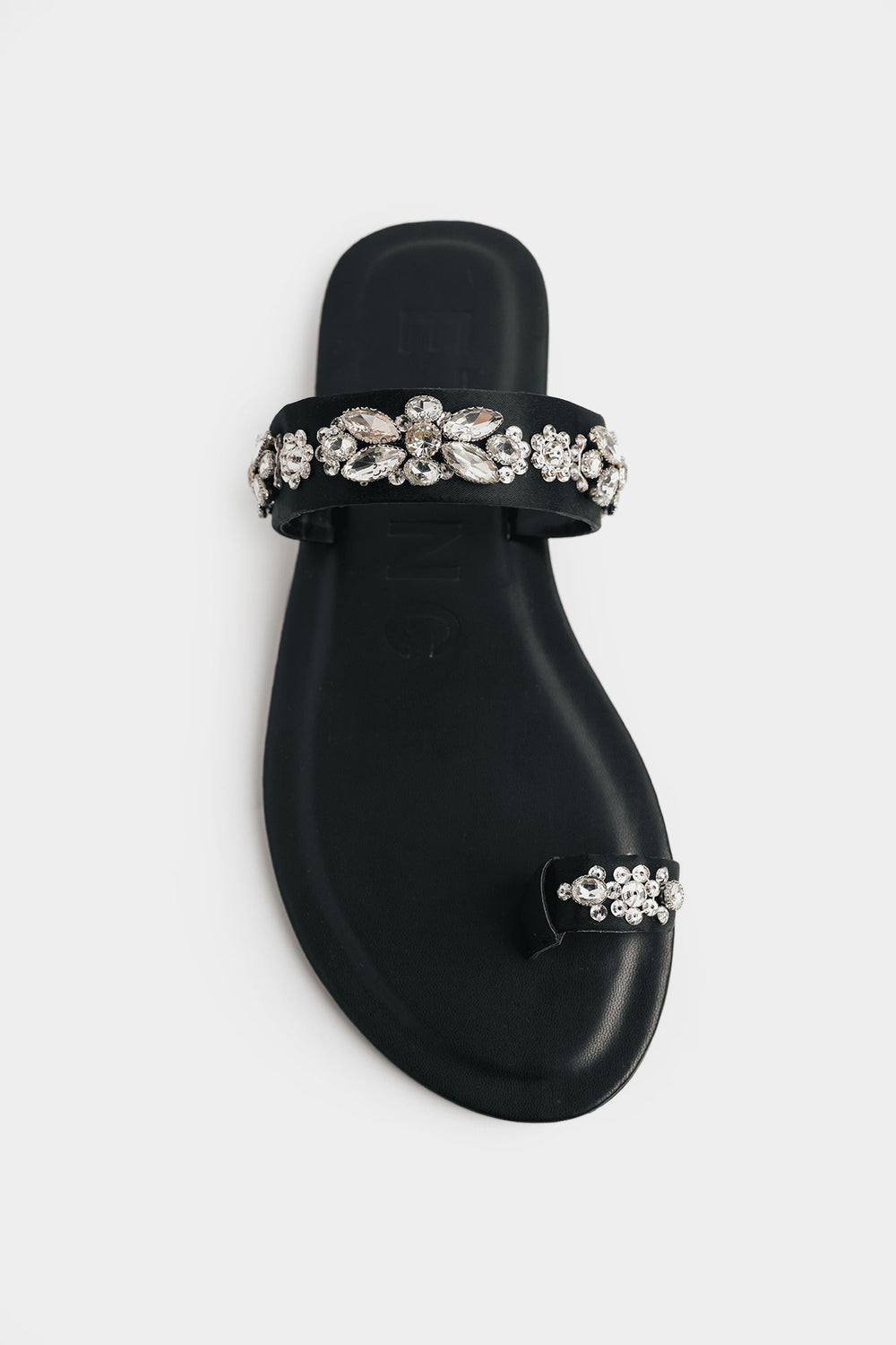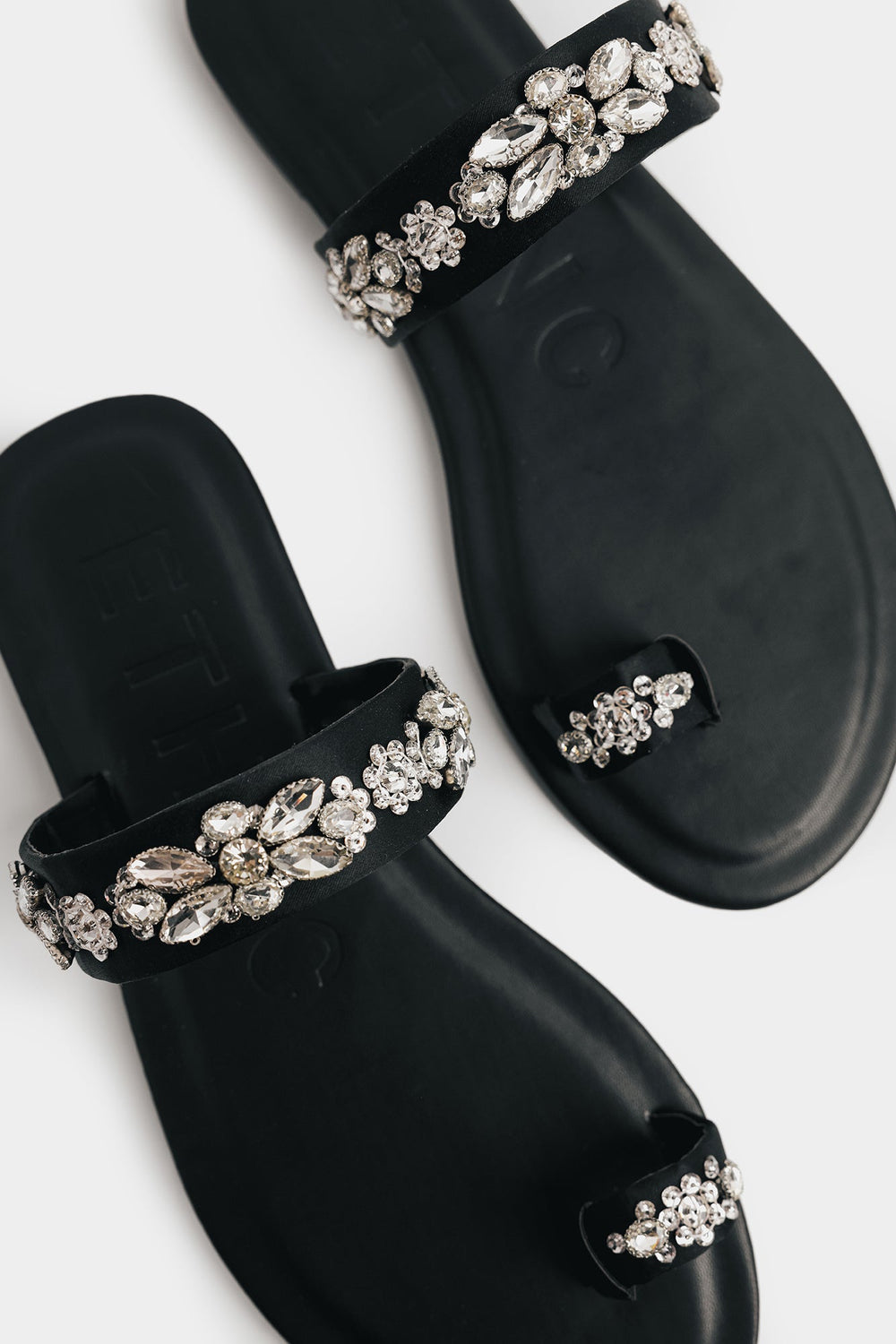 Adorned with shimmering crystal rhinestones and marquise-cut stones arranged in delicate floral and leaf patterns, they transform a classic silhouette into something truly special. The sleek black base lets the silver crystal steal the spotlight. A thoughtfully designed dual-strap system featuring a wide midfoot band paired with a dedicated big-toe loop that keeps you secure and stable with every step. Perfect for adding a touch of sparkle to your everyday look.