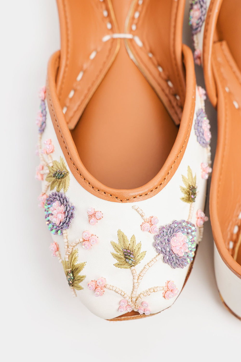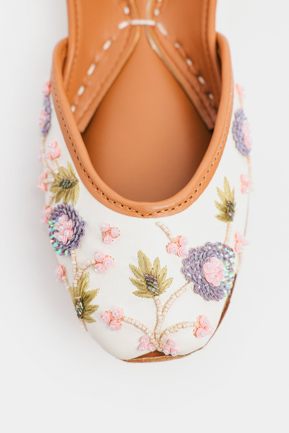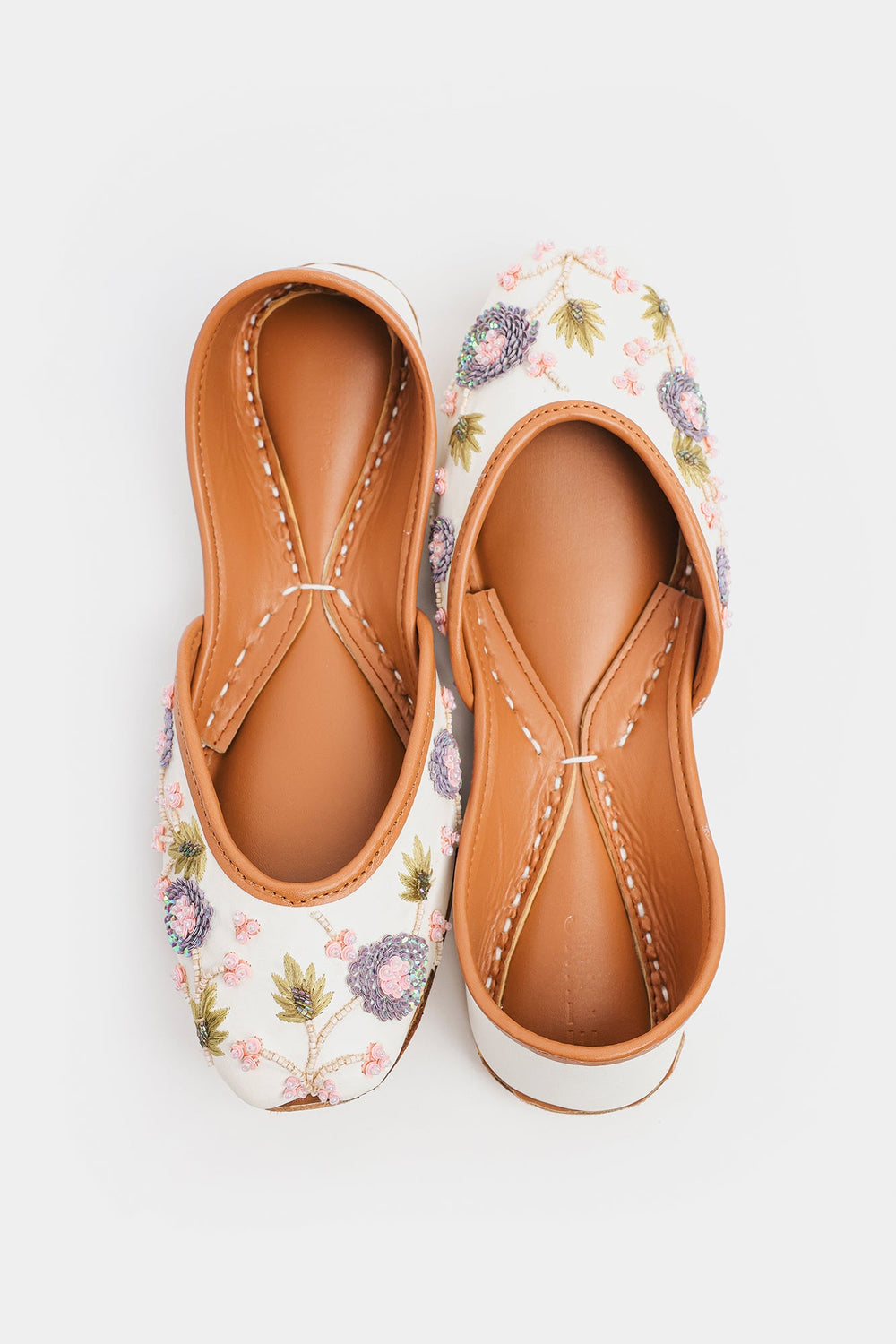 Embrace subtle sophistication with these beautifully handcrafted Khussa shoes. Set against a clean off-white canvas, delicate floral motifs with intricate beadwork bloom across the toe, featuring soft shades of lavender, sage green, and muted pink. Finished with the signature tan leather sole, these Khussa offer both elegance and comfort, making them the perfect accessory for adding a touch of serene, timeless charm to any festive or casual look.