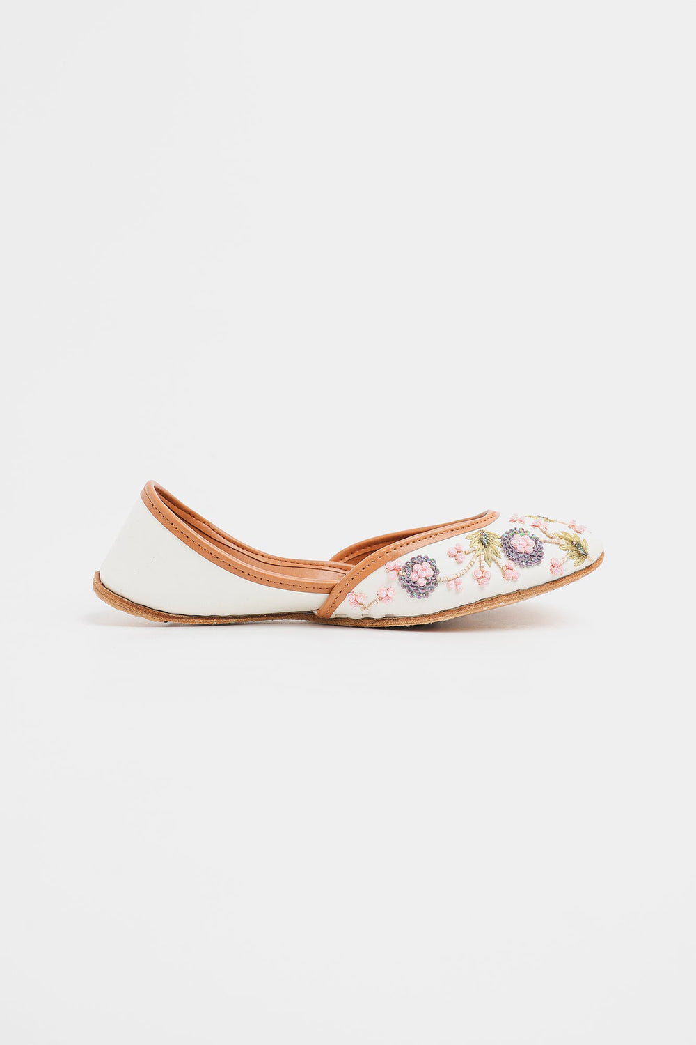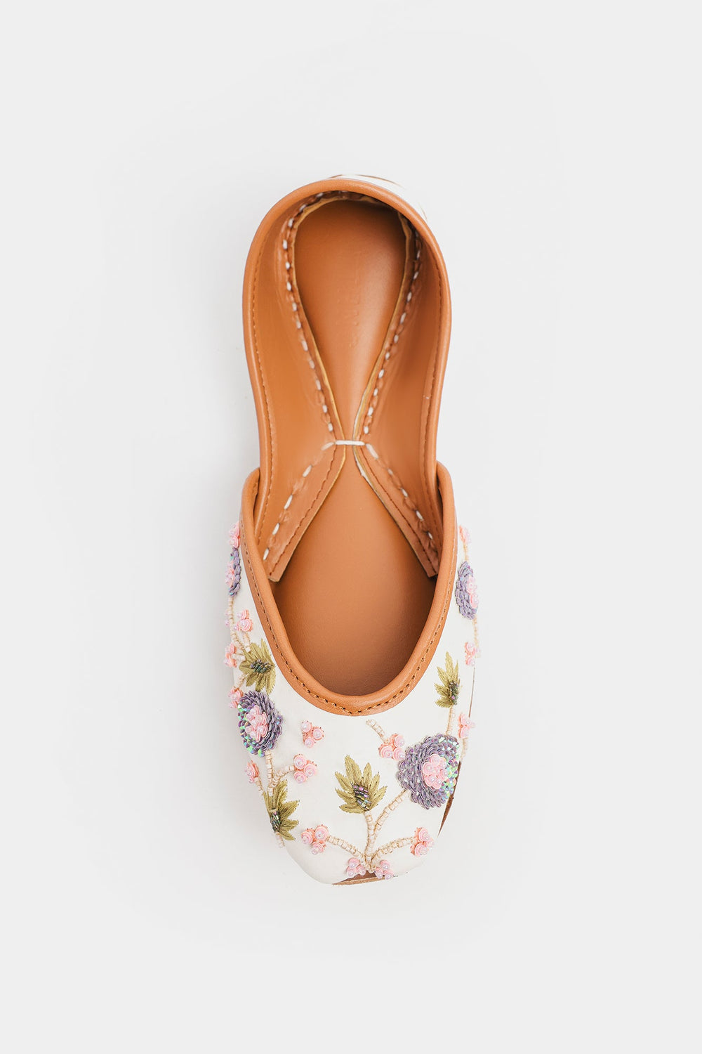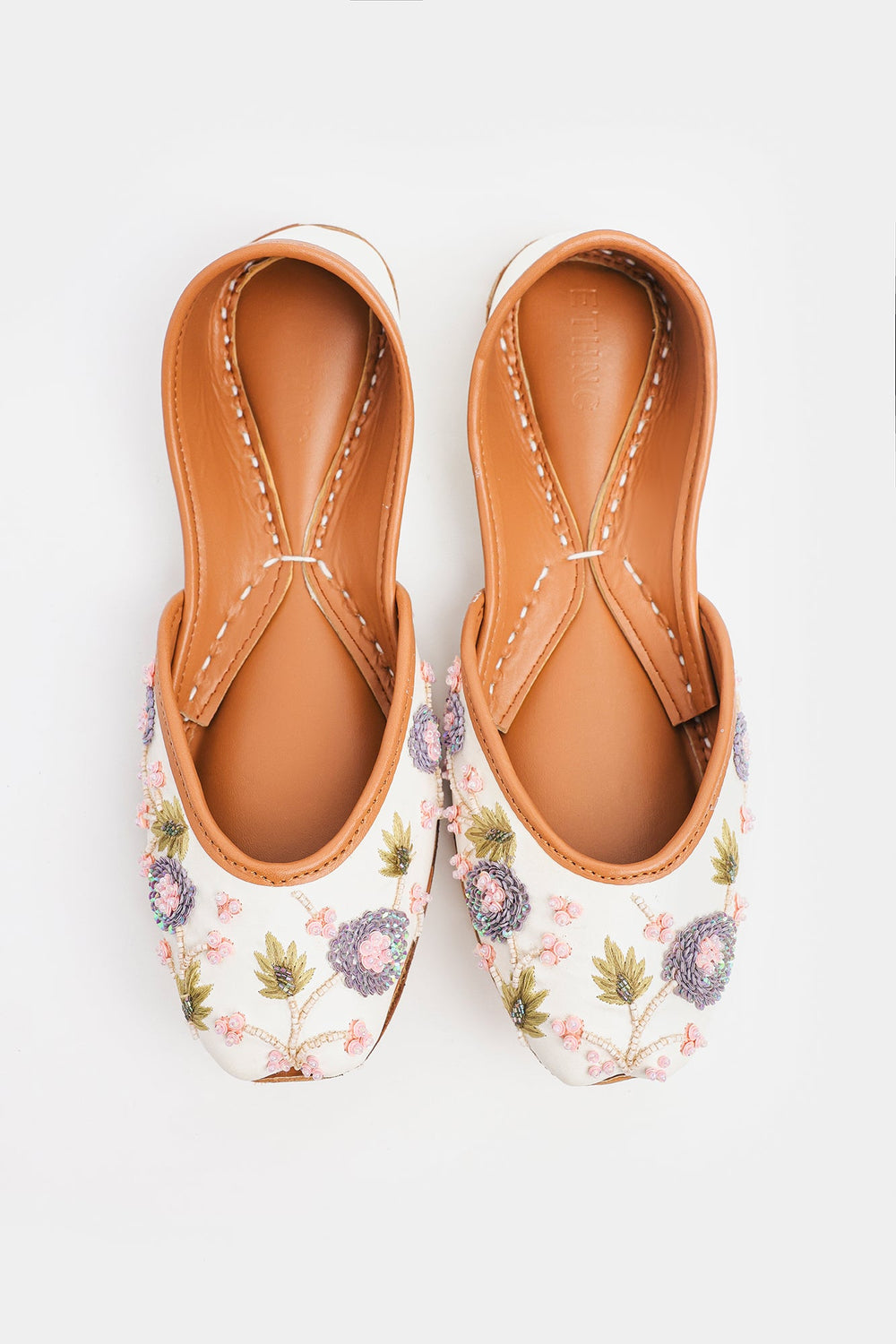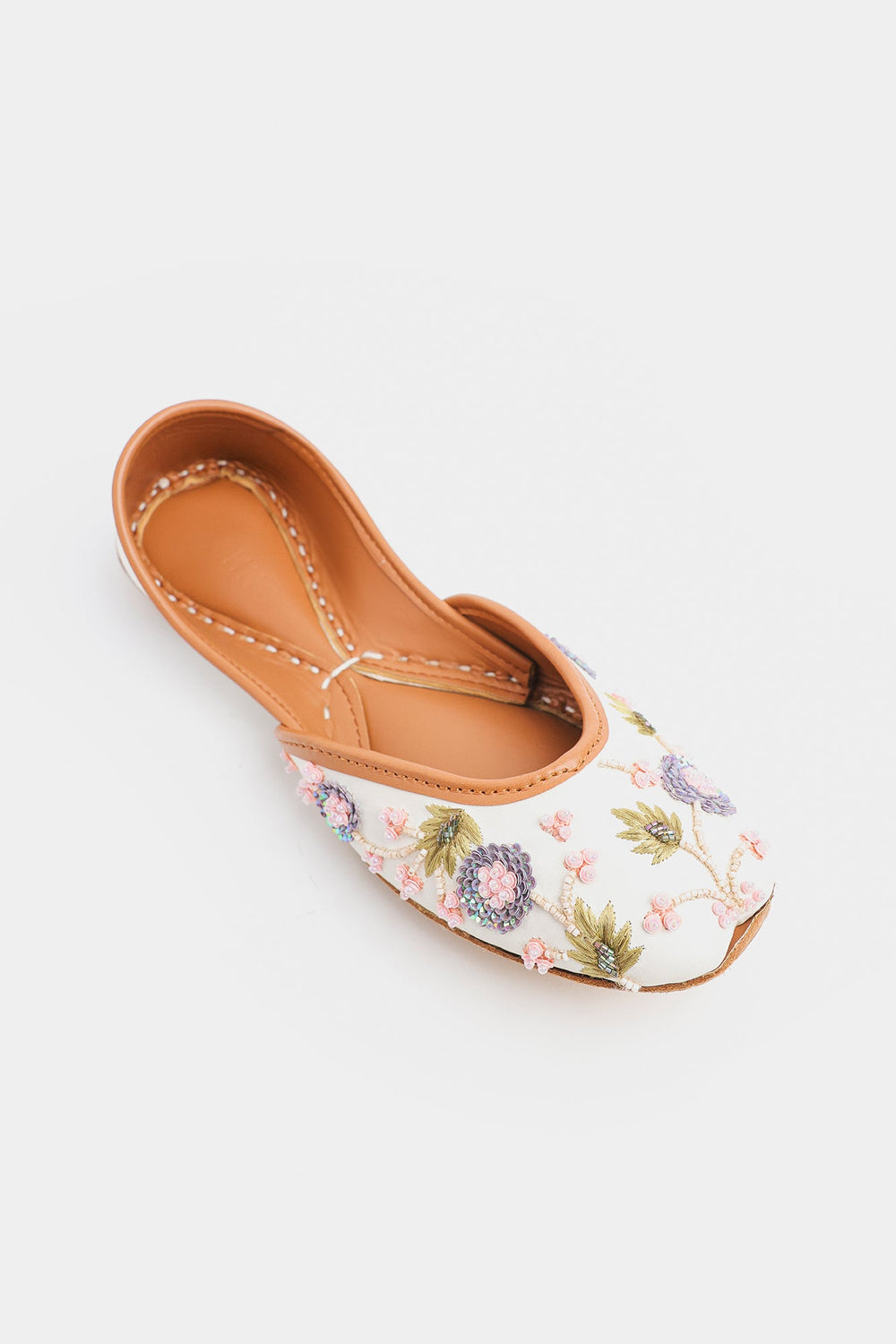 Embrace subtle sophistication with these beautifully handcrafted Khussa shoes. Set against a clean off-white canvas, delicate floral motifs with intricate beadwork bloom across the toe, featuring soft shades of lavender, sage green, and muted pink. Finished with the signature tan leather sole, these Khussa offer both elegance and comfort, making them the perfect accessory for adding a touch of serene, timeless charm to any festive or casual look.