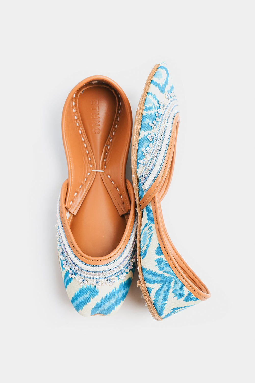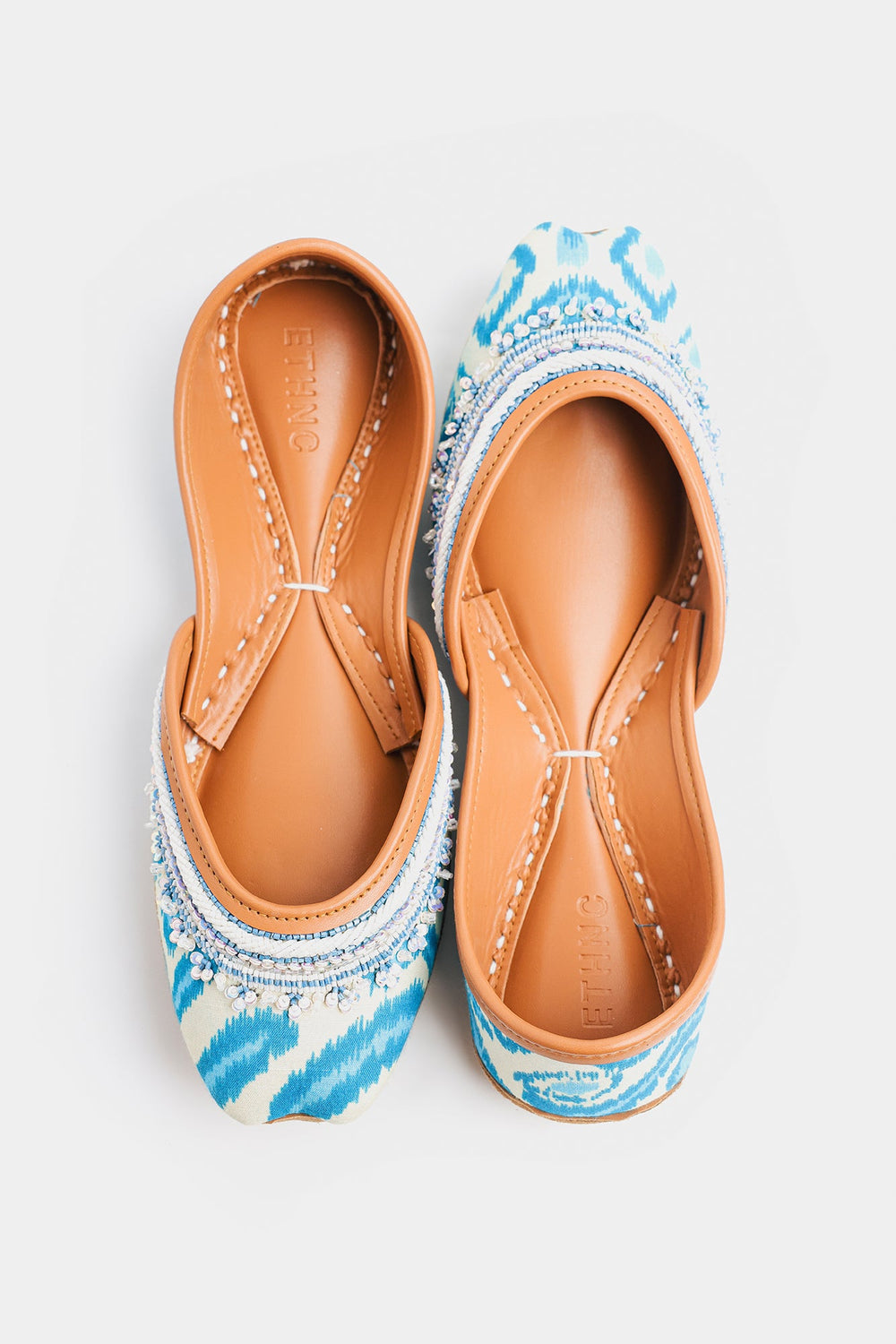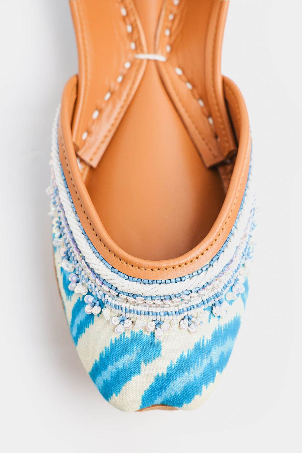 Dive into cool elegance with these striking Ikat-print Khussas. The fabric base features a contemporary blue and white Ikat pattern, giving a modern geometric flair to the traditional design. The toe is beautifully framed by intricate, embellishments, including layers of silver and white seed beads that add a subtle shimmer and rich texture. This blend of abstract print and sparkling detail creates a captivating fusion of styles. Finished with the comfortable tan leather sole and lining, these Khussas are a unique, eye-catching addition to any wardrobe.