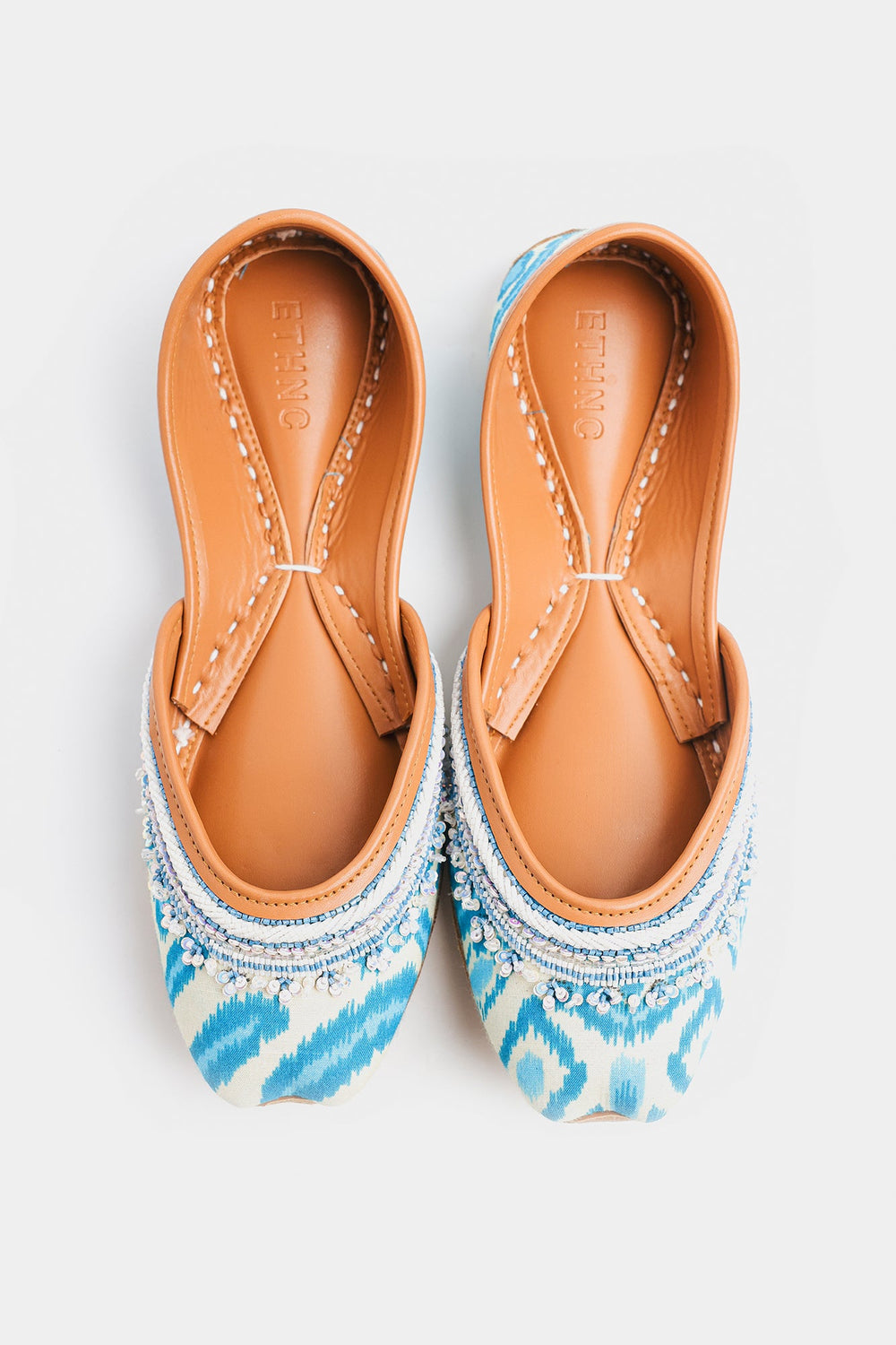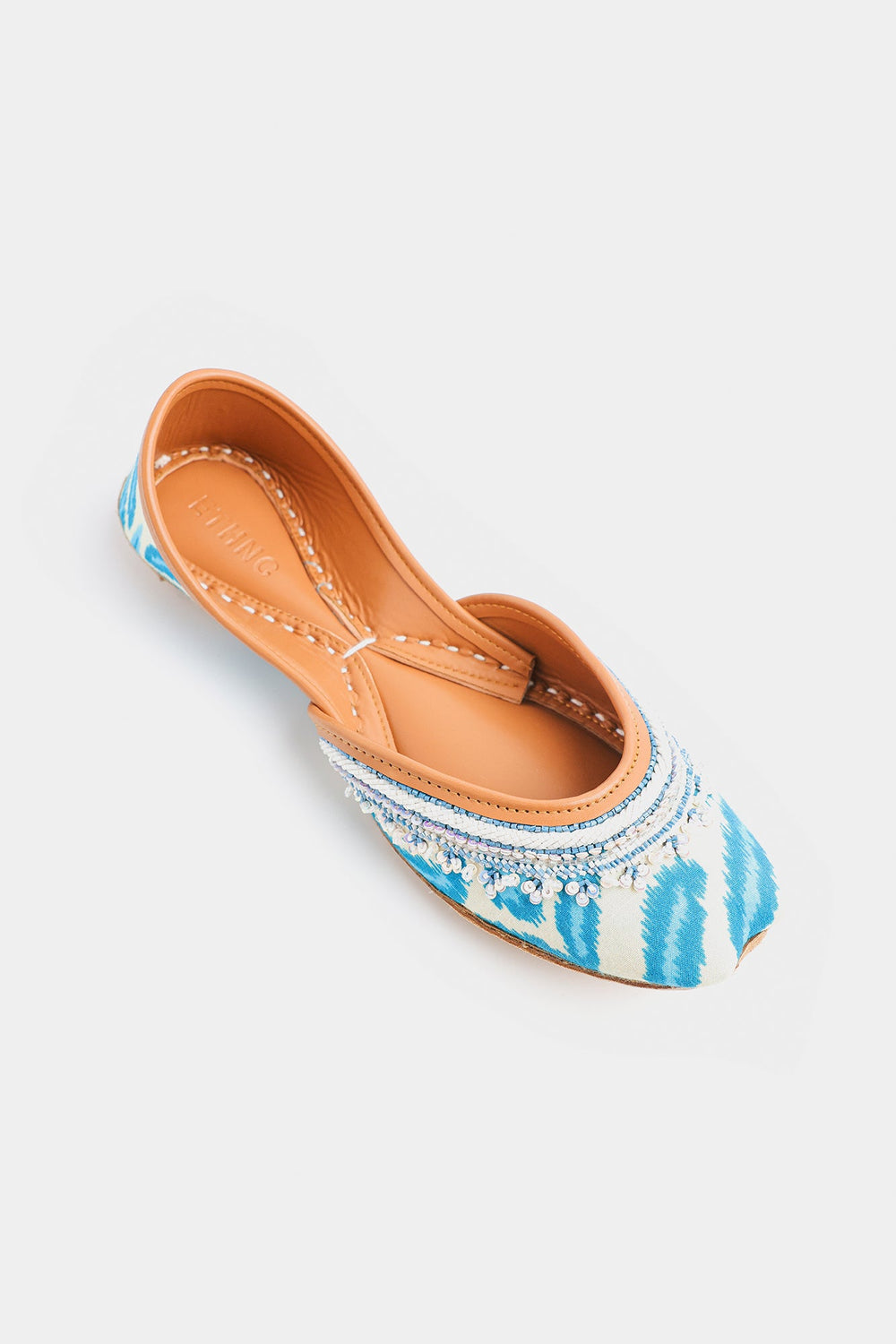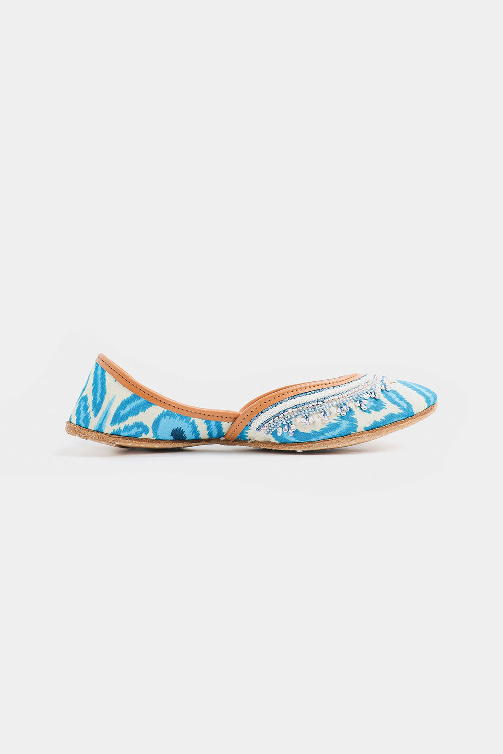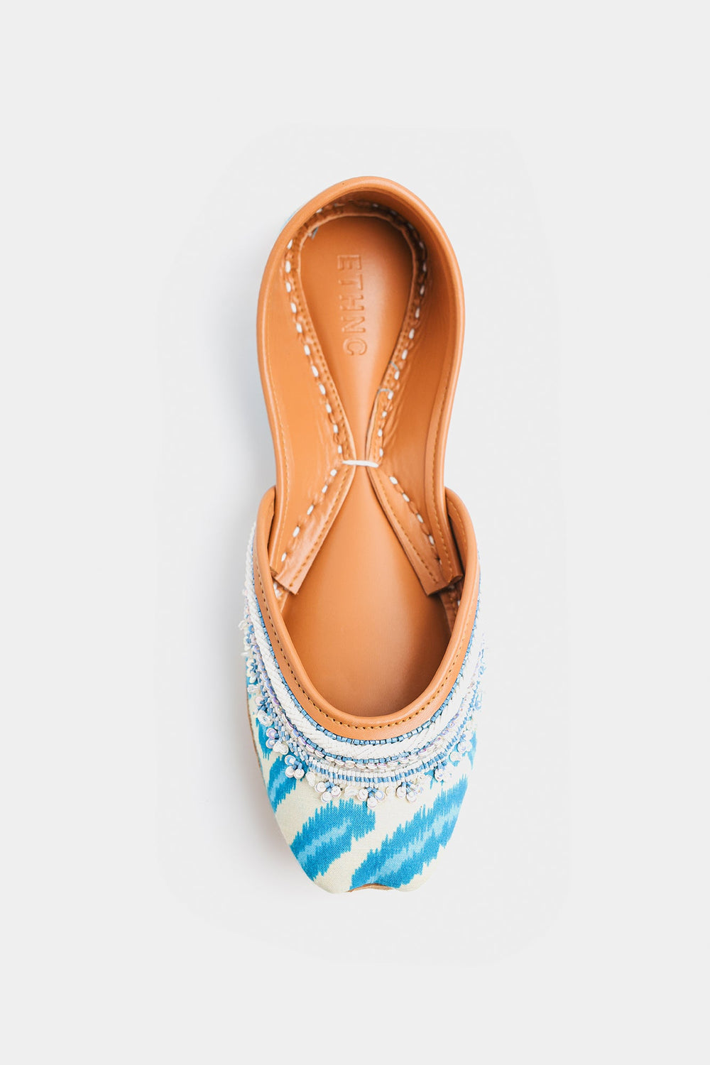 Dive into cool elegance with these striking Ikat-print Khussas. The fabric base features a contemporary blue and white Ikat pattern, giving a modern geometric flair to the traditional design. The toe is beautifully framed by intricate, embellishments, including layers of silver and white seed beads that add a subtle shimmer and rich texture. This blend of abstract print and sparkling detail creates a captivating fusion of styles. Finished with the comfortable tan leather sole and lining, these Khussas are a unique, eye-catching addition to any wardrobe.