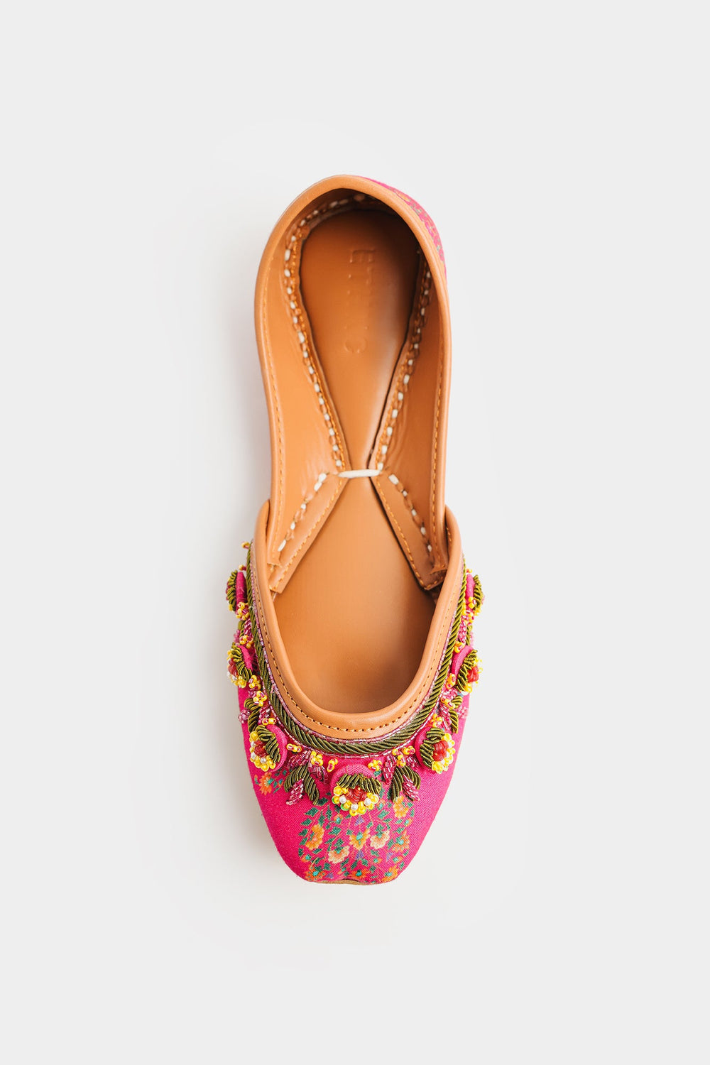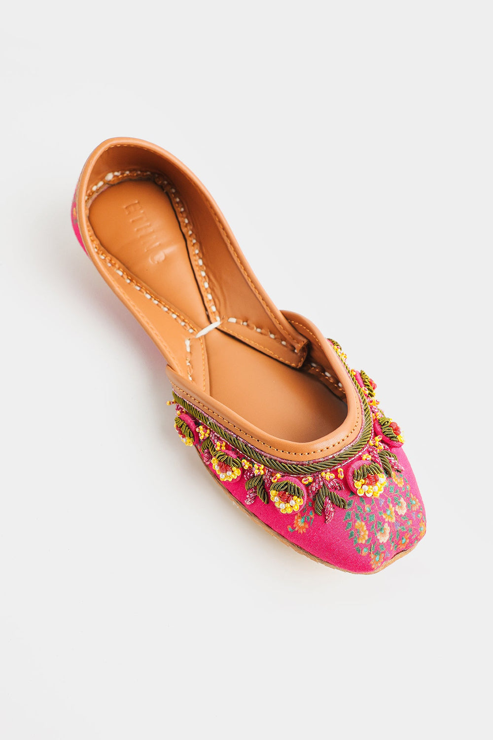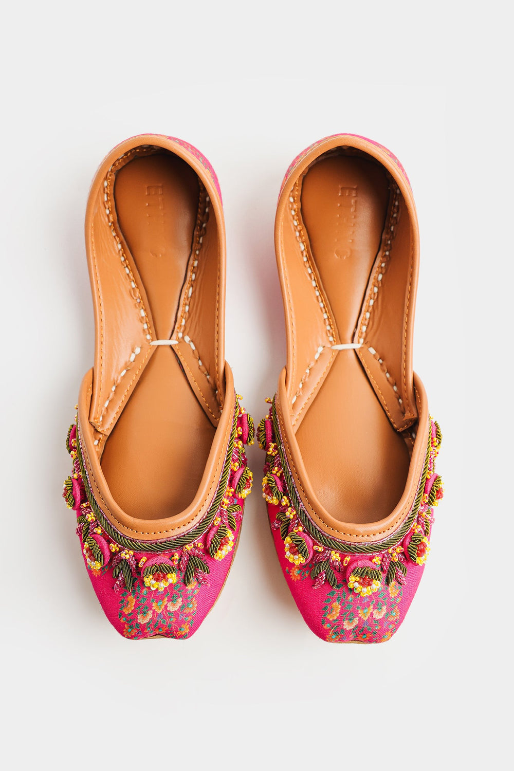 Handcrafted with intricate detail, these Khussas are a celebration of vibrant color and traditional artistry. The rich fuchsia fabric is adorned with delicate floral embroidery in shades of green and yellow. A playful fringe of pink and green beaded tassels adorn the edges, adding a touch of whimsical charm. The classic tan leather sole ensures both comfort and style, making these Khussas perfect for adding a pop of joyful elegance to any outfit.