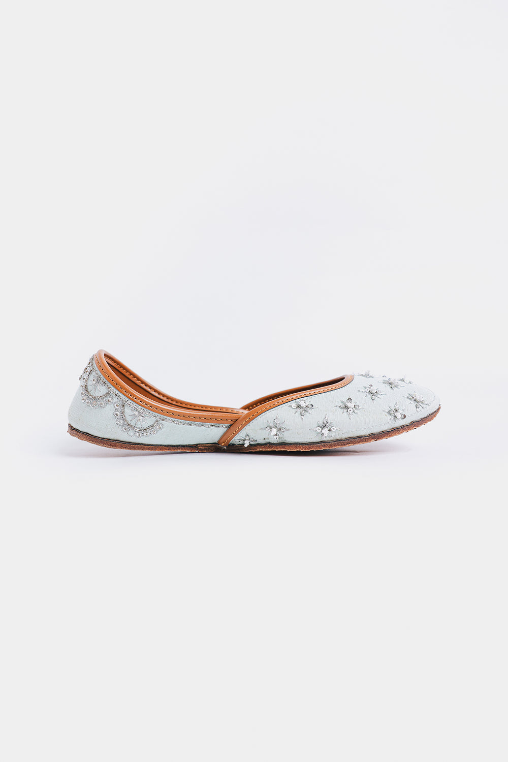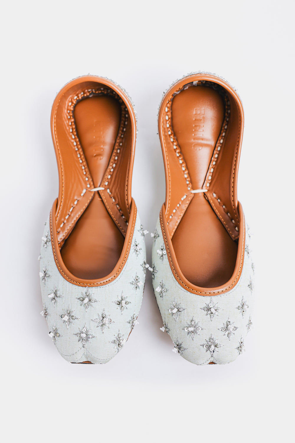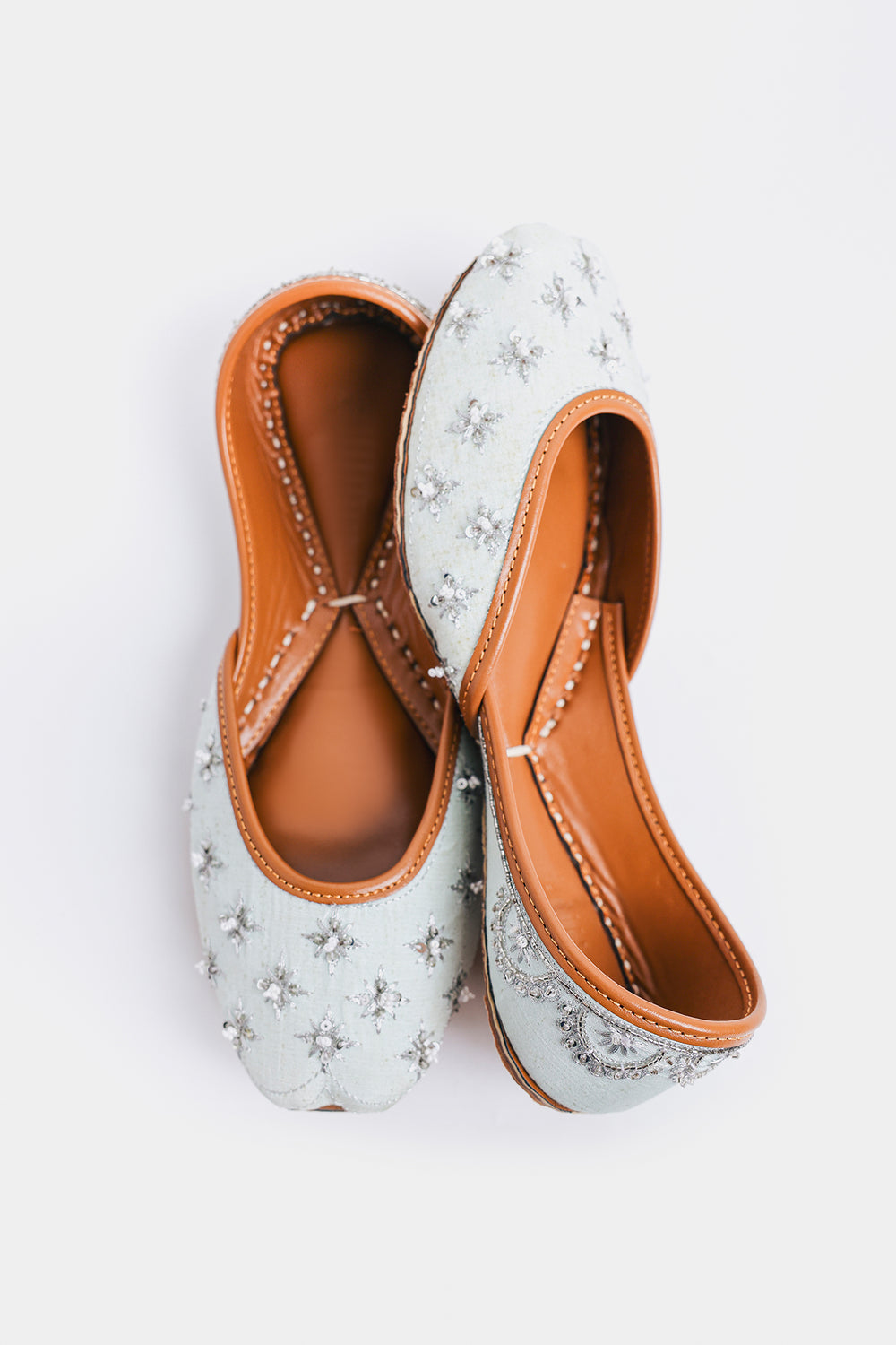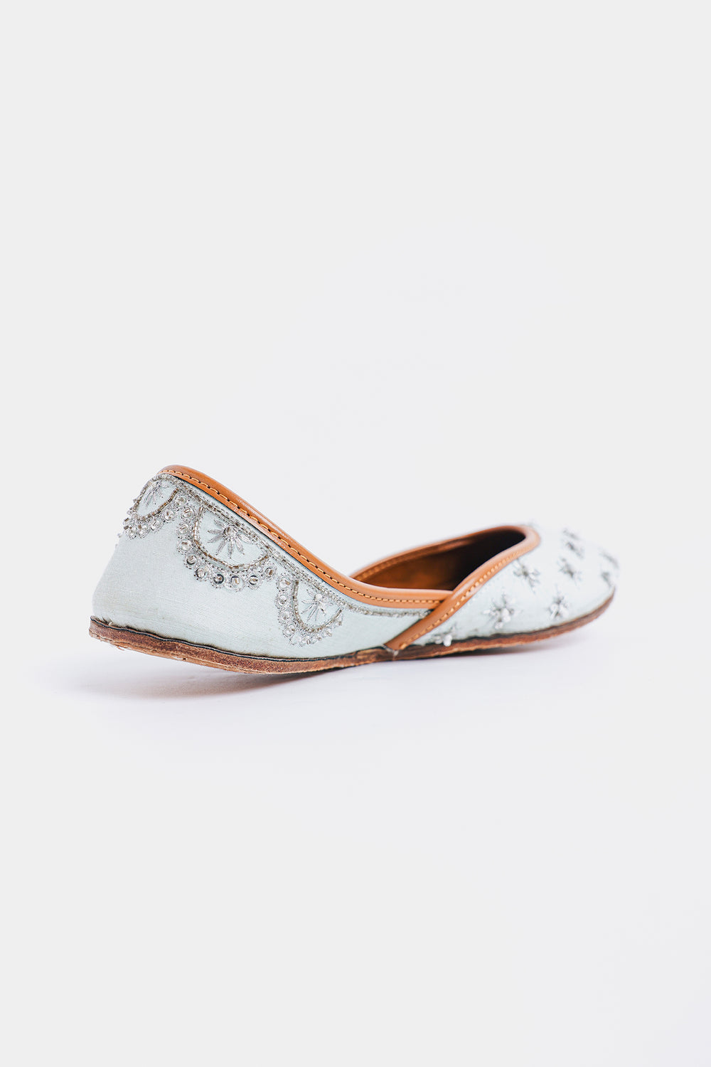 Light aqua khussa crafted with meticulous attention to detail, featuring elegant embellishments that elevate traditional footwear design. This versatile style seamlessly transitions from casual wear to formal occasions, offering comfort without compromising on aesthetic appeal. The soft aqua hue provides a refreshing alternative to conventional colors, while intricate embroidery and decorative elements showcase authentic craftsmanship.