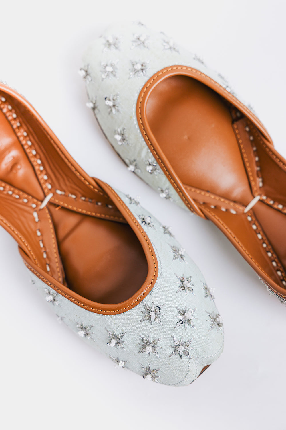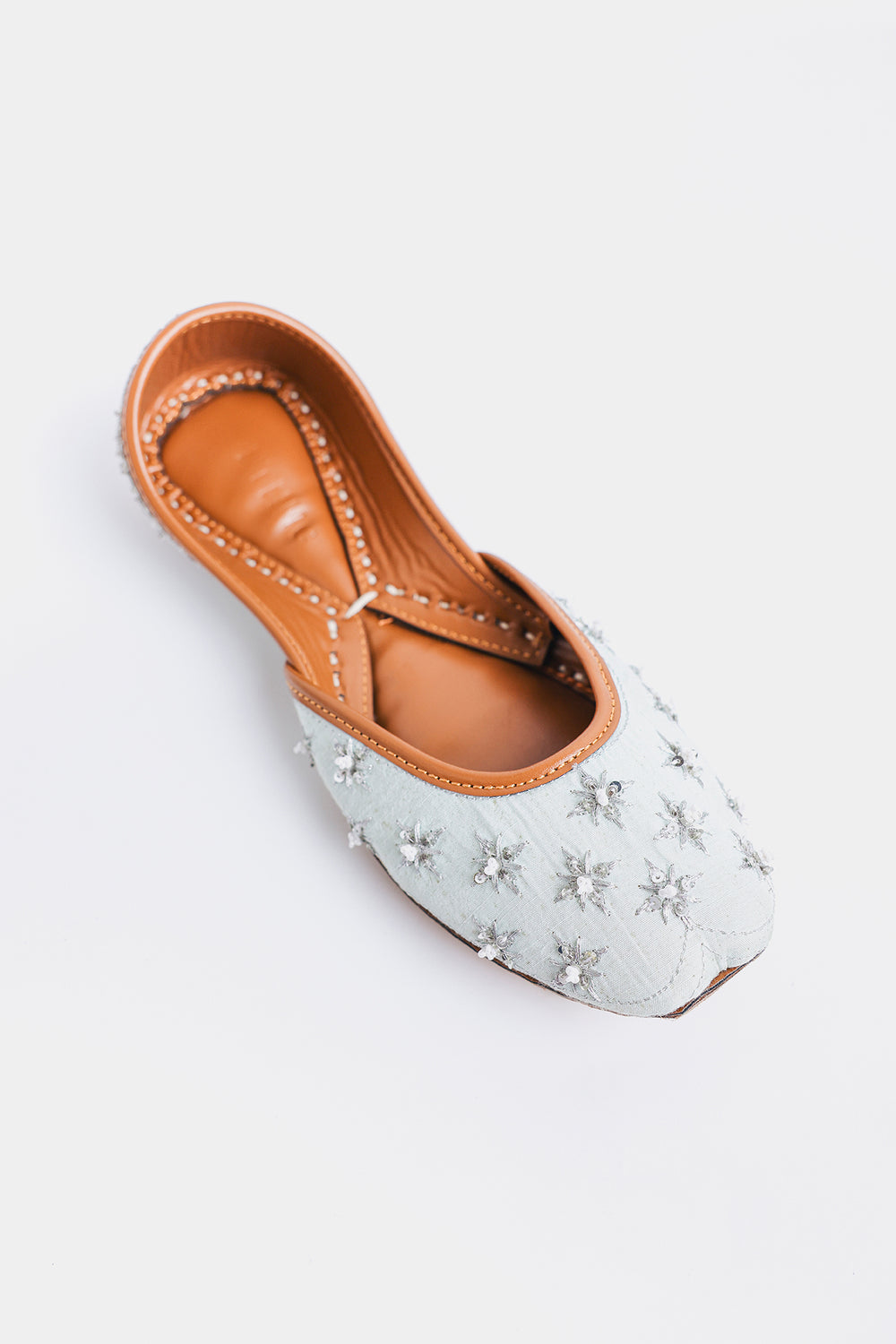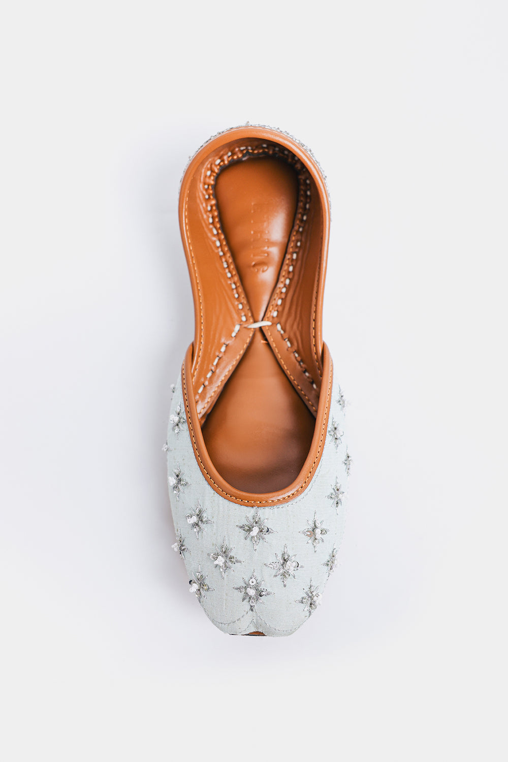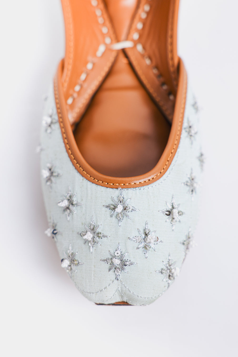 Light aqua khussa crafted with meticulous attention to detail, featuring elegant embellishments that elevate traditional footwear design. This versatile style seamlessly transitions from casual wear to formal occasions, offering comfort without compromising on aesthetic appeal. The soft aqua hue provides a refreshing alternative to conventional colors, while intricate embroidery and decorative elements showcase authentic craftsmanship.