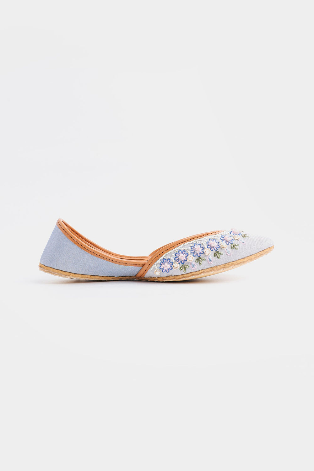 This elegant khussa features a classy design rendered in dusty blue color and adorned with floral designs embroidered in mesmerizing colors. Beautifully embellished with beads, the unique design and quality materials make it a must-have for any fashion-savvy individual.