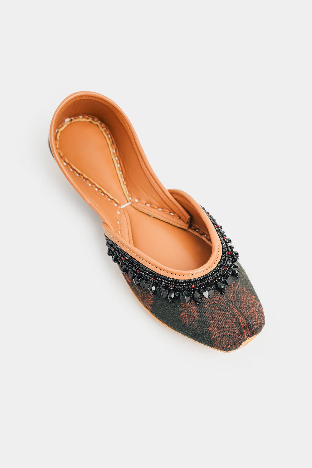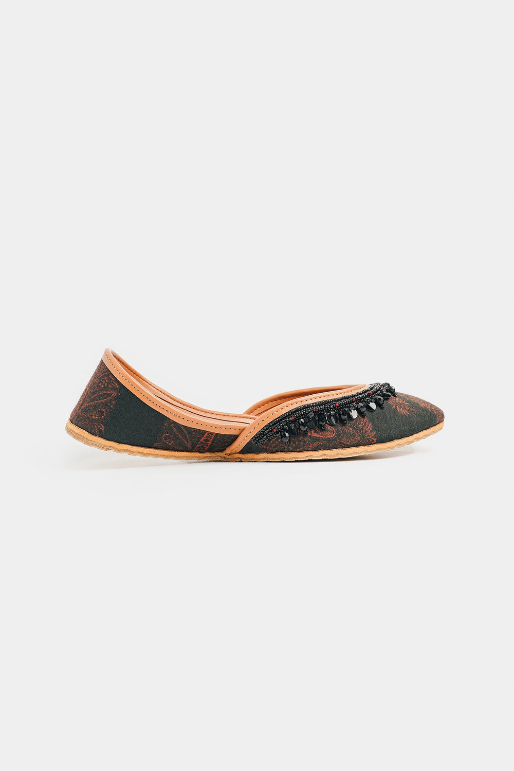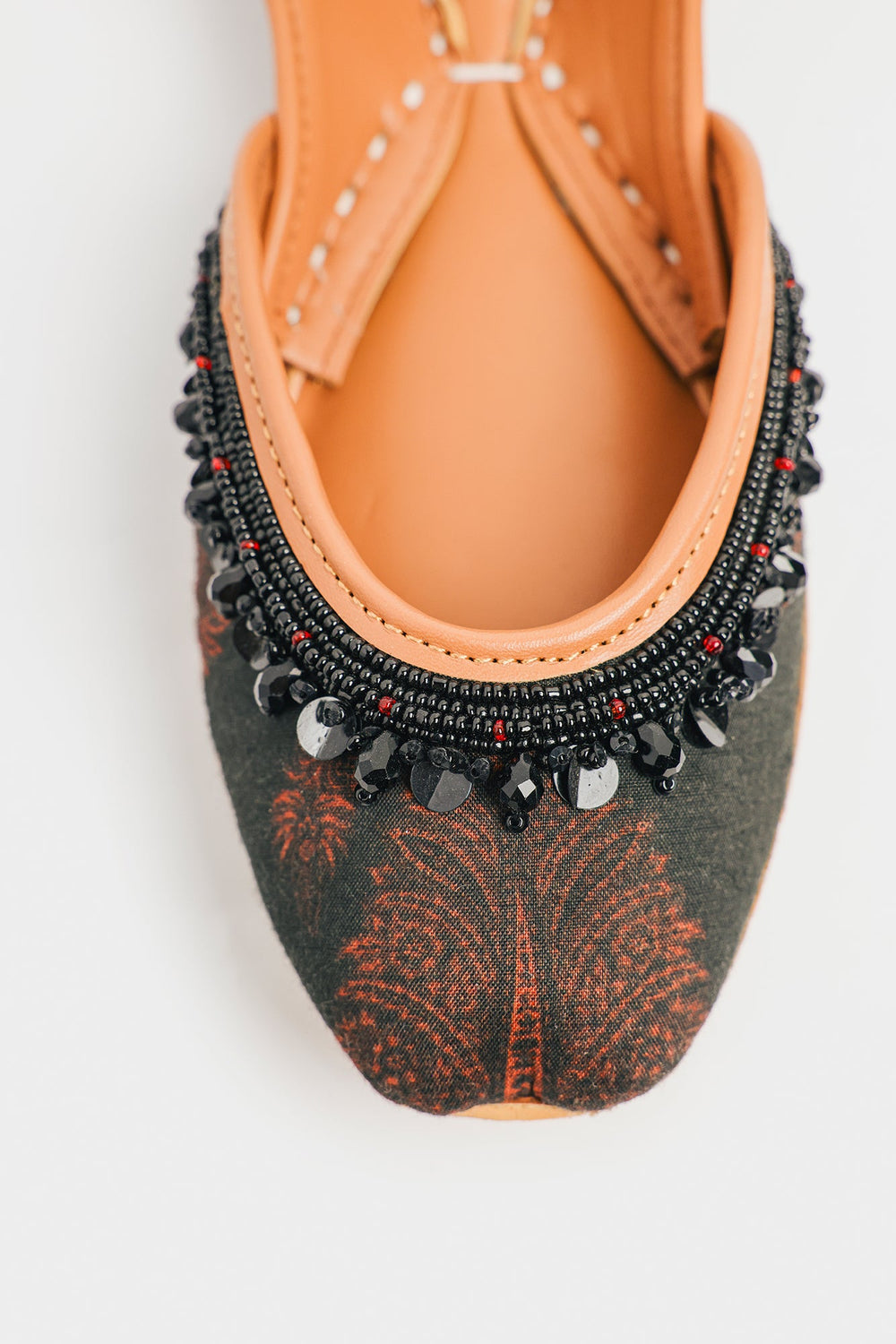 Crafted with a rich black base, these shoes feature a striking red pattern that adds a unique pop of color and texture. The design is elevated by intricate black beading and shimmering sequins that adorn the edges, creating a glamorous yet sophisticated look. The soft leather lining and cushioned insole ensure a comfortable fit. Perfect for adding a touch of drama to any outfit, these khussas are a versatile accessory for both casual and formal occasions.