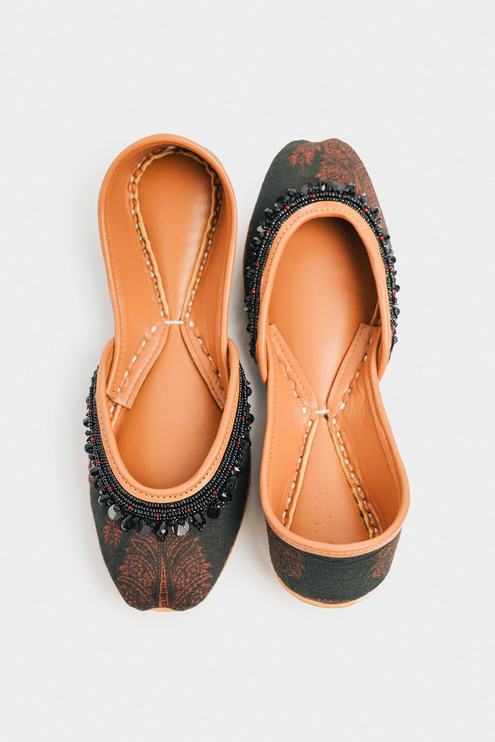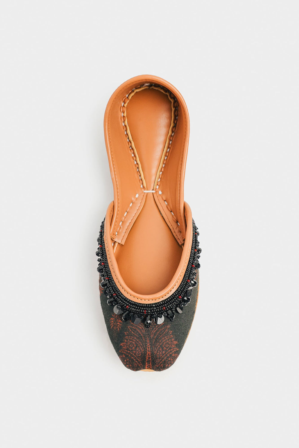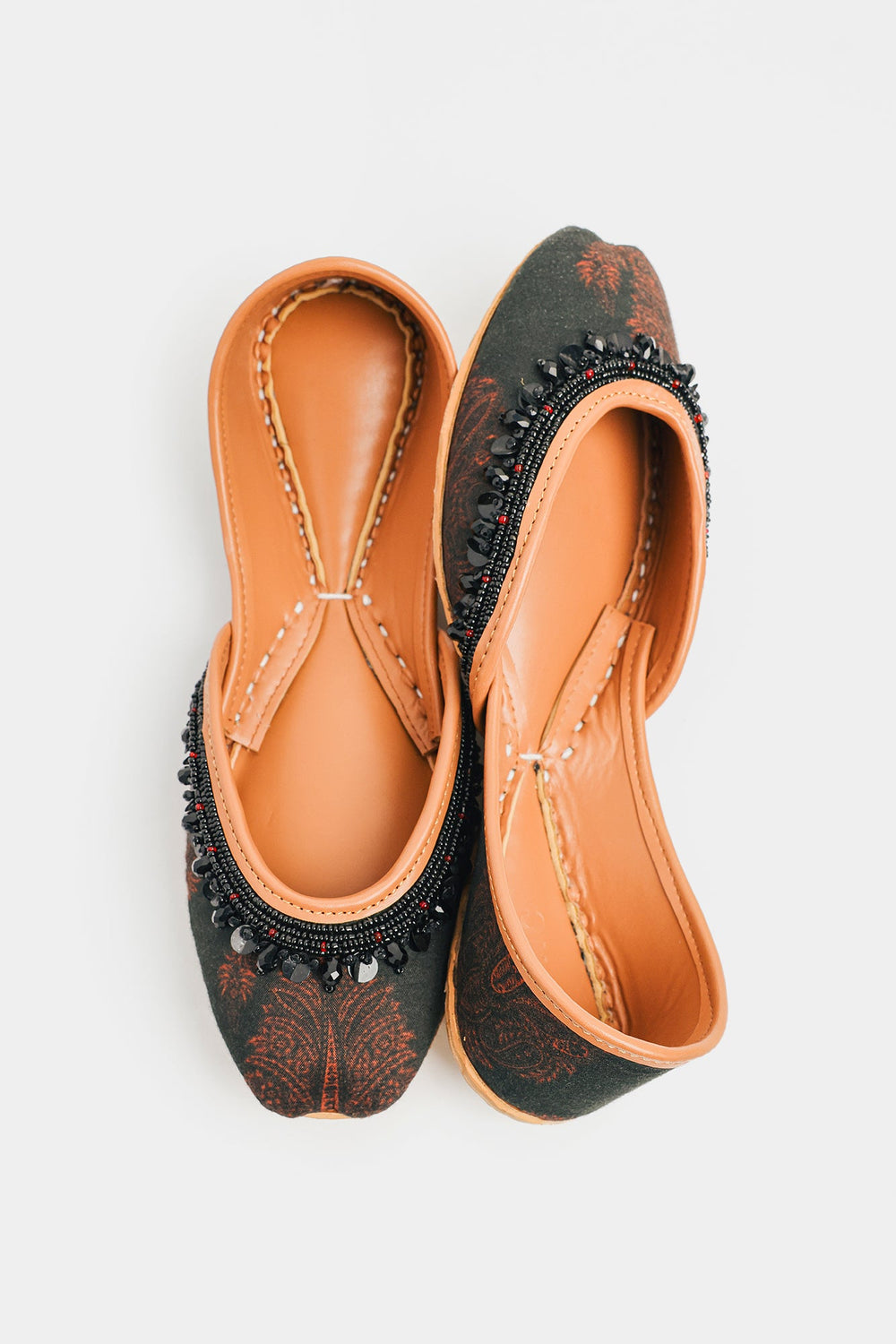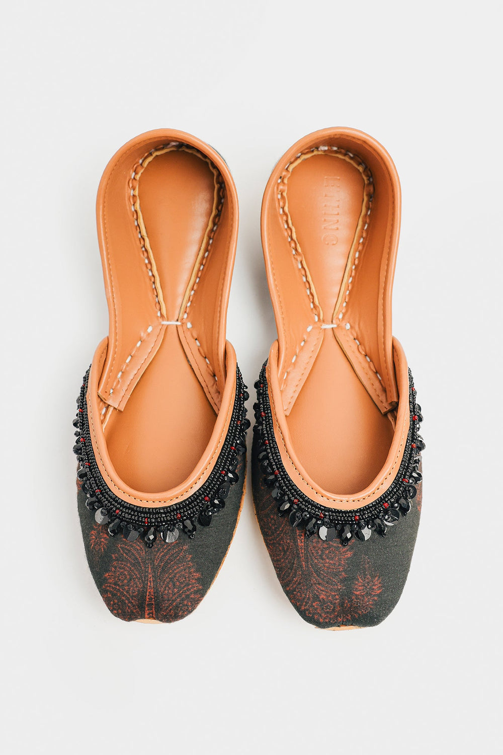 Crafted with a rich black base, these shoes feature a striking red pattern that adds a unique pop of color and texture. The design is elevated by intricate black beading and shimmering sequins that adorn the edges, creating a glamorous yet sophisticated look. The soft leather lining and cushioned insole ensure a comfortable fit. Perfect for adding a touch of drama to any outfit, these khussas are a versatile accessory for both casual and formal occasions.