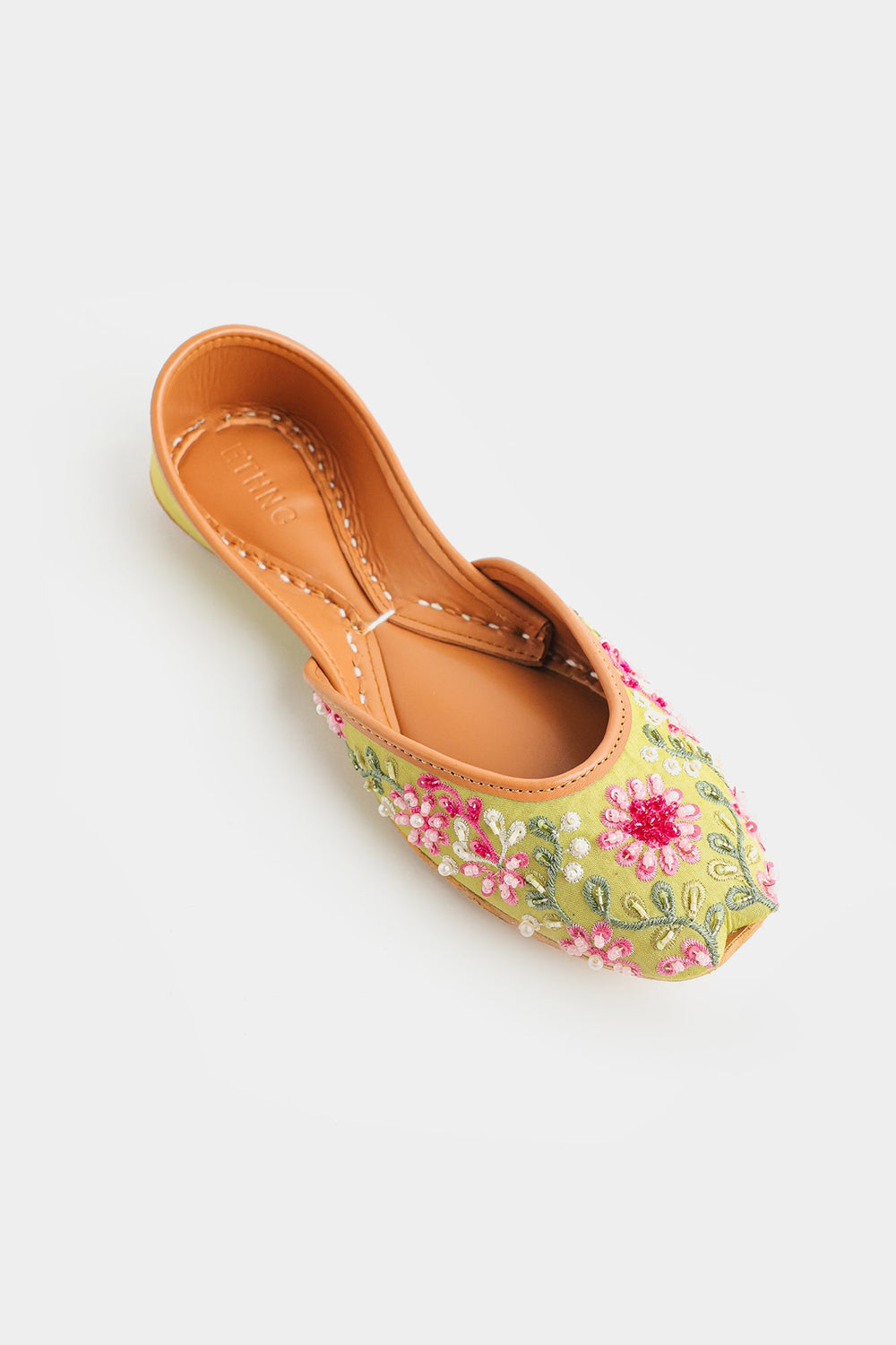 Handcrafted with a refreshing pastel palette, these Khussas are a tribute to traditional elegance. The light sage green fabric serves as a beautiful canvas for the vibrant floral embroidery, featuring stunning pink flowers with intricate stitchwork. The design is further enhanced by delicate pink and white beads that create a sparkling border and add dimension to the floral motifs. With a comfortable tan leather sole, these shoes are a perfect blend of timeless artistry and modern charm.