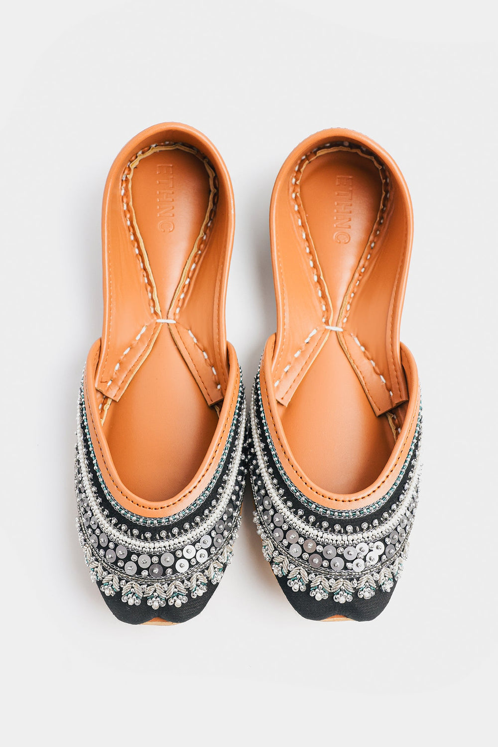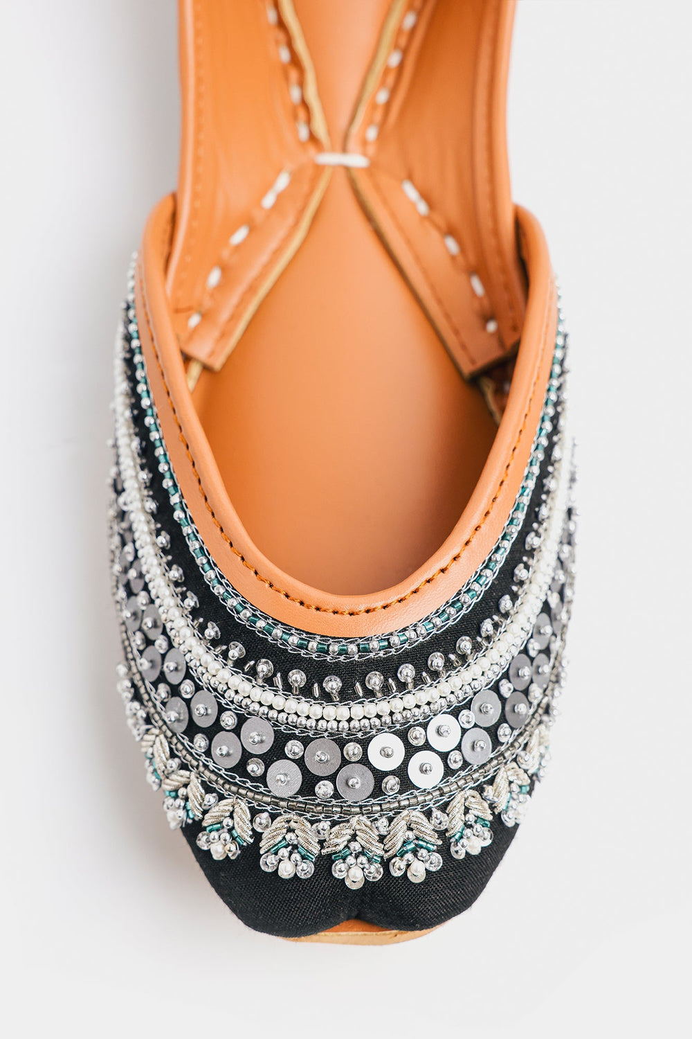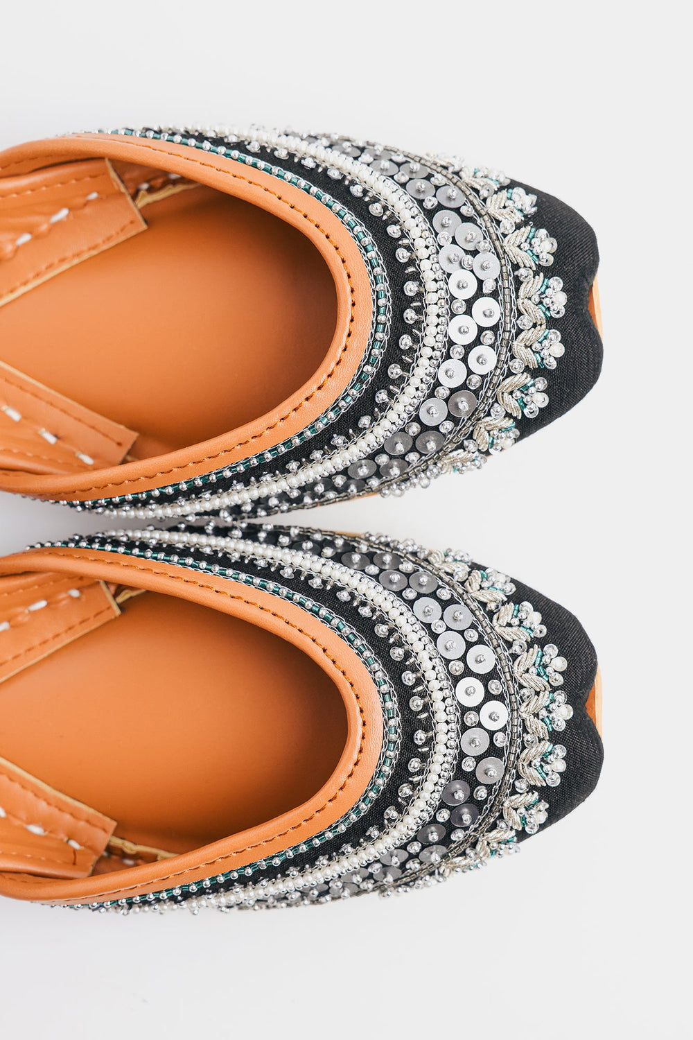 Unveil sophisticated drama with these stunning handcrafted Khussas. The toe is grounded in a deep black fabric that provides a striking contrast to the elaborate embellishment. The design features breathtaking, intricate layers of beadwork and sequins, including shimmering silver sequins, white pearls, and small teal beads. The carefully constructed bands of embellishment create a rich, textured surface that captures light beautifully. Finished with the comfortable tan leather sole and lining, these Khussas are a luxurious statement piece that adds glamour and depth to any traditional or contemporary look.