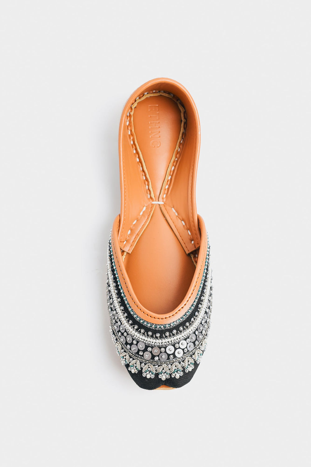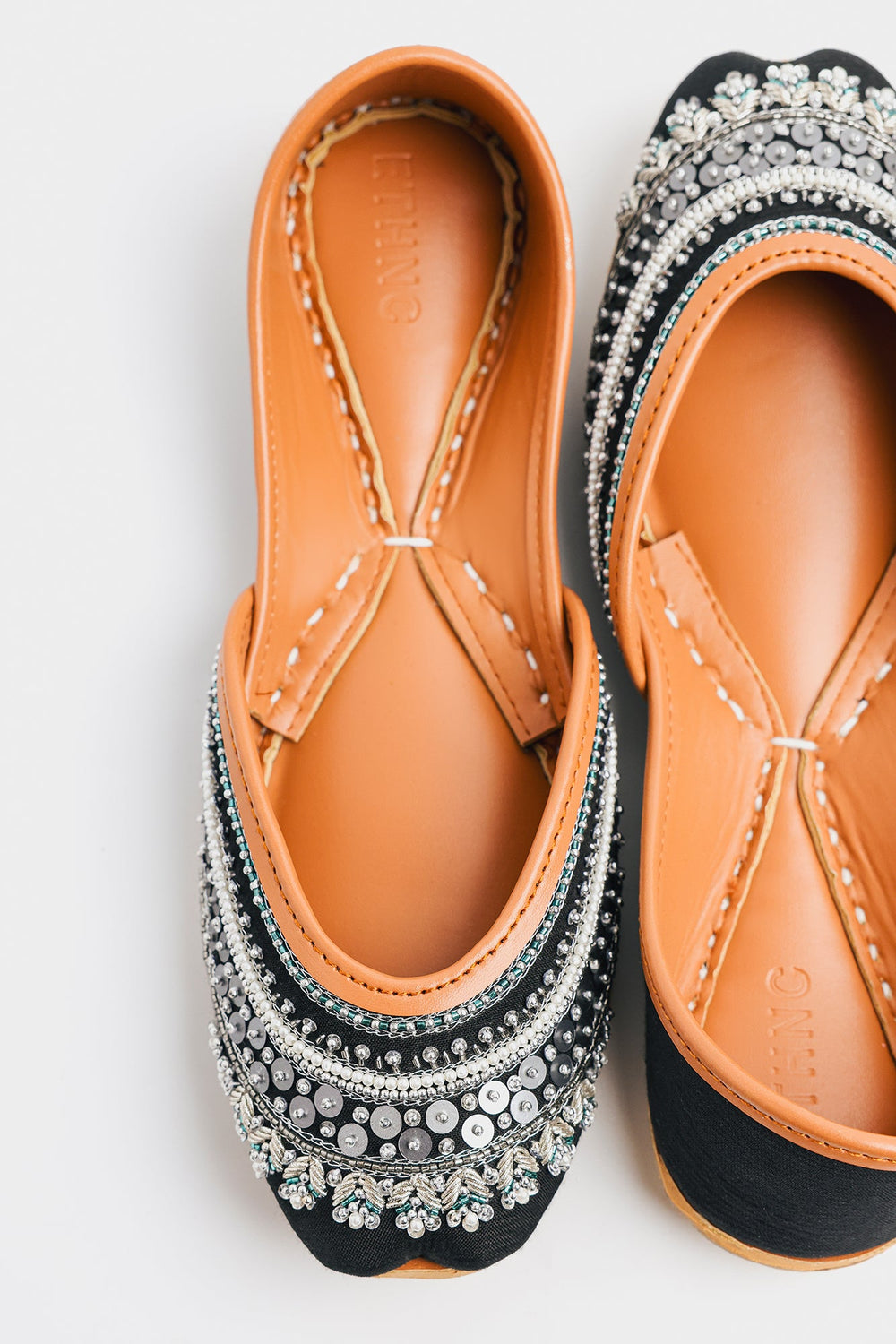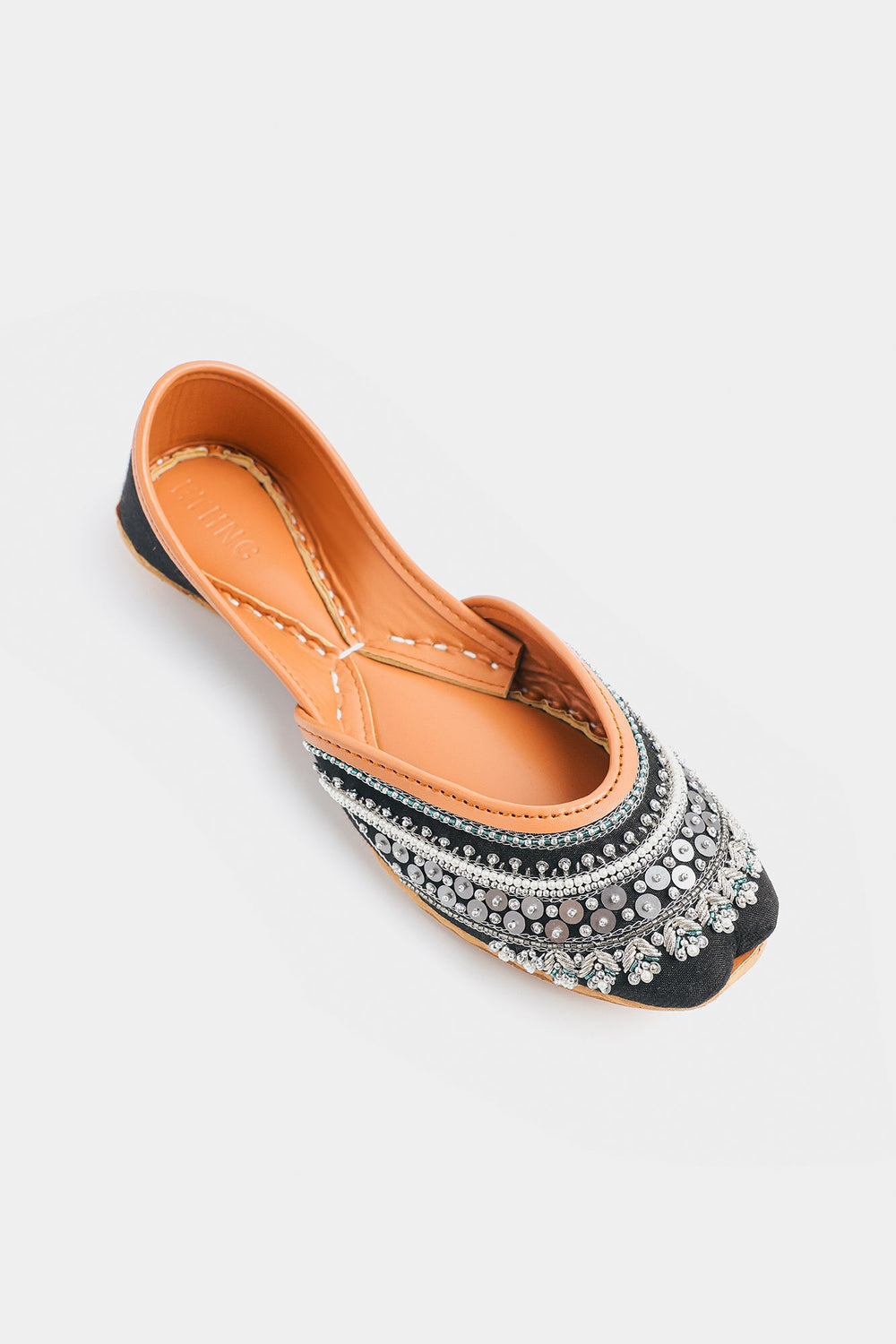 Unveil sophisticated drama with these stunning handcrafted Khussas. The toe is grounded in a deep black fabric that provides a striking contrast to the elaborate embellishment. The design features breathtaking, intricate layers of beadwork and sequins, including shimmering silver sequins, white pearls, and small teal beads. The carefully constructed bands of embellishment create a rich, textured surface that captures light beautifully. Finished with the comfortable tan leather sole and lining, these Khussas are a luxurious statement piece that adds glamour and depth to any traditional or contemporary look.