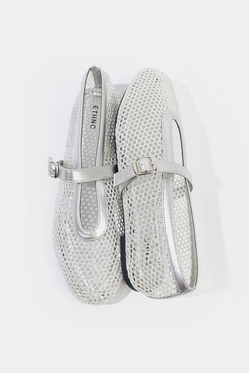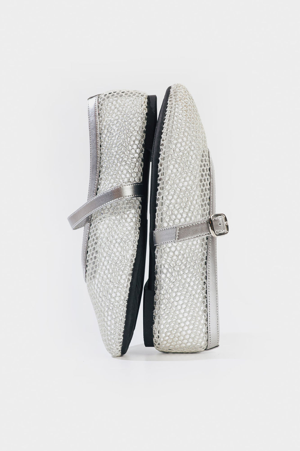 Step into charming elegance with these silver mesh pumps. Featuring a delicate, breathable mesh design and a secure buckle strap, they offer a sophisticated and comfortable choice for any occasion.